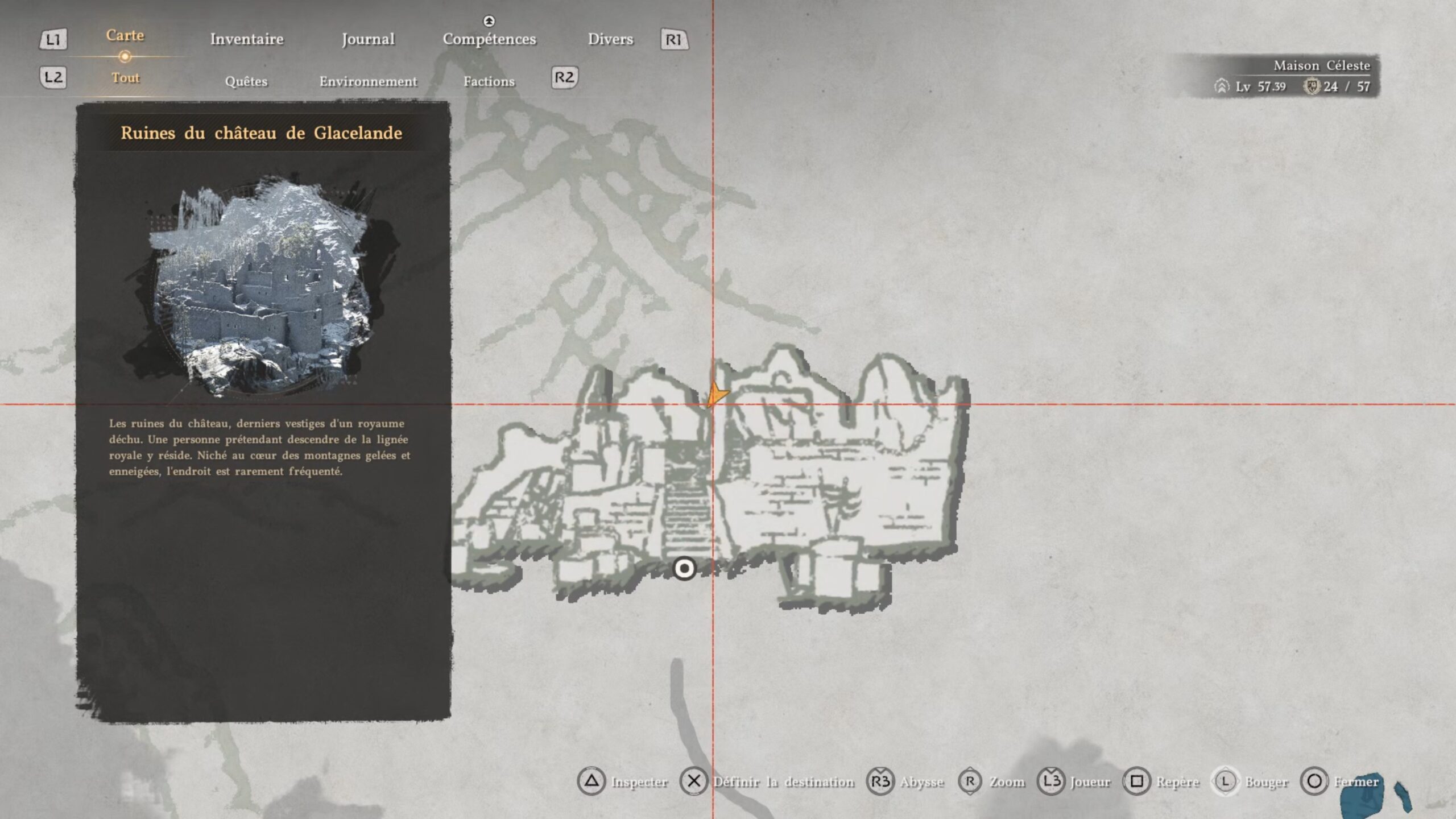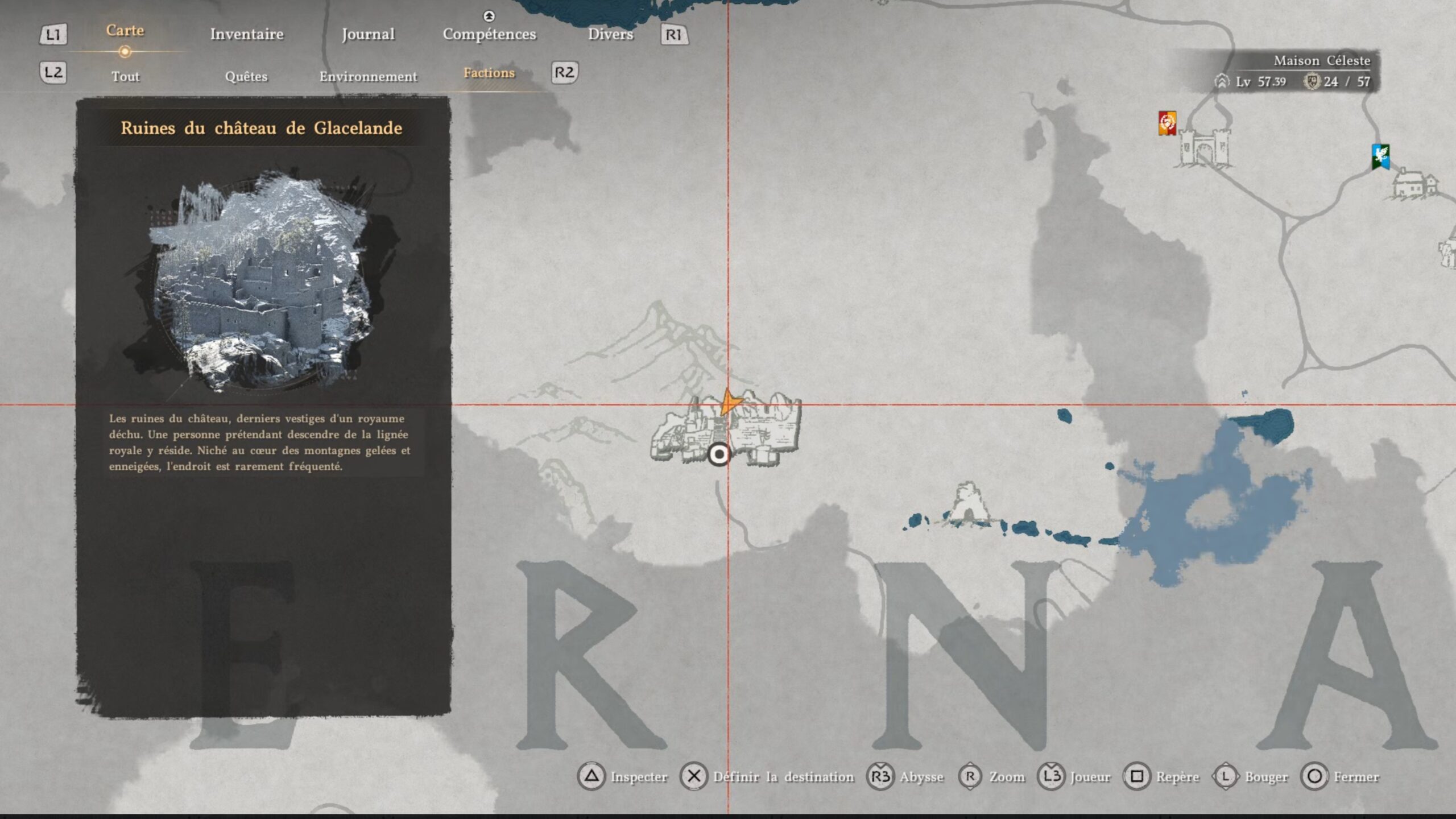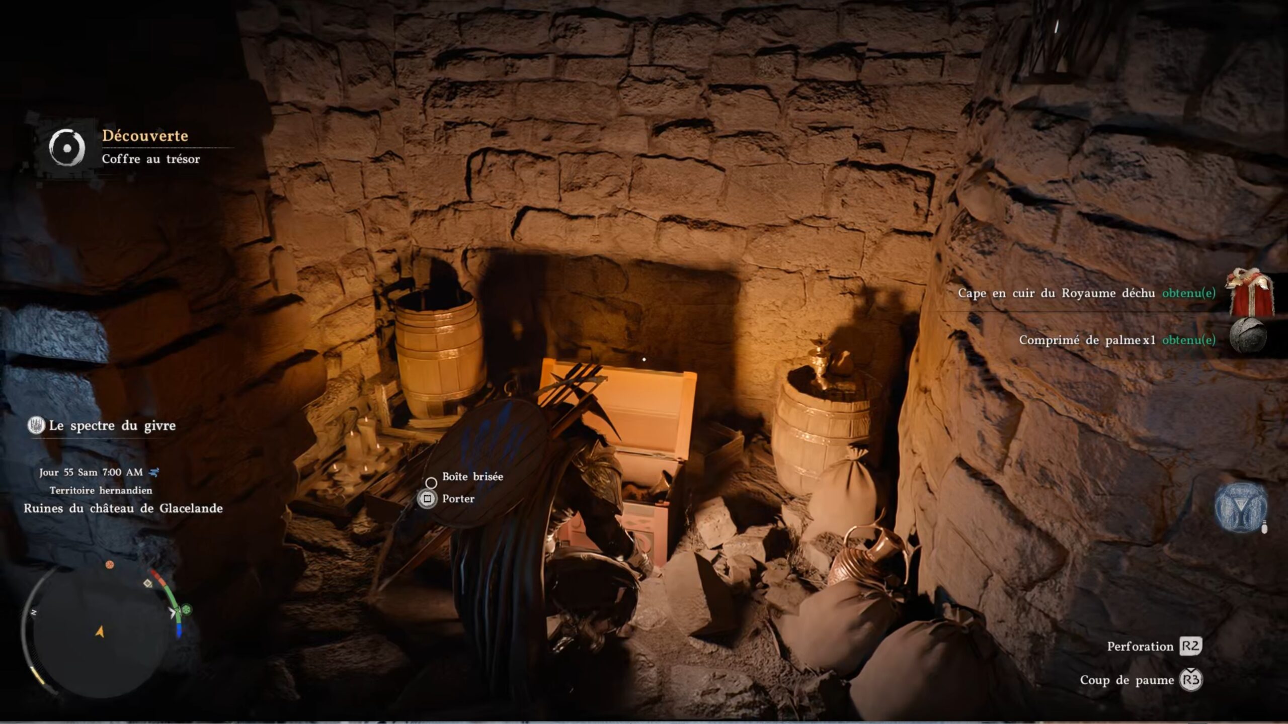 La cape en cuir du Royaume déchu se situe dans un coffre au nord des « Ruines du château de Glacelande », au centre de la région d’Hernand. L’emplacement se trouve au-dessus de la lettre « R » du nom de la région, à l’ouest de « Haunted Hill ». Dirigez-vous vers le centre-nord des ruines pour trouver un mur avec un trou. Accroupissez-vous pour vous y engager. Vous serez bloqué par des planches : utilisez le coup de paume pour libérer le passage et atteindre le coffre contenant l’équipement.