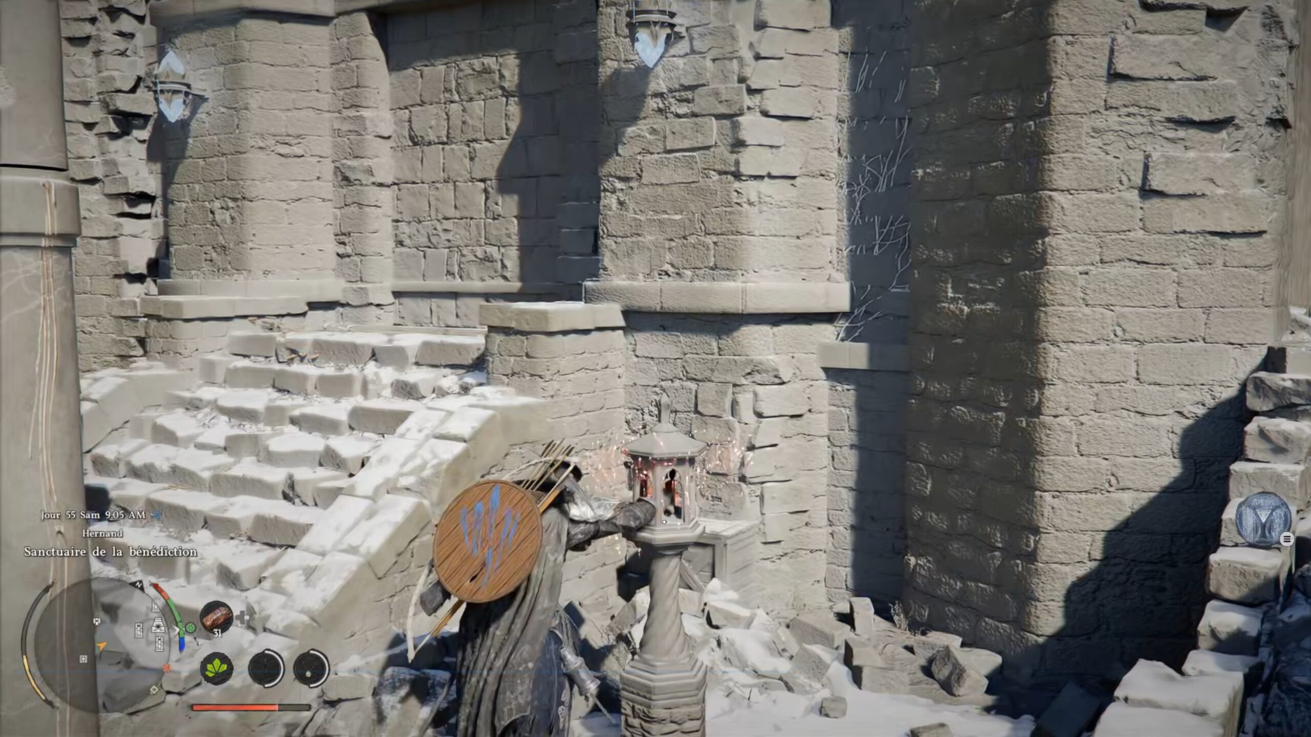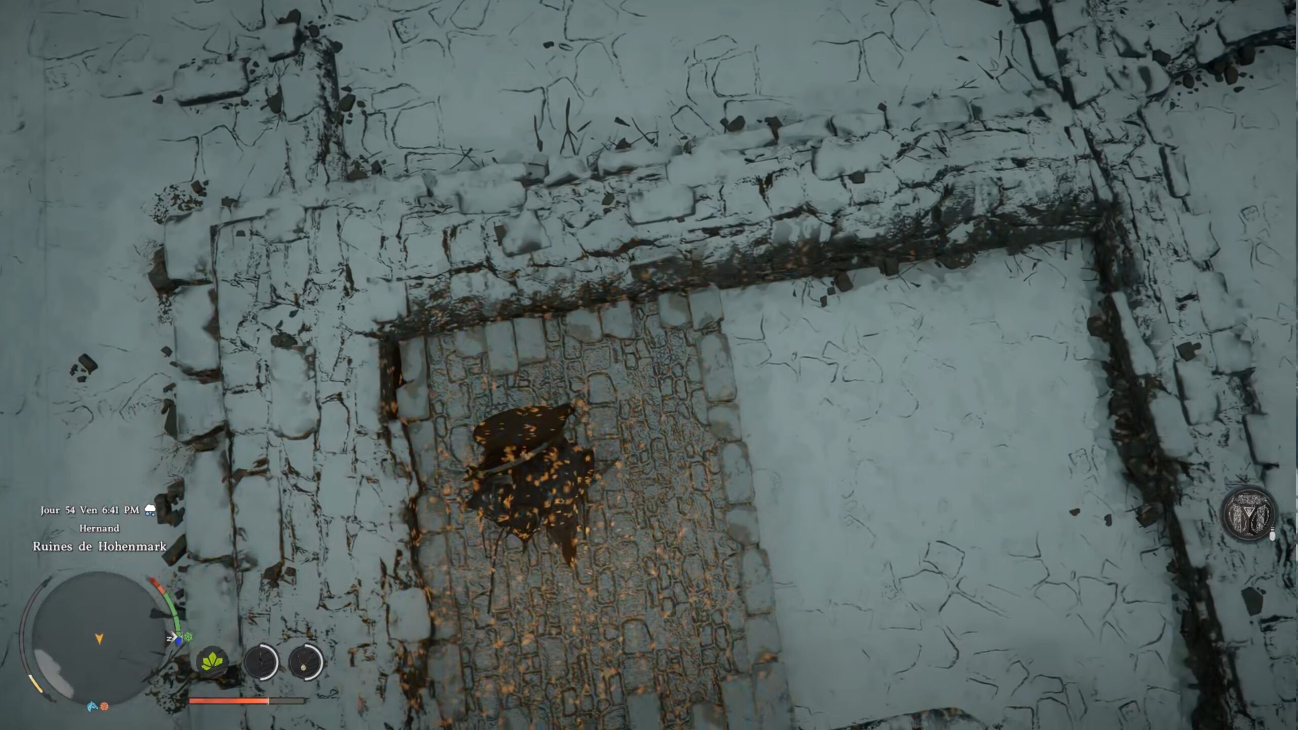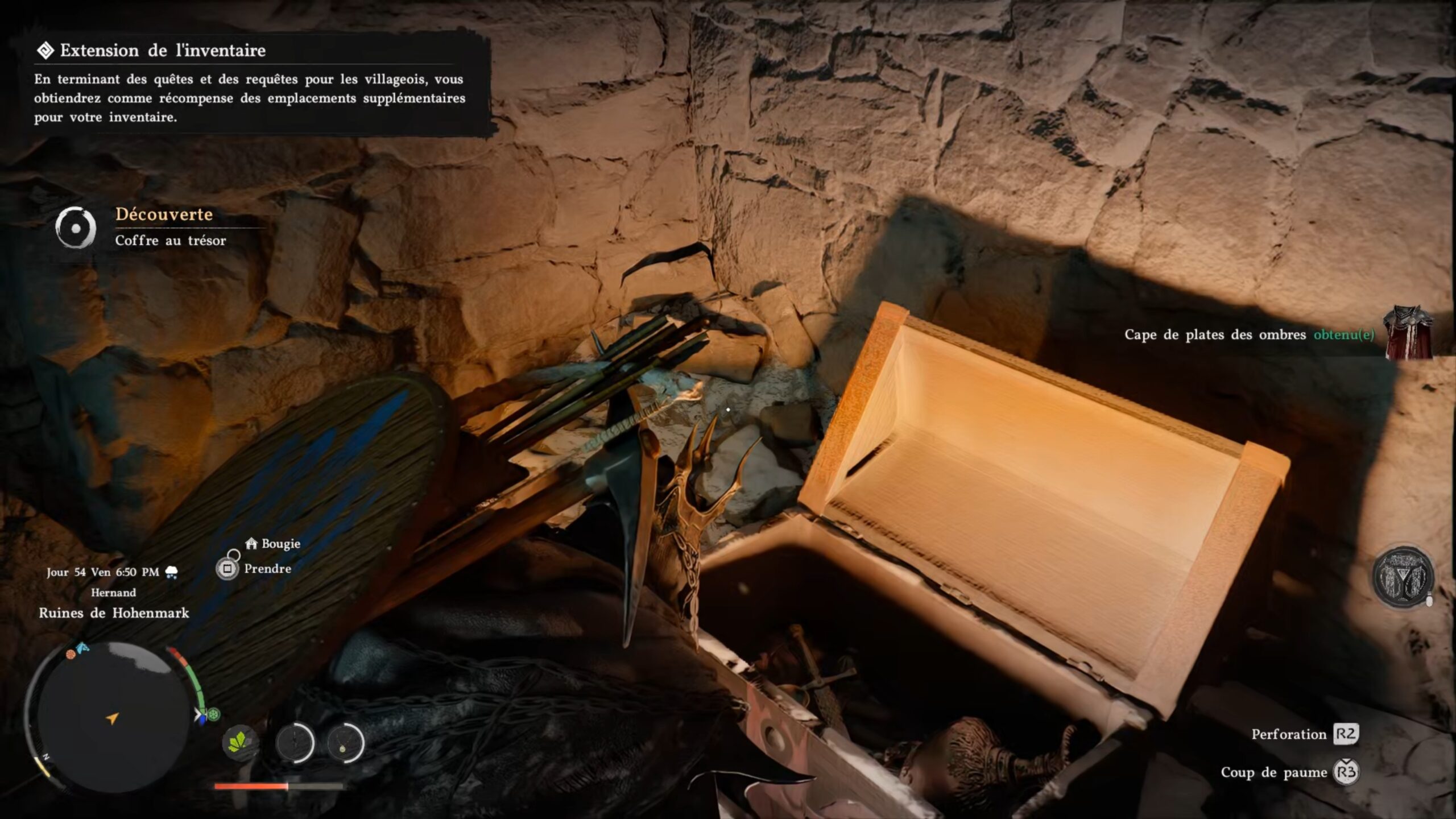 La cape de plates des Ombres se situe dans un coffre au centre de la région « Hernand ». L’emplacement se trouve au-dessus de la lettre « H » du nom de la région, au niveau des « Ruines de Hohenmark ». Dirigez-vous vers l’ouest des ruines, en direction du bâtiment le plus élevé et le mieux conservé de la zone. Sur son toit, vous trouverez une dalle au sol à l’aspect distinct, composée de briques. Accroupissez-vous, puis utilisez le coup de paume pour la briser. Il ne vous reste plus qu’à récupérer le coffre situé au fond des ruines.