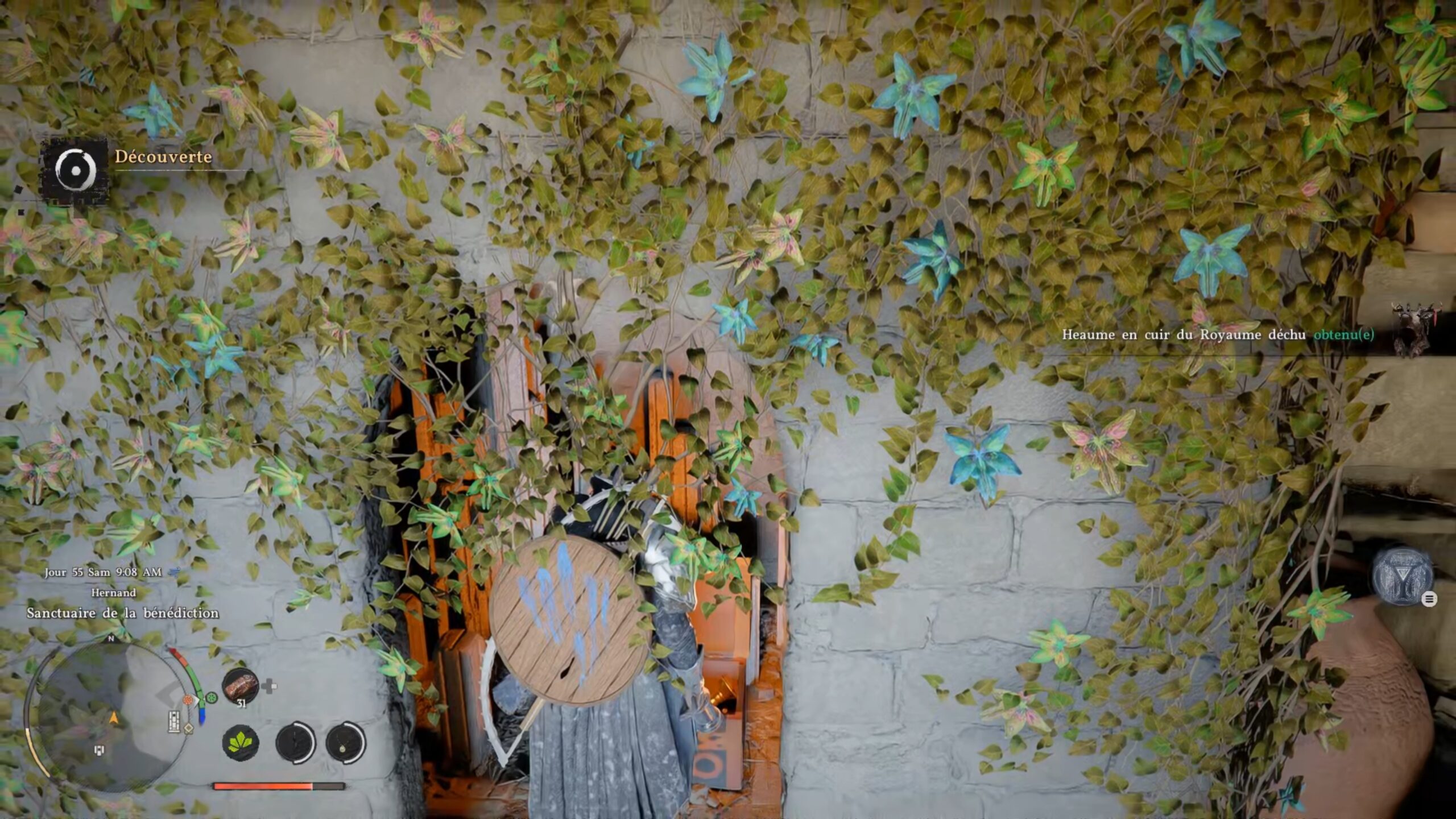 Le heaume en cuir du Royaume déchu se situe dans un coffre à l’intérieur du « Sanctuaire de la bénédiction », au sud-ouest de la région d’Hernand. L’emplacement se trouve sous la lettre « E » du nom de la région, au sud-ouest de « Haunted Hill ». Une fois à l’intérieur du sanctuaire, éliminez les ennemis puis dirigez-vous vers le sud pour atteindre deux piliers avec un escalier menant à un mur. Pour ouvrir un passage dans ce mur, allumez la lampe située sur le côté droit de l’escalier. Une fois le passage ouvert, entrez à l’intérieur pour récupérer l’équipement.