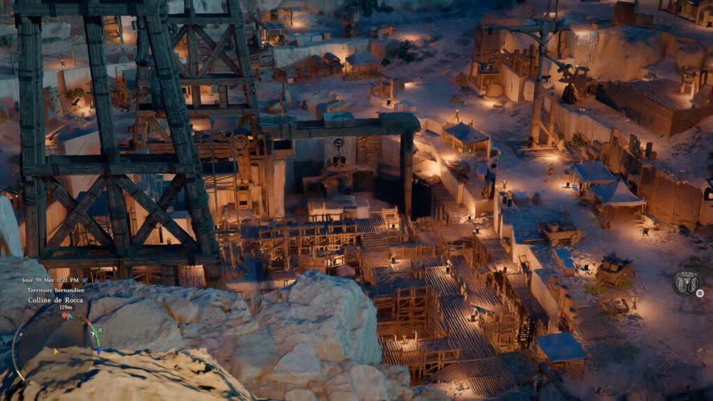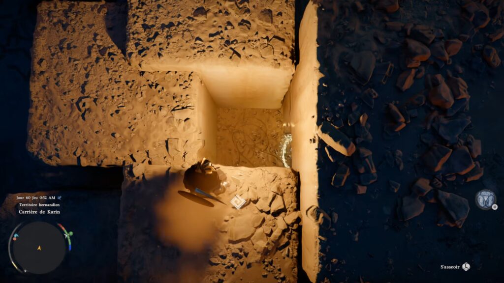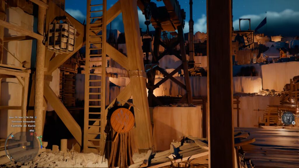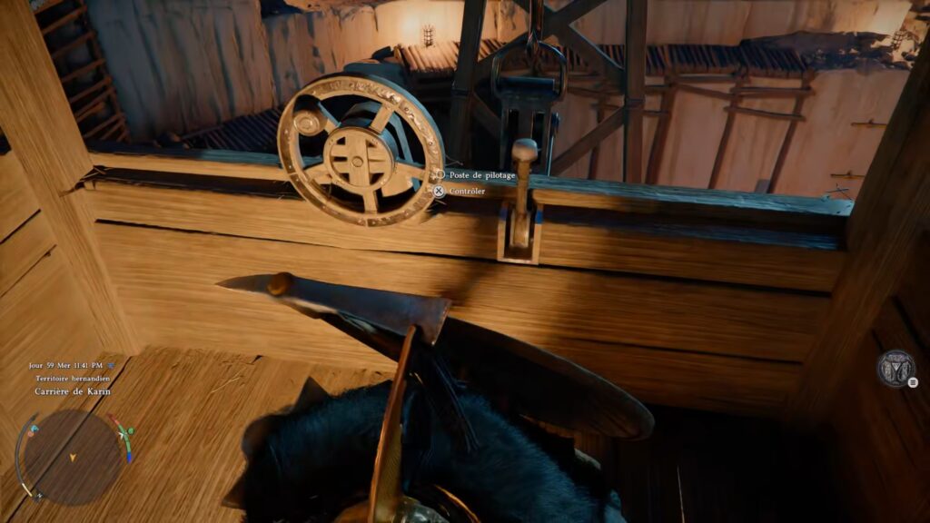 Dans la carrière, rendez-vous dans la tour de contrôle de la grue. Vous trouverez une échelle en bas à gauche de la grue pour monter dans la tour. Une fois aux commandes, déplacez le petit bloc de pierre au centre grâce à la grue. Une fois le bloc déplacé, descendez dans le trou créé afin d’obtenir le coffre contenant le masque.