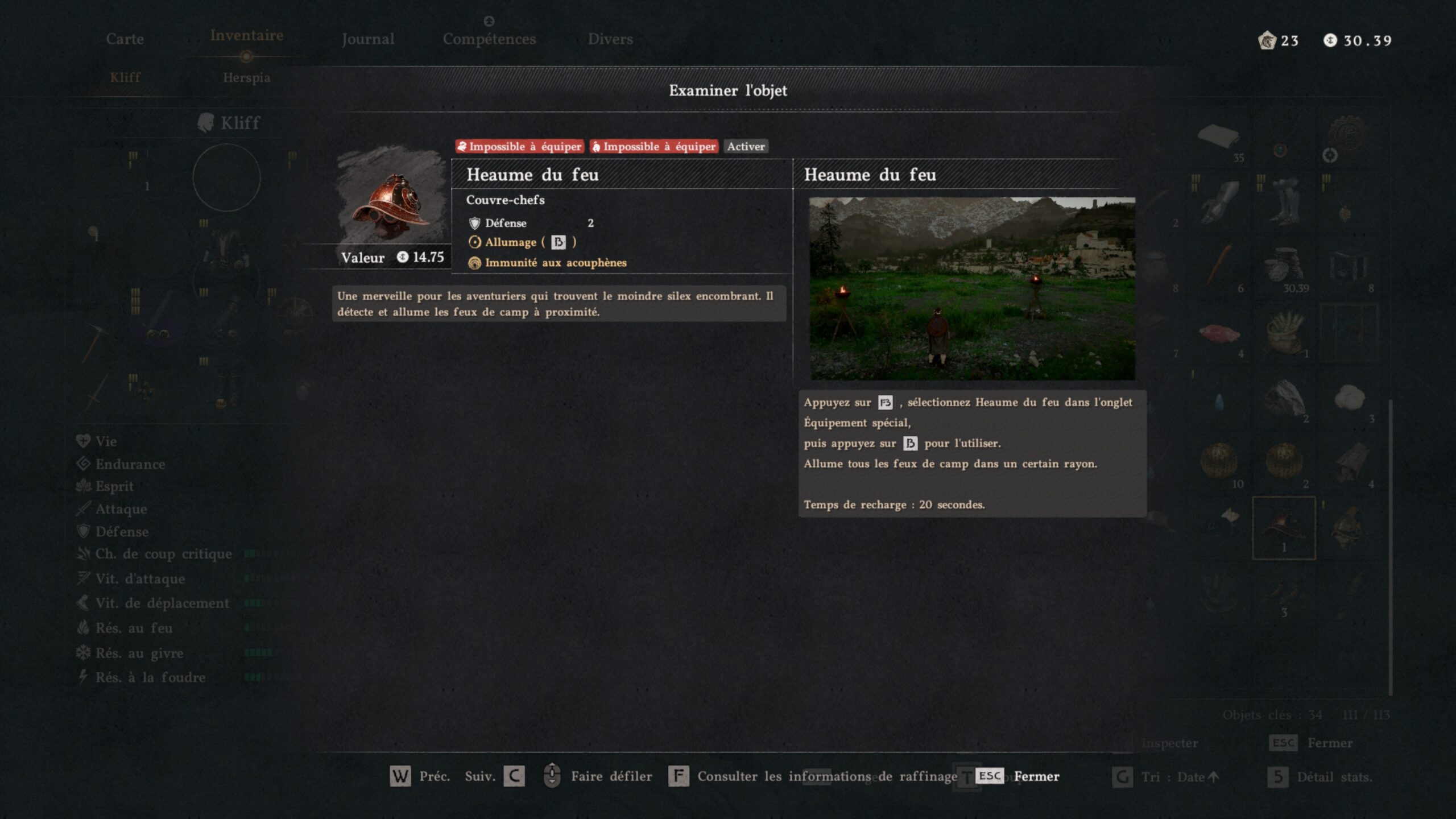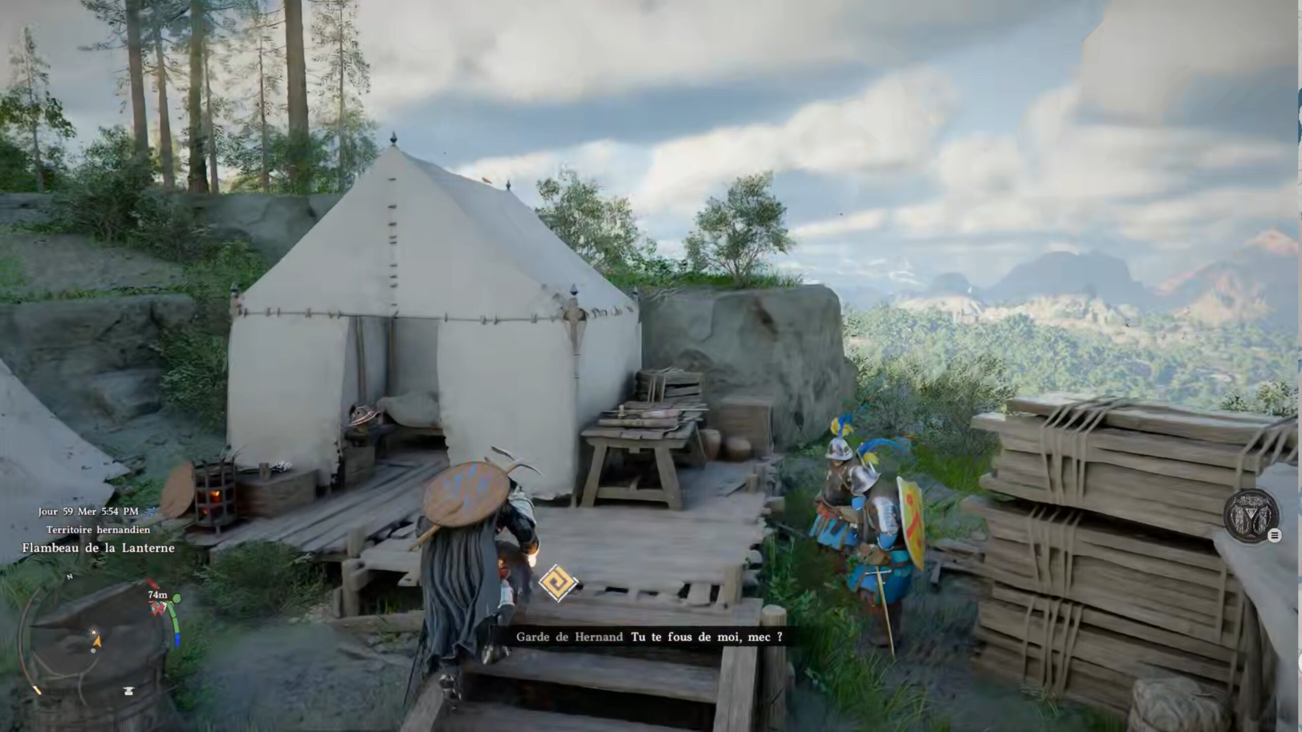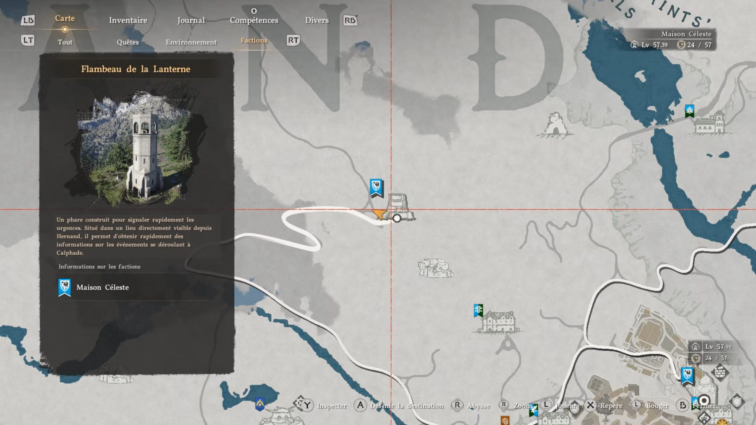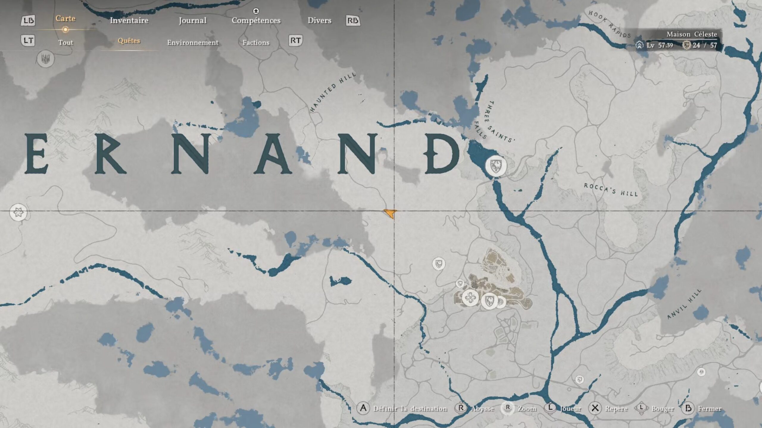 Le heaume du feu est positionné dans la plus grande tente du camp du « Flambeau de la Lanterne ». Le camp est situé au nord-ouest de la ville de « Hernand », directement sous la lettre « N » du nom de la région sur la carte.