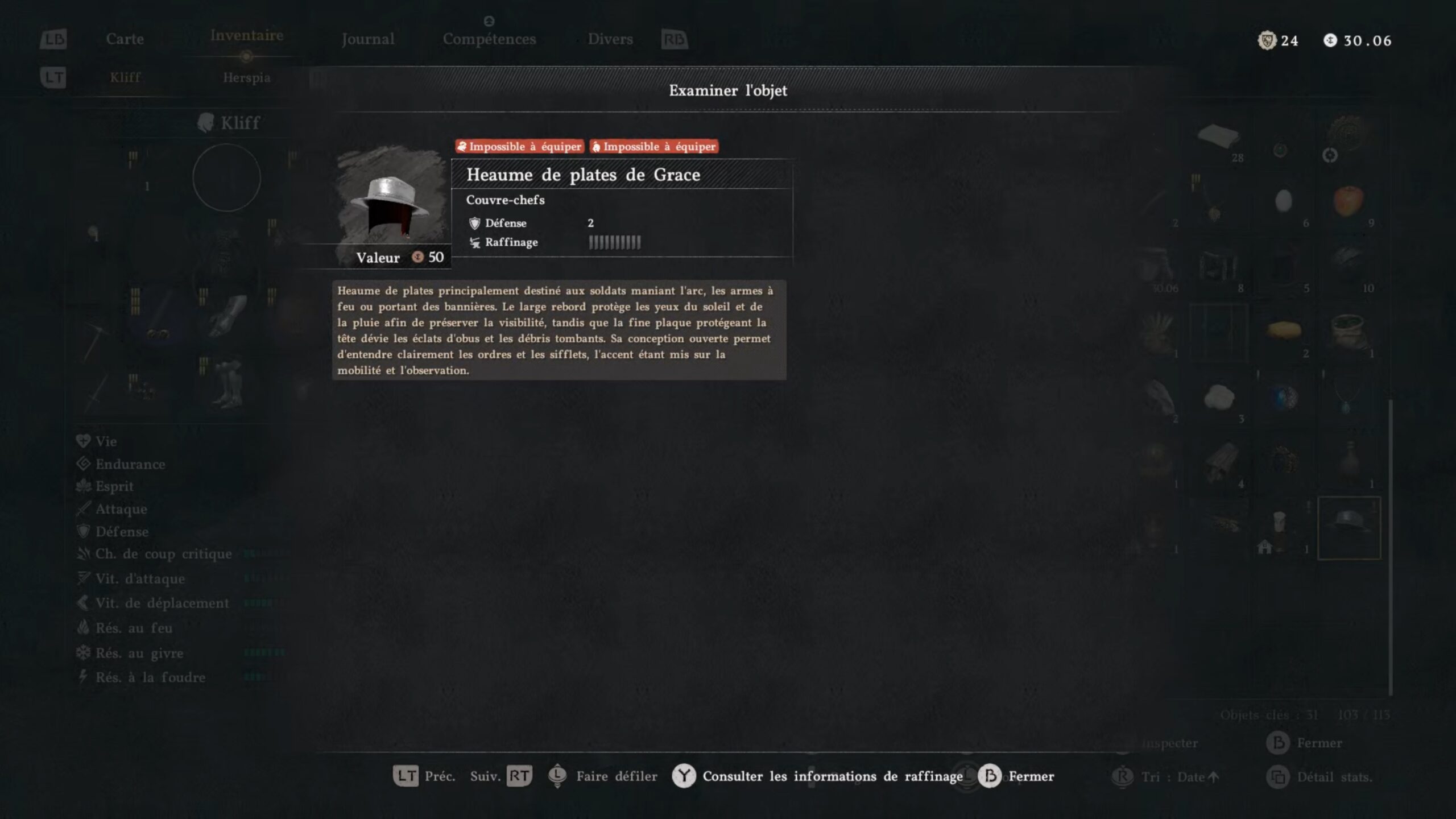 Le heaume de plates de Grâce se situe dans les égouts de la ville de « Hernand ». L’entrée des égouts se trouve au centre de la ville, via une trappe noire au sol à proximité du forgeron. Descendez dans les égouts, puis dirigez-vous sur la gauche pour trouver le coffre.