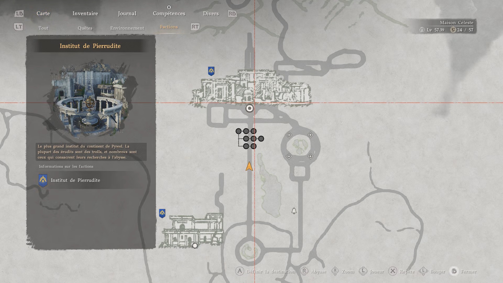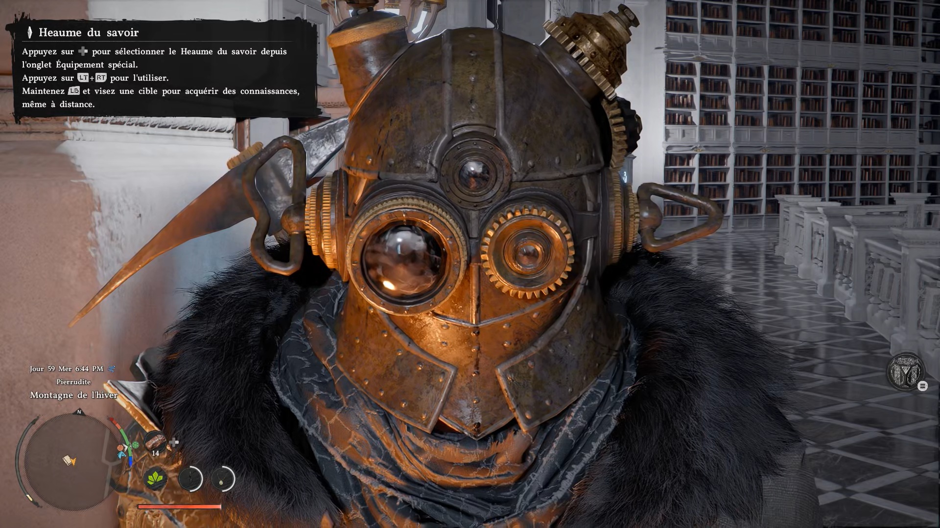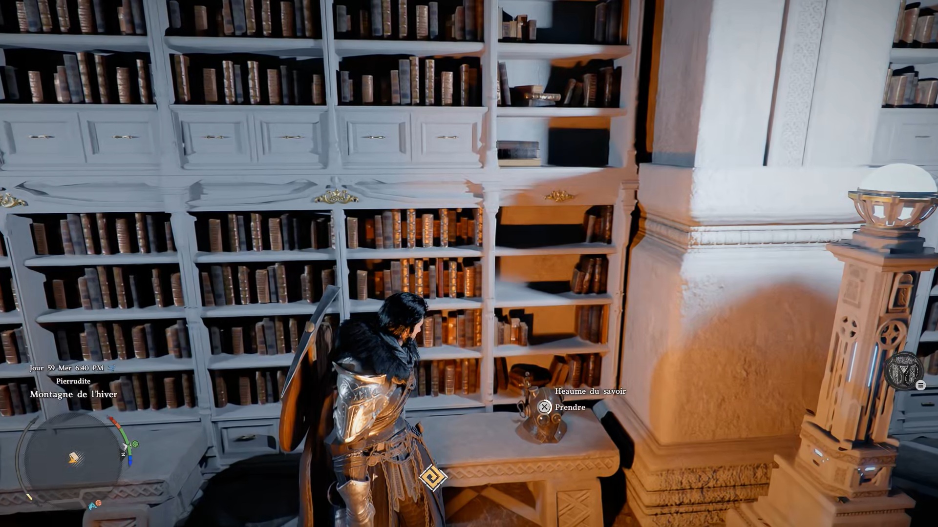 Le heaume du savoir se situe dans l’Institut de Pierrudite, au sud-ouest de la carte, au sud de la région « Hernand ». Entrez dans l’institut, puis dirigez-vous au fond de la salle vers une grande porte ornée de quatre losanges. Passez la porte, avancez jusqu’au bout de la bibliothèque et empruntez l’escalier de gauche pour monter à l’étage. Dirigez-vous ensuite vers le fond à droite pour trouver le heaume posé sur un banc.