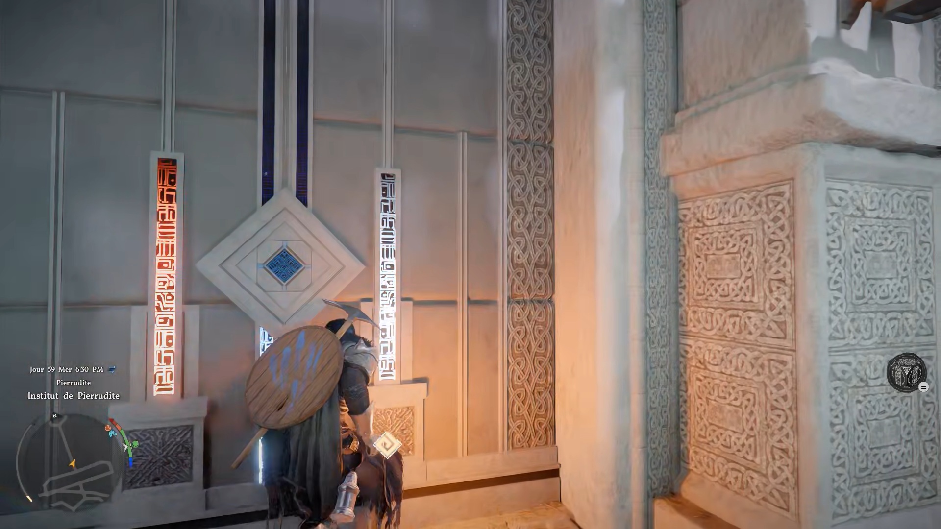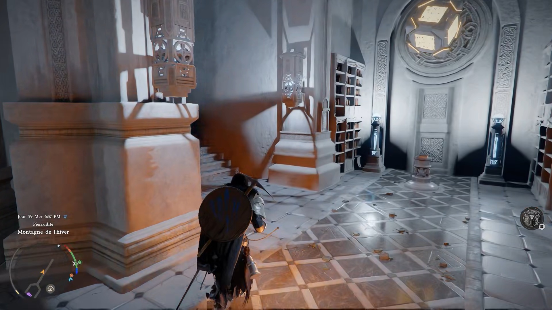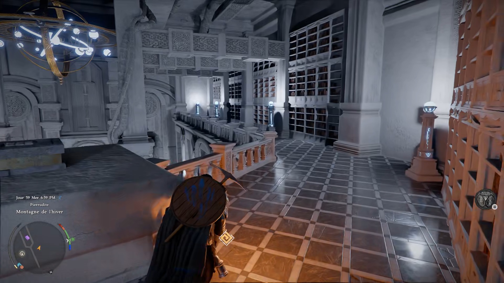 Le heaume du savoir se situe dans l’Institut de Pierrudite, au sud-ouest de la carte, au sud de la région « Hernand ». Entrez dans l’institut, puis dirigez-vous au fond de la salle vers une grande porte ornée de quatre losanges. Passez la porte, avancez jusqu’au bout de la bibliothèque et empruntez l’escalier de gauche pour monter à l’étage. Dirigez-vous ensuite vers le fond à droite pour trouver le heaume posé sur un banc.