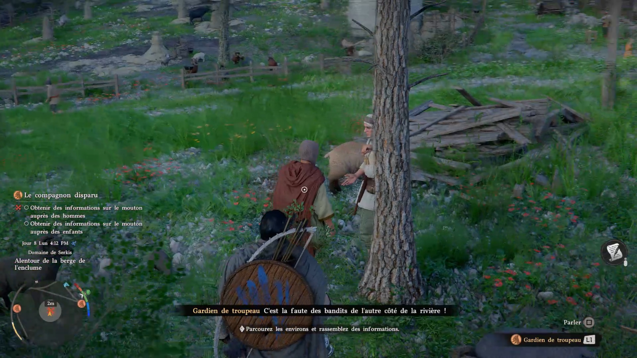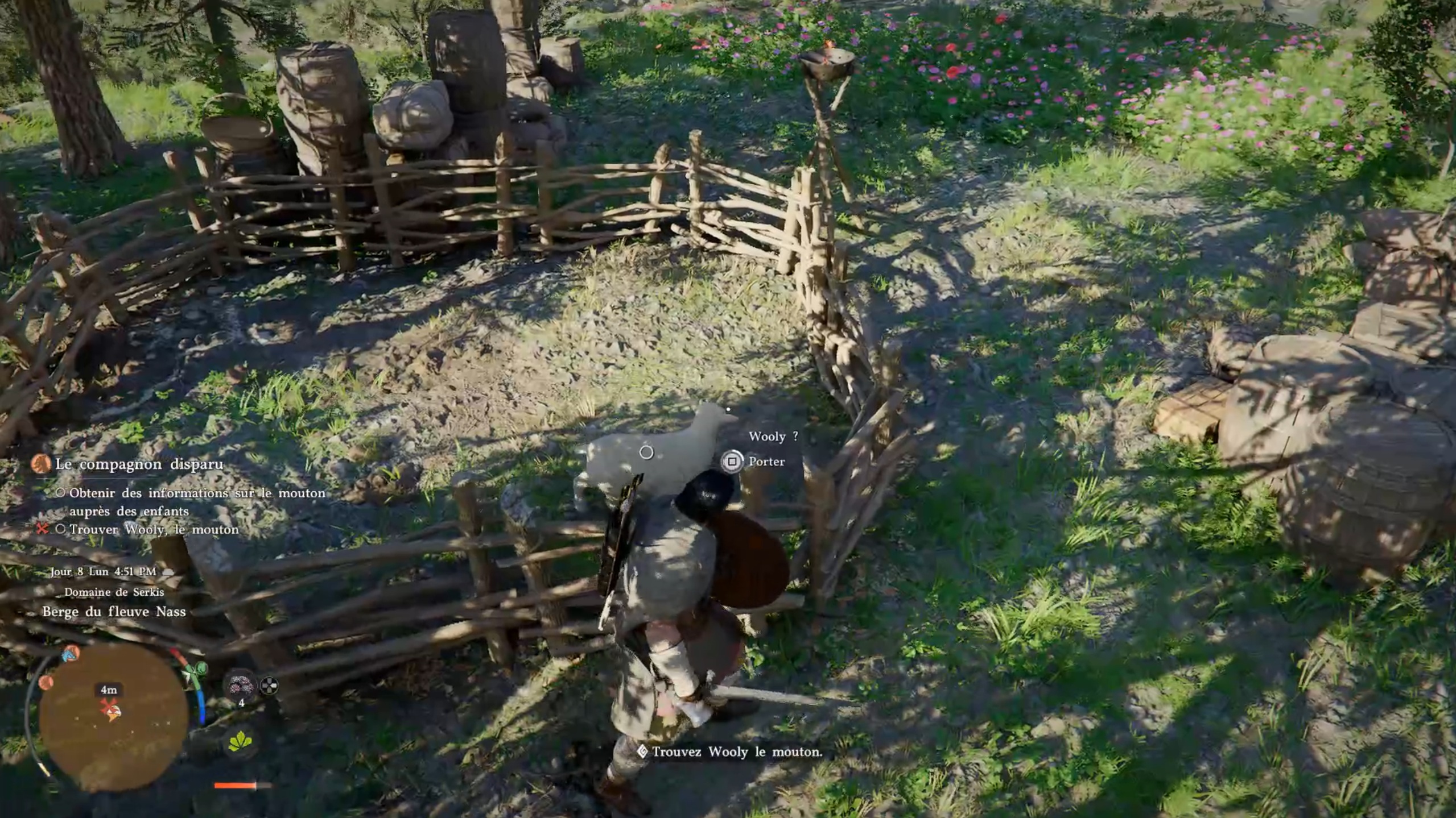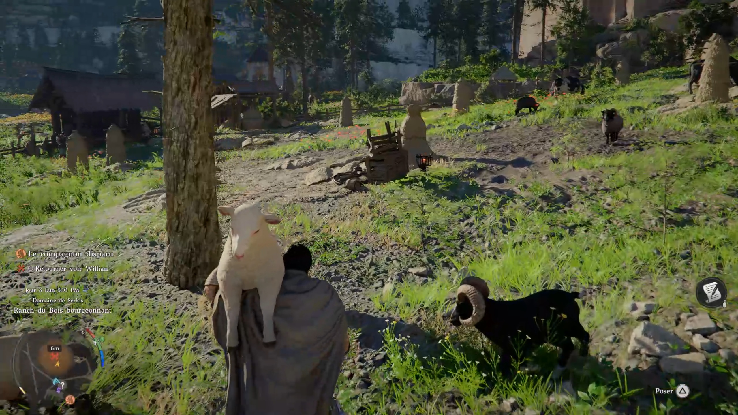 Rejoignez le marqueur pour rencontrer un enfant. Vous obtenez alors la mission de retrouver un mouton. Parlez aux témoins à proximité pour obtenir une zone à investiguer. Sur place, éliminez les menaces, puis interagissez avec le mouton dans l’enclos. Ramenez l’animal à l’enfant pour terminer la quête.