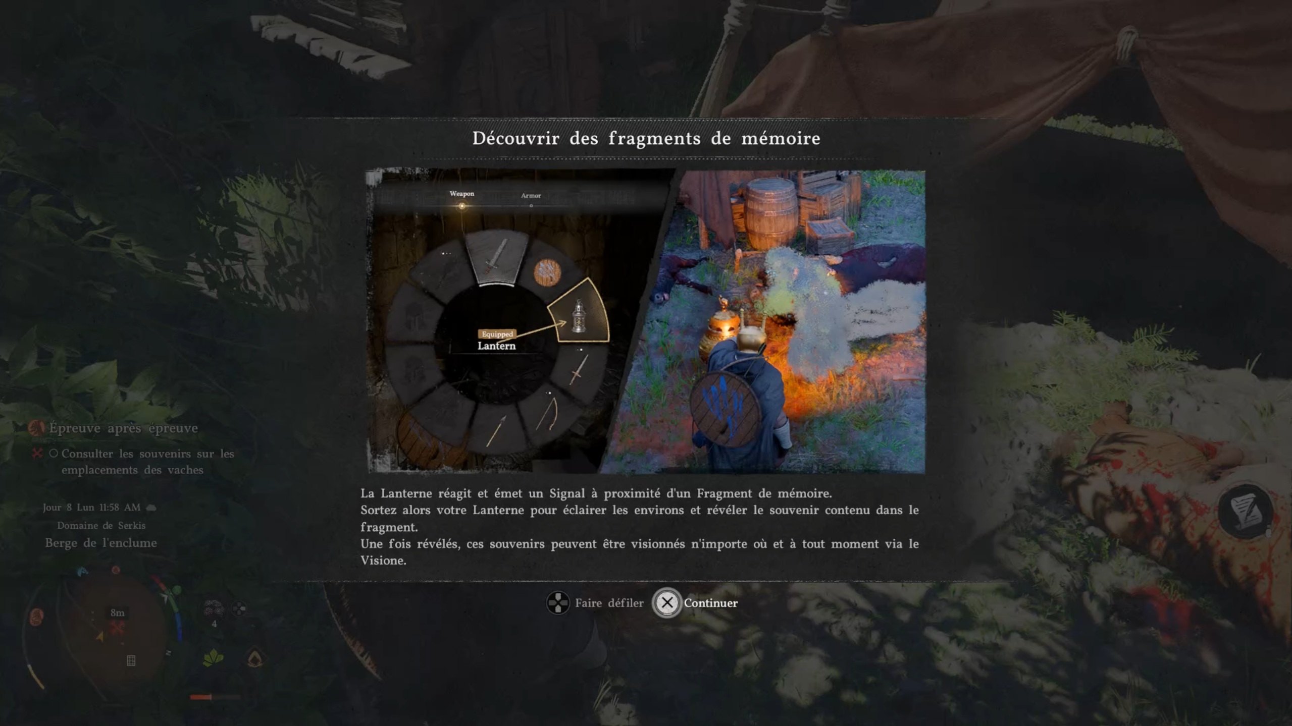 Suivez le marqueur sur votre carte pour obtenir la mission. Rejoignez ensuite la nouvelle destination afin d’éliminer les menaces sur place. Utilisez une nouvelle fois la lampe allumée pour révéler un souvenir. Une fois révélé, utilisez votre casque Visione pour le lire. Récupérez ensuite l’objet marqué sur votre carte, puis retournez voir l’homme pour terminer la quête.
