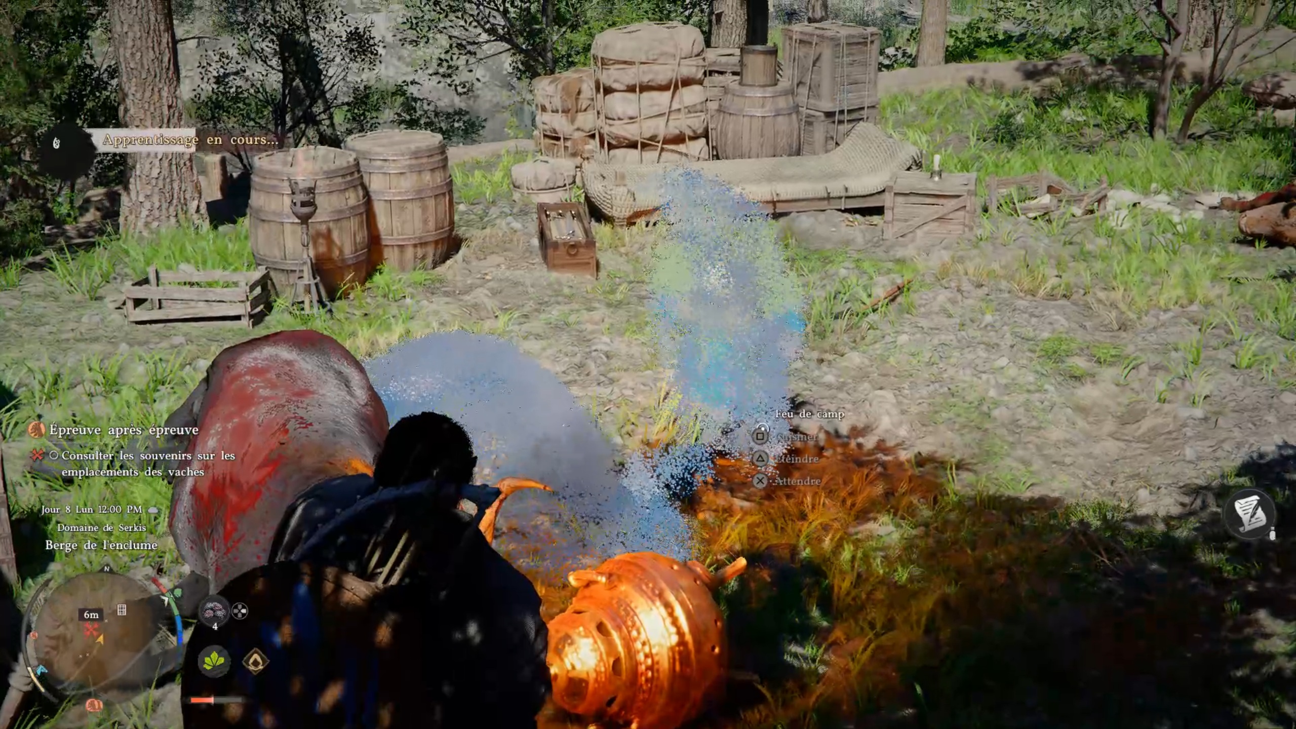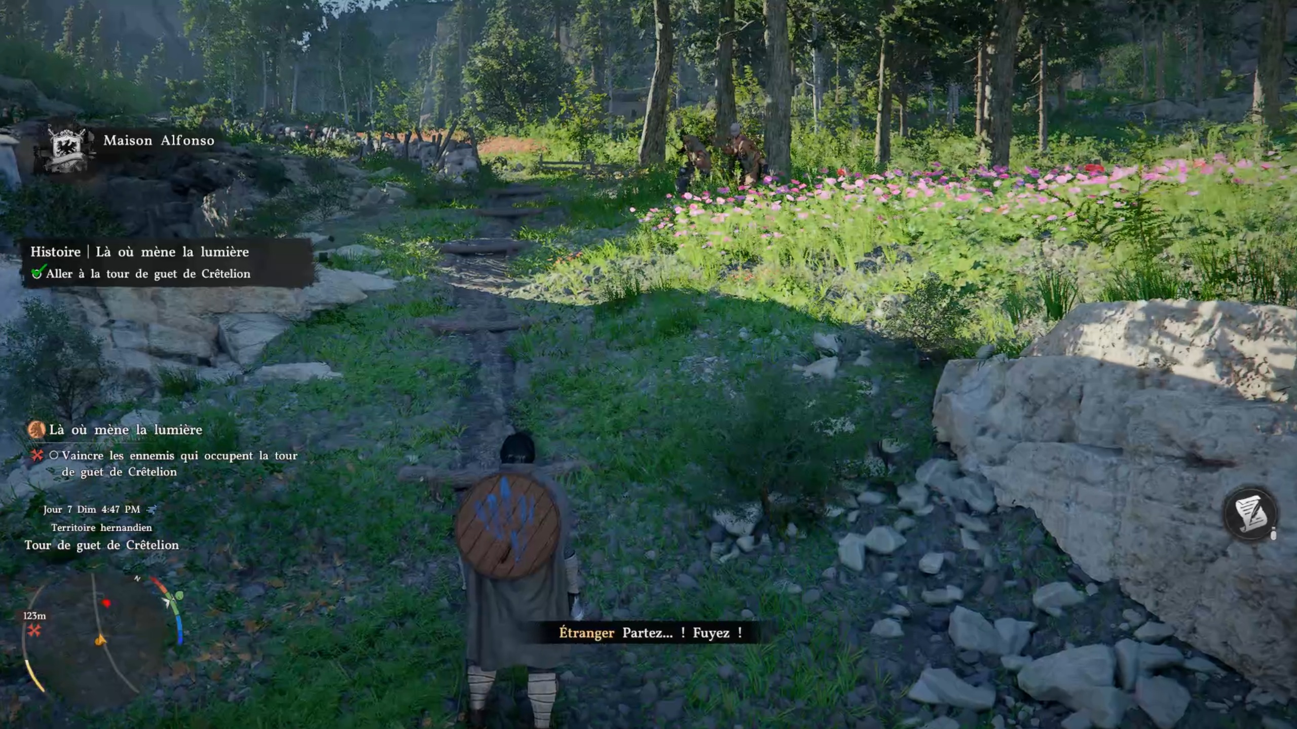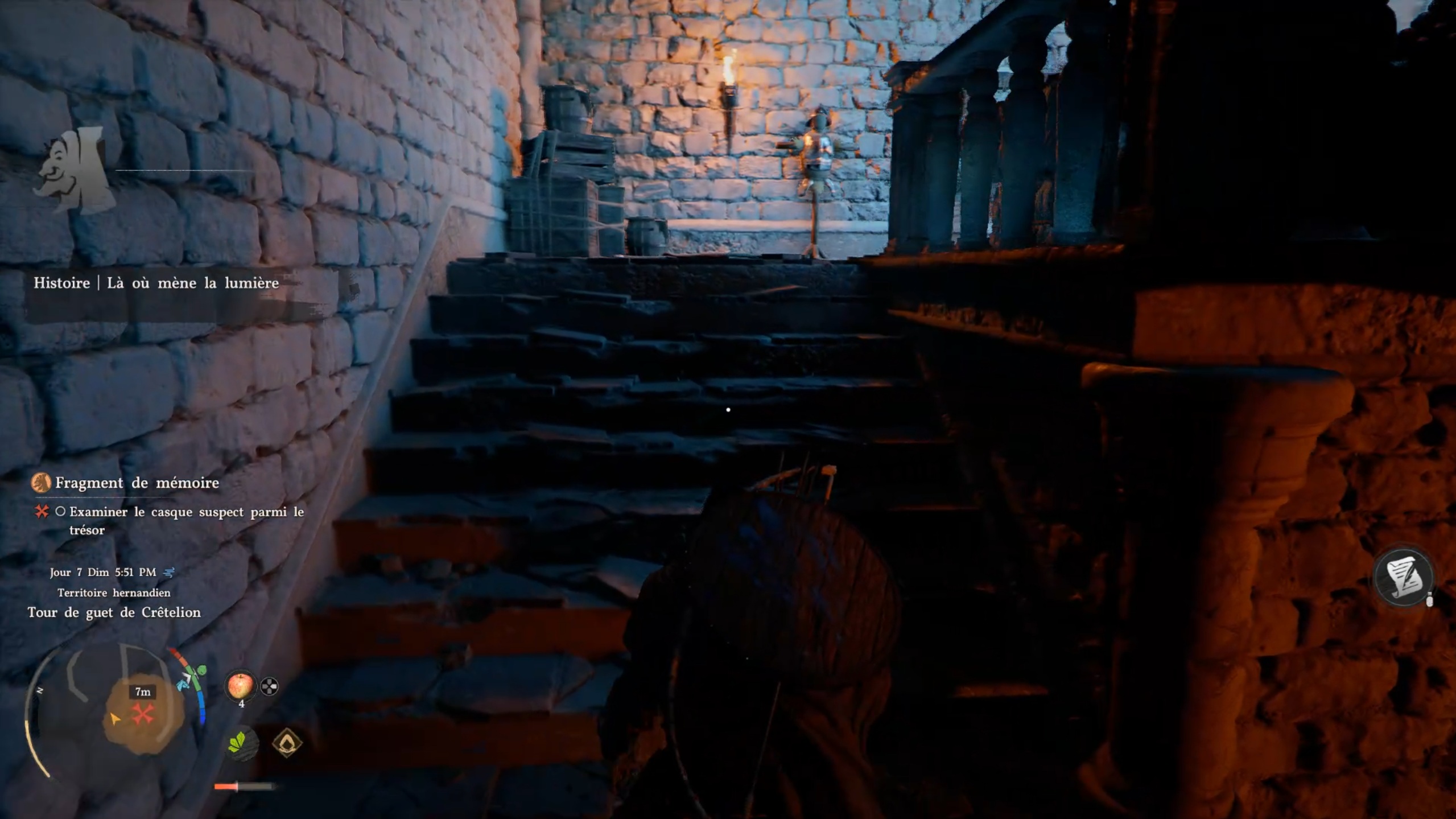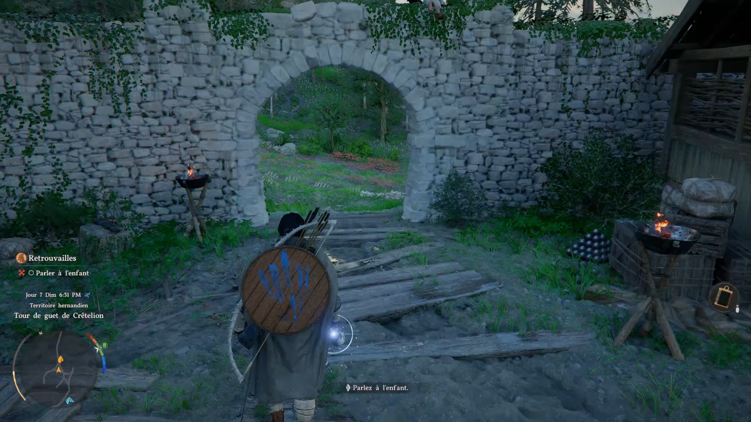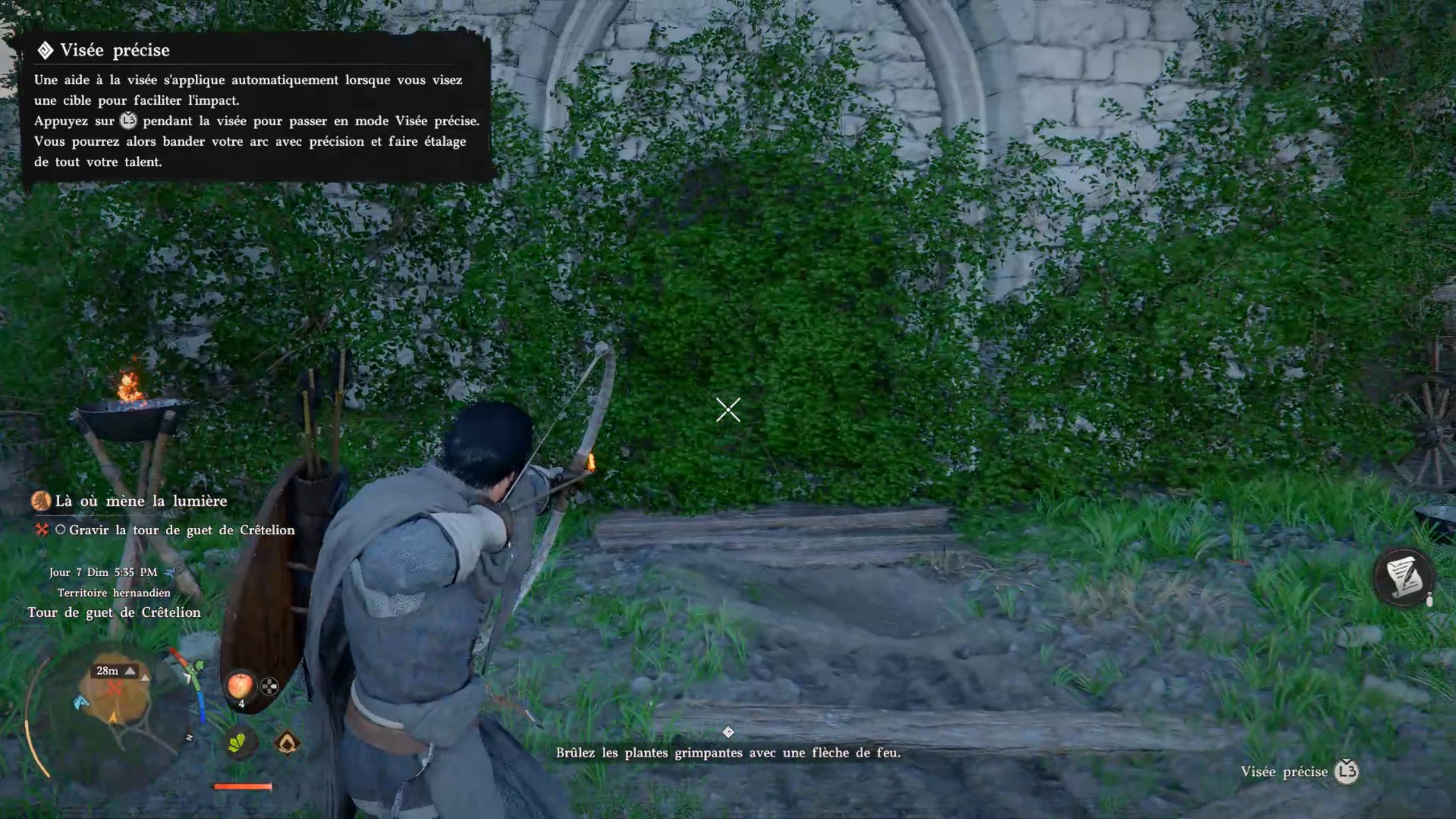 Suivez le marqueur sur votre carte pour rejoindre la tour Crêtelion. Une fois sur place, éliminez les menaces pour libérer la zone. Approchez ensuite de la tour afin de trouver une entrée cachée par la végétation. Utilisez votre arc pour enflammer une flèche grâce au brasier à proximité et libérer le passage. S’il n’y a plus de brasier, partez et revenez plus tard dans la journée pour le faire réapparaître. Une fois le chemin dégagé, montez les escaliers pour atteindre les hauteurs et terminer la quête.