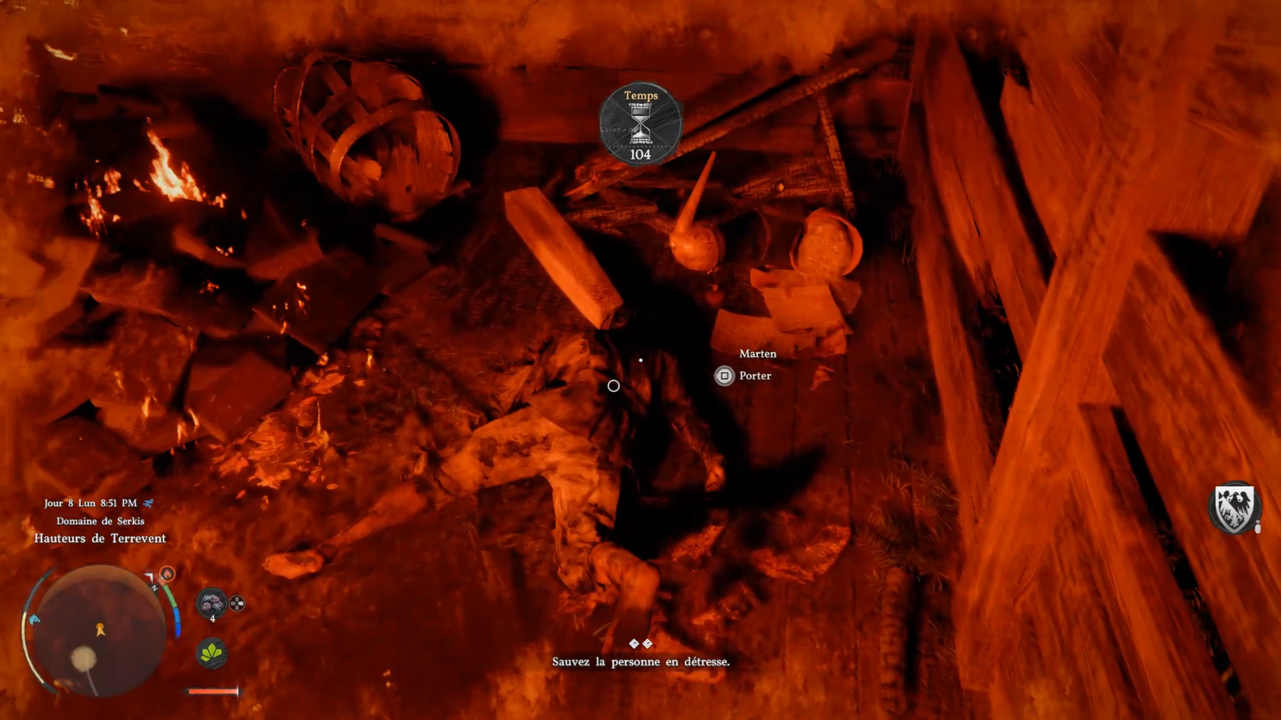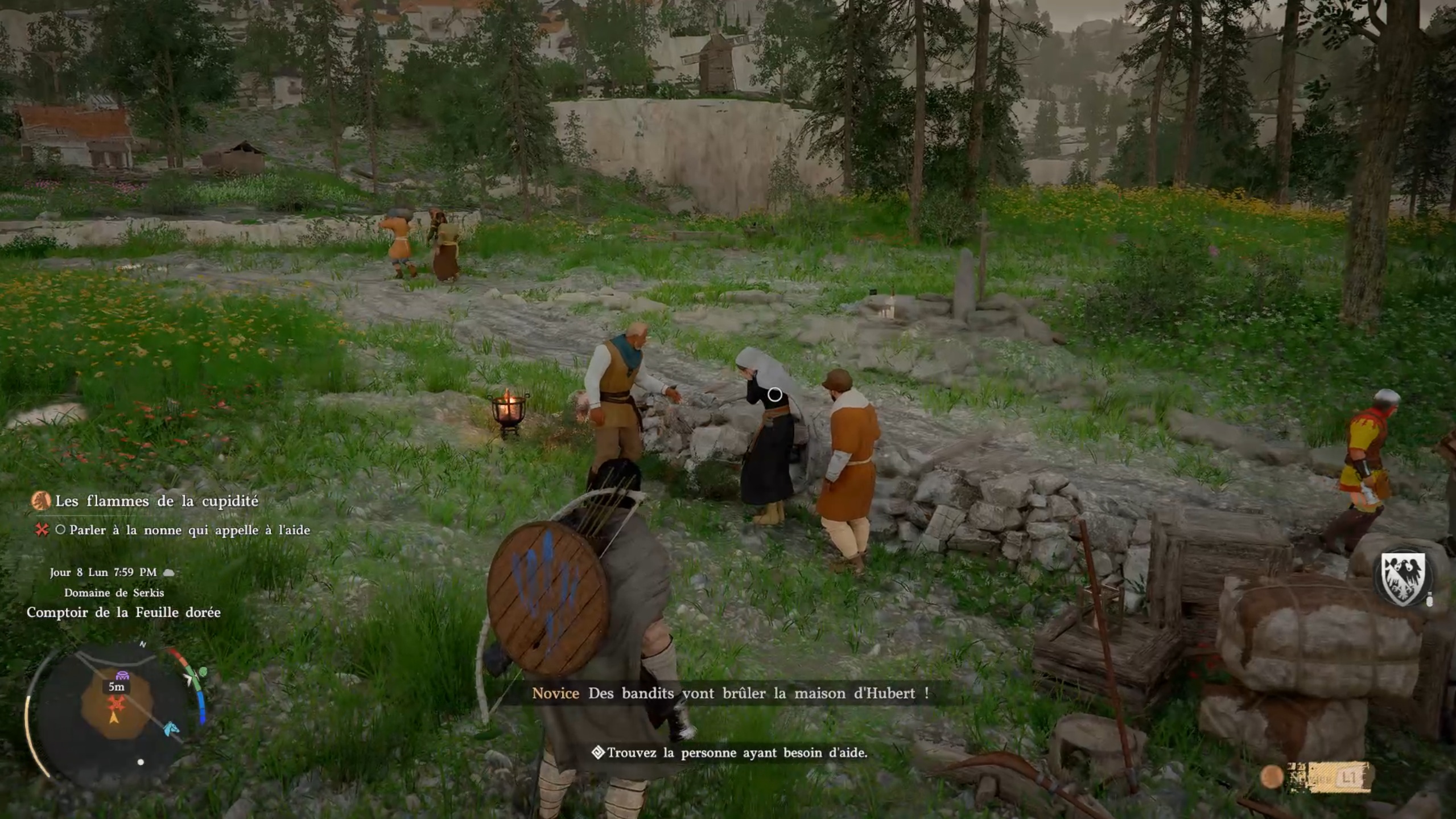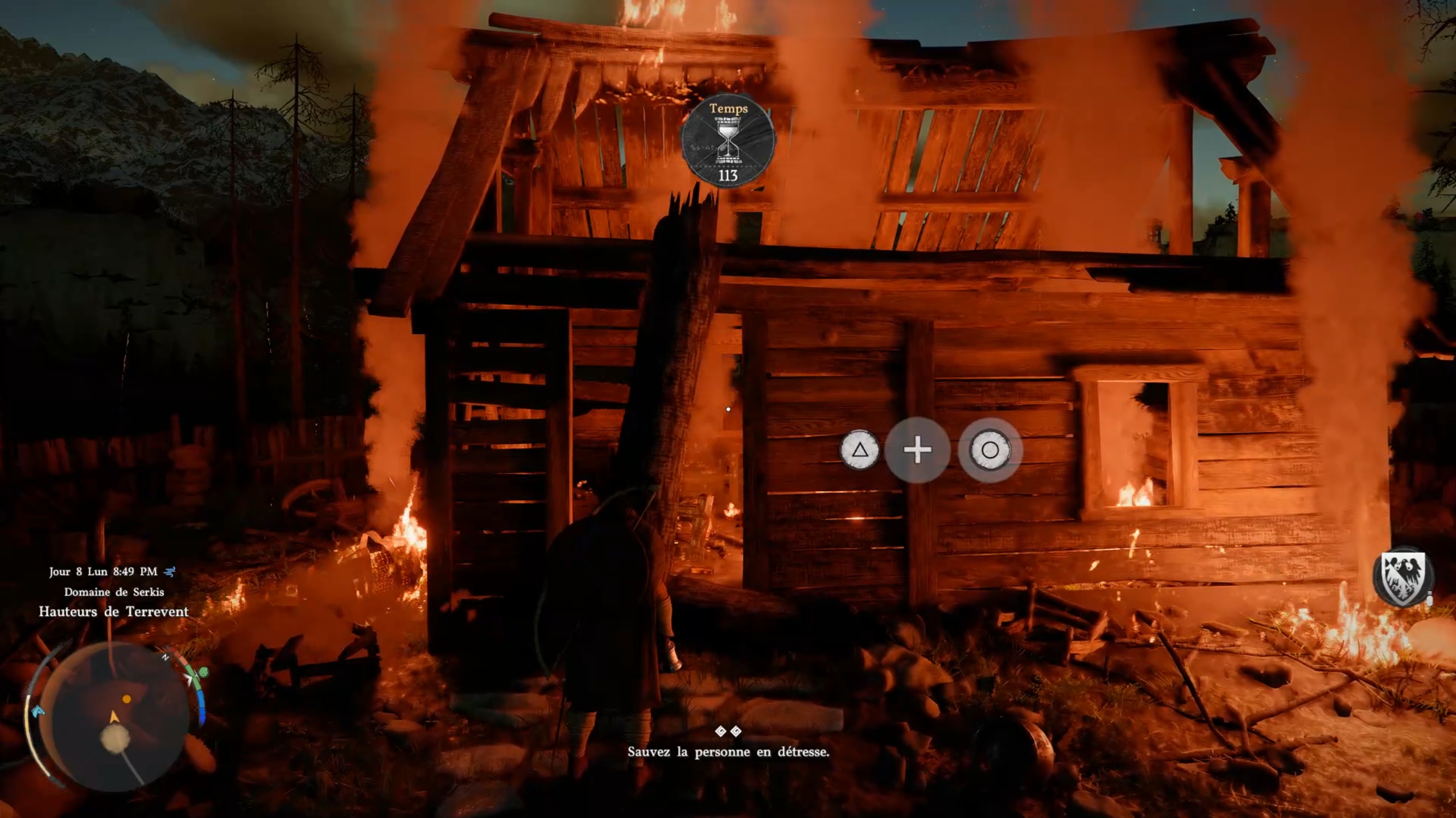 Juste à proximité, vous pourrez enchaîner un second dialogue avec une nonne marquée sur votre carte. Cette dernière vous indique une position à rejoindre. Sur place, rapprochez-vous du tronc d’arbre et exécutez les commandes à l’écran pour libérer un passage. Entrez dans le bâtiment en flammes pour récupérer le corps à l’intérieur et le sortir.