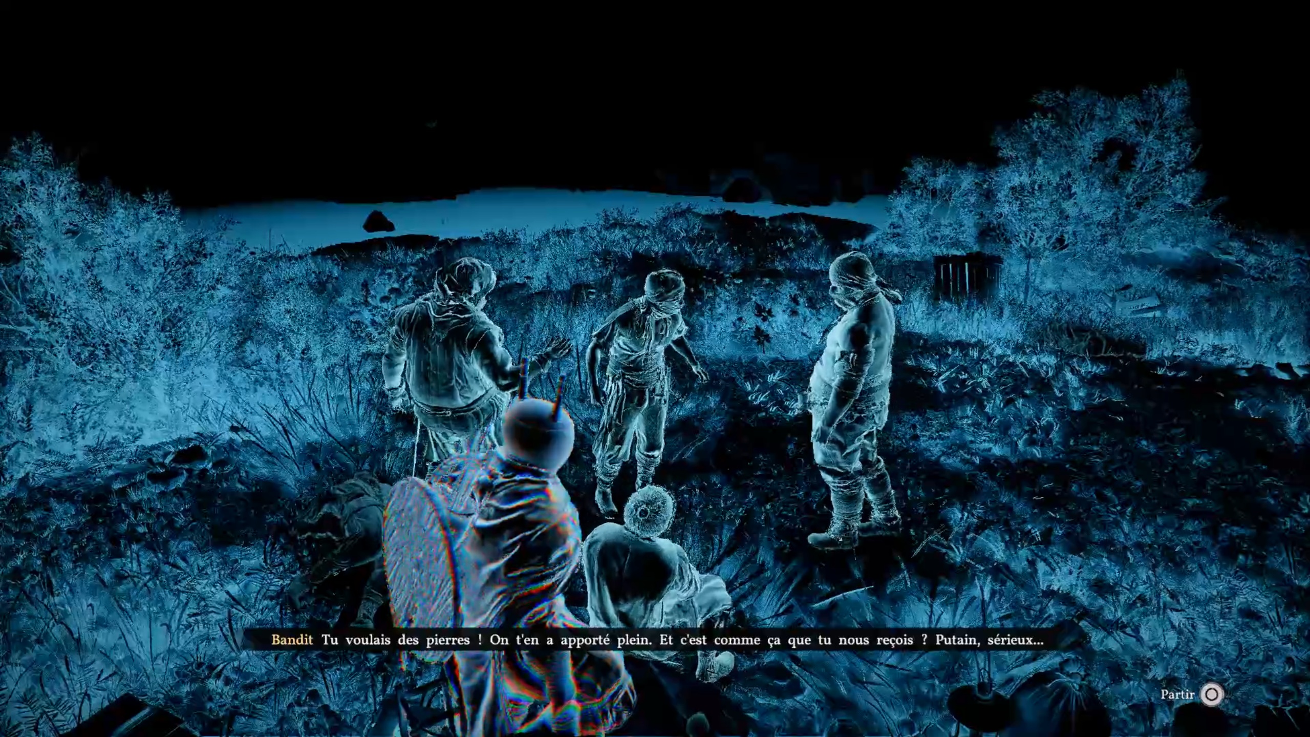 Une fois la zone libérée, rapprochez-vous du feu de camp et équipez-vous de votre lampe allumée pour faire apparaître un souvenir. Contemplez-le, puis équipez-vous du casque Visione dans votre inventaire afin de le lire. Retournez ensuite auprès de l’homme pour lui annoncer la mauvaise nouvelle.