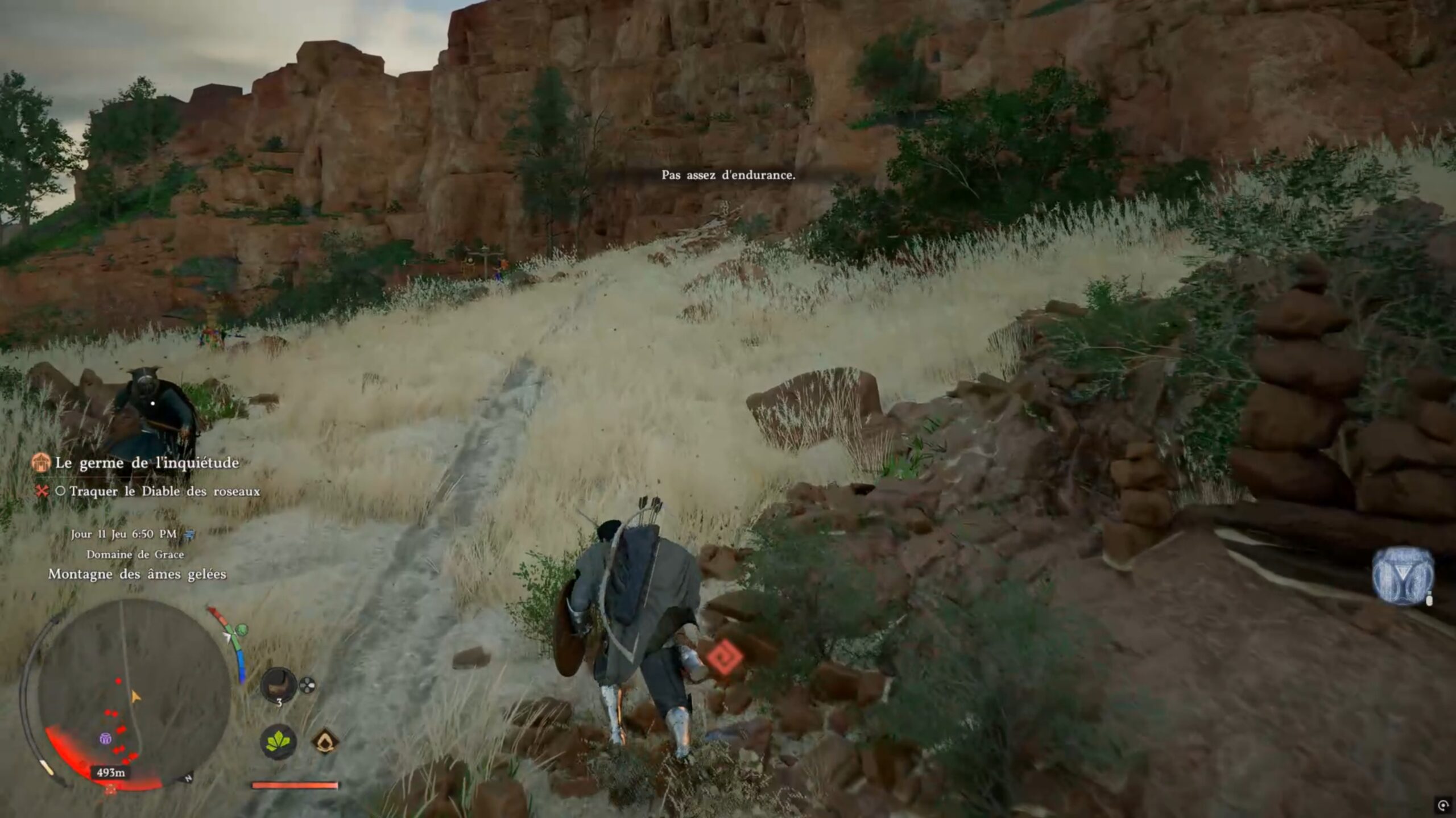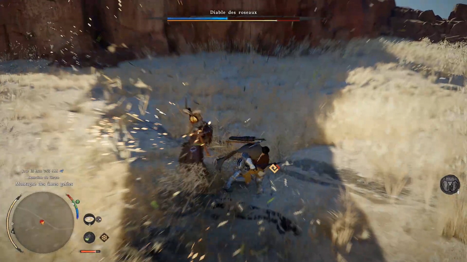Avant d’enclencher le combat de boss, nous vous recommandons de faire le plein de Bouillon clair et de Comprimé de palme. Une fois vos recharges pleines, engagez le combat contre le Diable des roseaux. Contre lui, ne cherchez pas à contrer : ses attaques sont trop rapides. Utilisez plutôt l’esquive pour éviter les dégâts, puis, après ses enchaînements, placez des attaques lourdes pour l’affaiblir. Entre la phase une et deux, courez directement vers les totems indiqués sur la carte pour les détruire et passer à la phase suivante. Continuez ensuite à enchaîner esquives et attaques lourdes pour terminer le combat. Petite astuce sur PC : baissez les graphismes afin de mieux l’identifier à travers les roseaux.