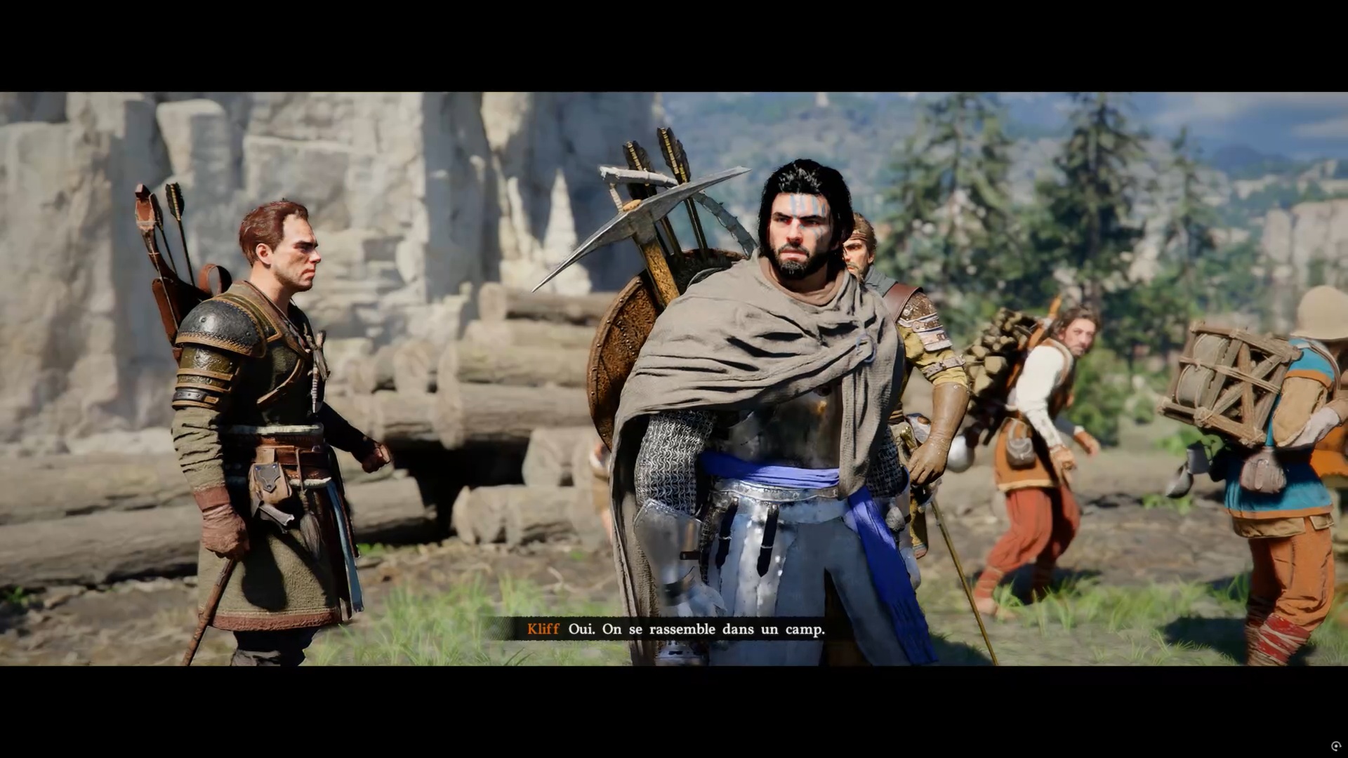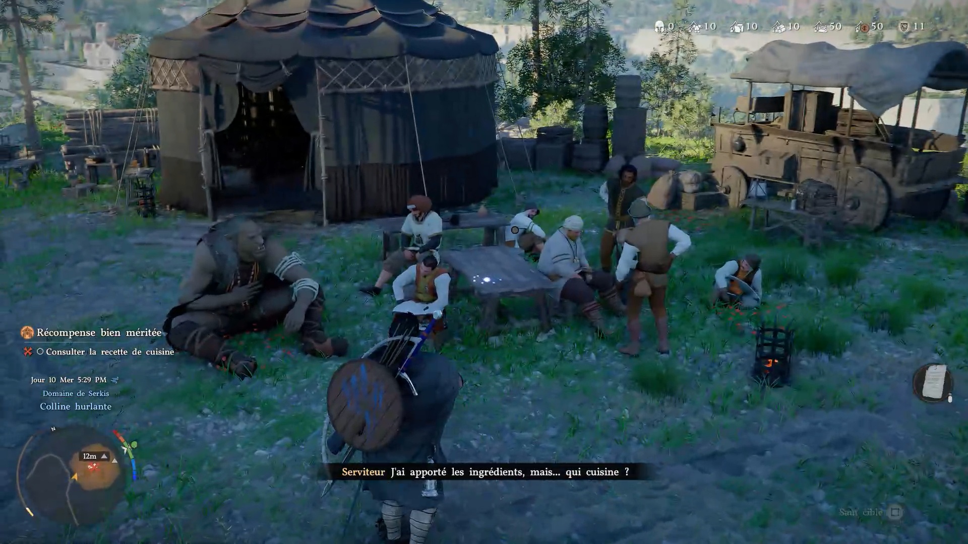 De retour avec Kliff au campement, examinez le banc près du feu de camp pour récupérer des ingrédients et une recette. Examinez la recette, puis interagissez avec le feu de camp pour préparer deux soupes. Servez le repas pour terminer la quête.