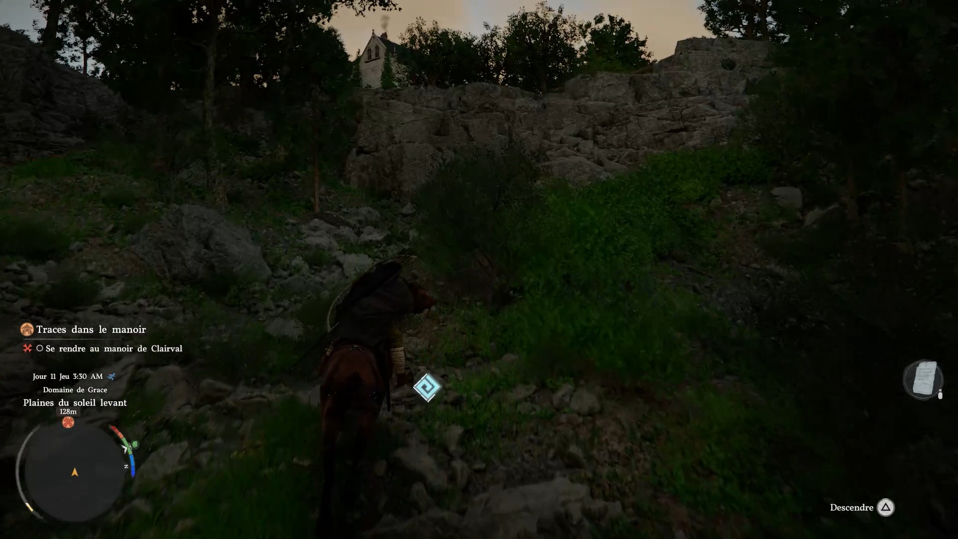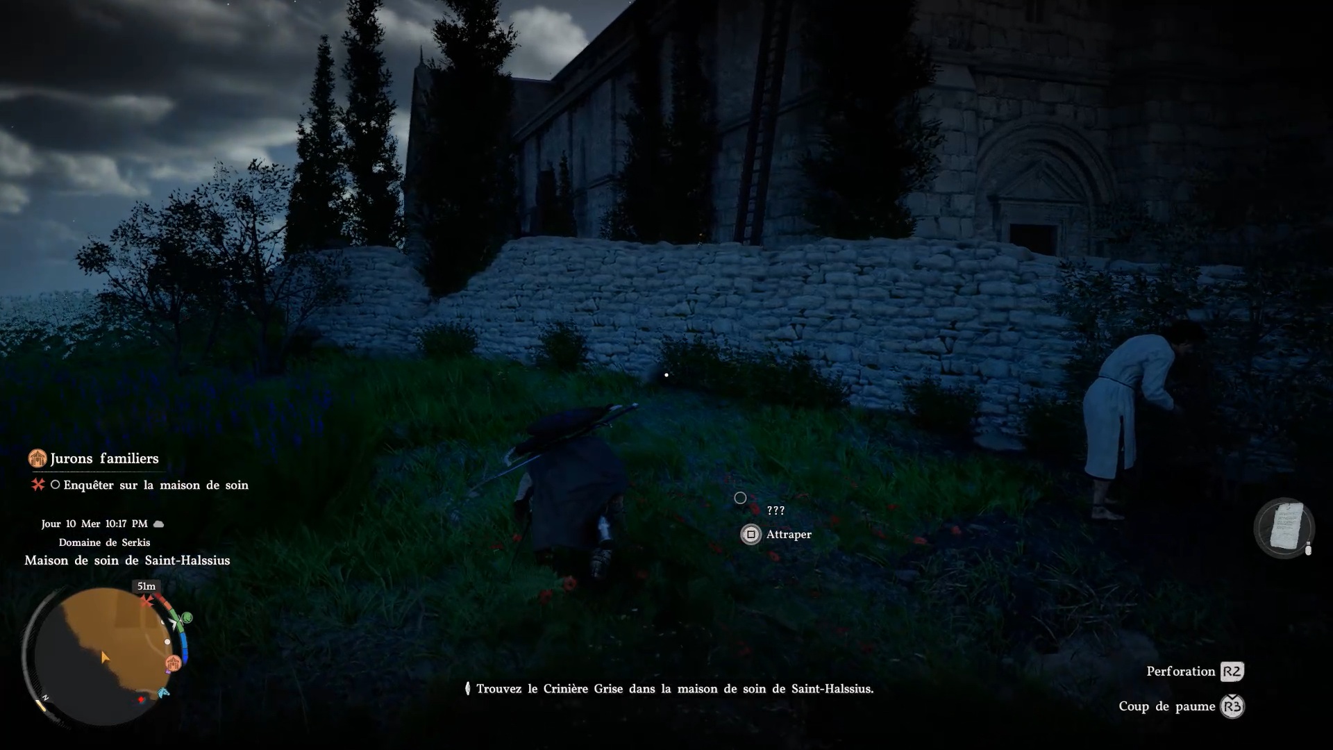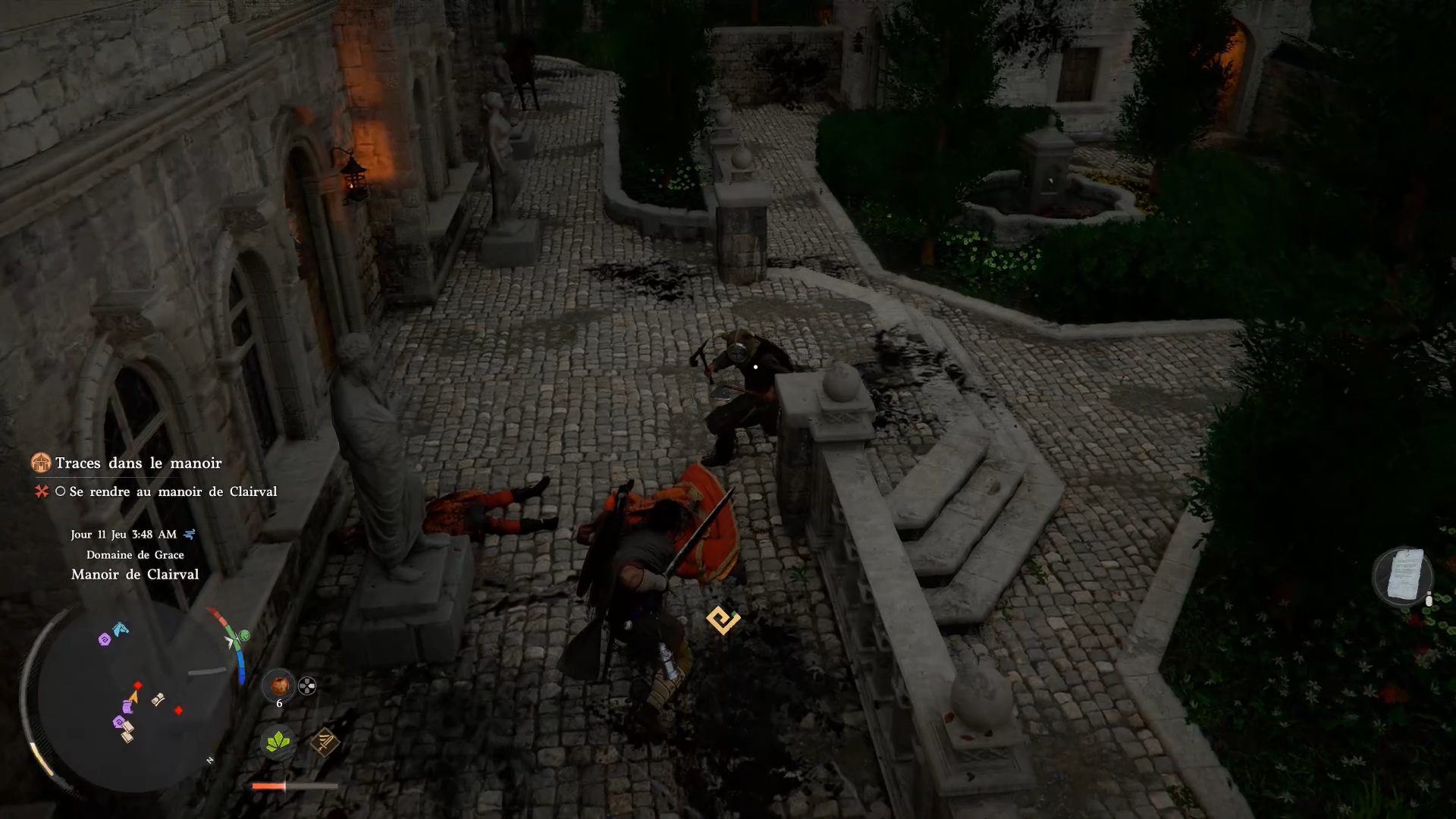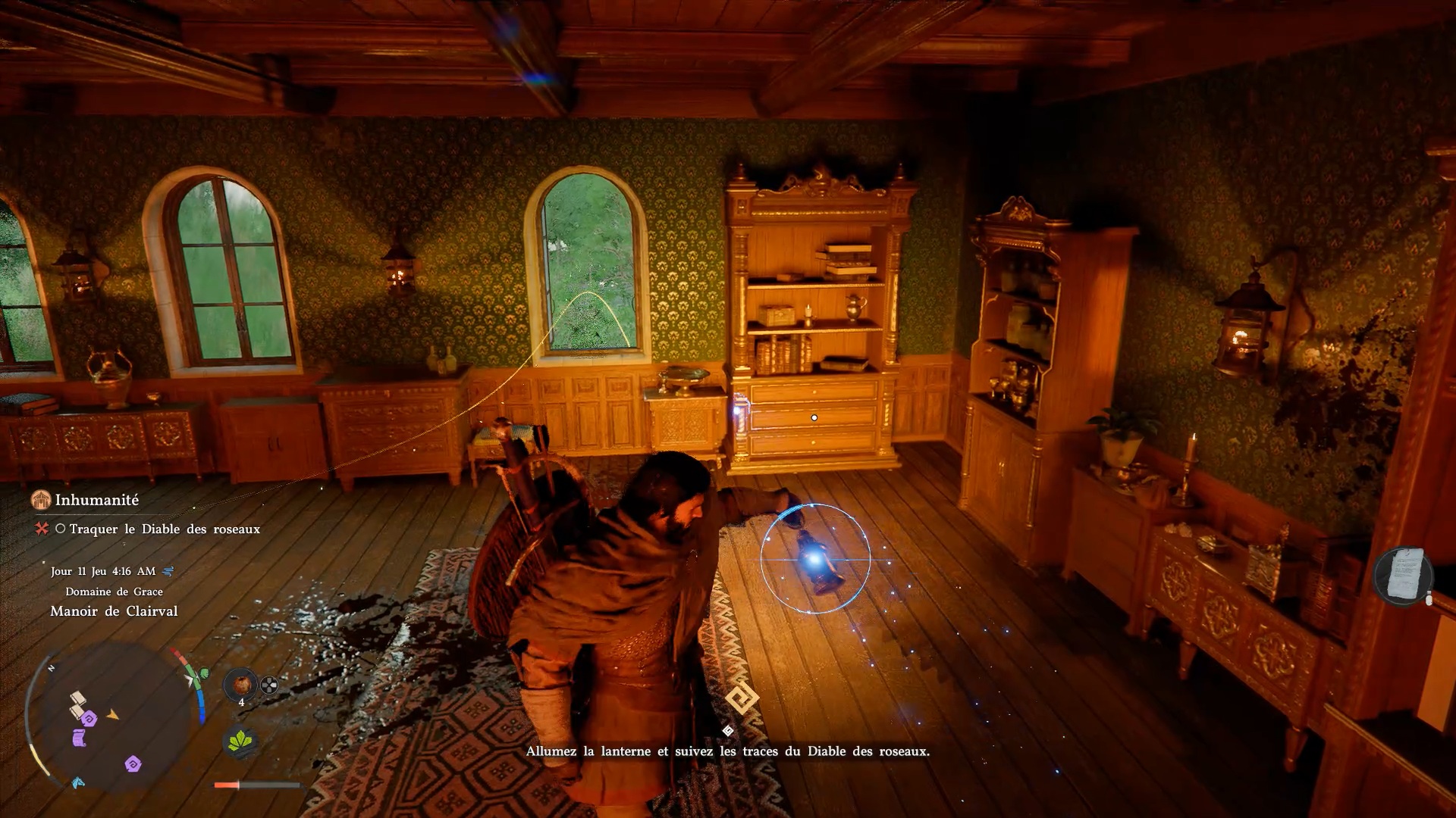 Dans la quête « Traces dans le manoir », suivez le point indiqué sur votre carte pour atteindre la zone d’investigation. Entrez dans la cour du manoir pour déclencher un combat. Survivez, puis gagnez l’étage pour rencontrer un homme. Sortez votre lampe allumée afin de révéler une trace.