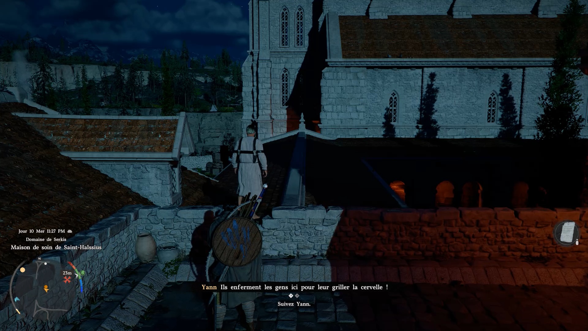 Rejoignez la position indiquée sur votre carte pour atteindre la maison de soin. Sur place, passez le point puis longez la périphérie au nord pour atteindre un muret. Passez le muret afin de rejoindre l’église au loin, puis utilisez l’échelle pour atteindre les hauteurs.