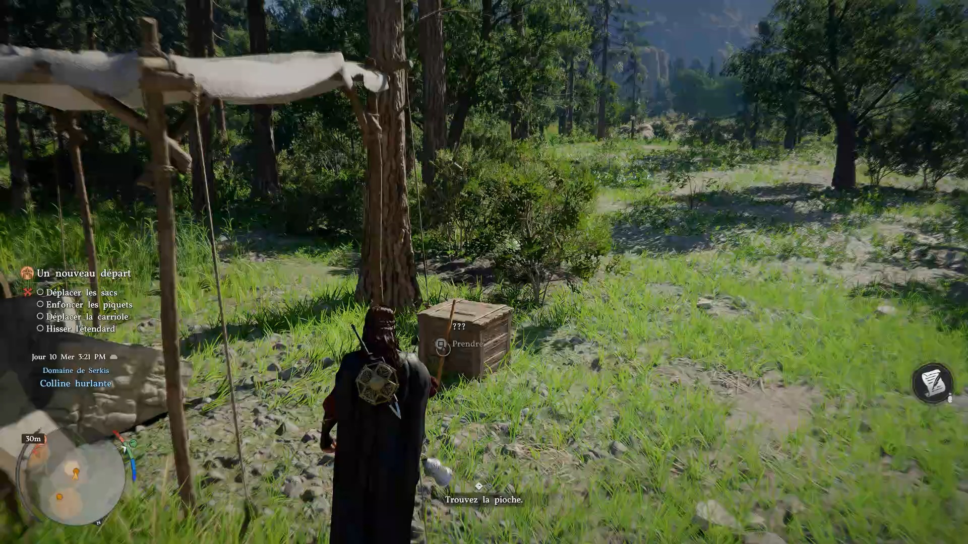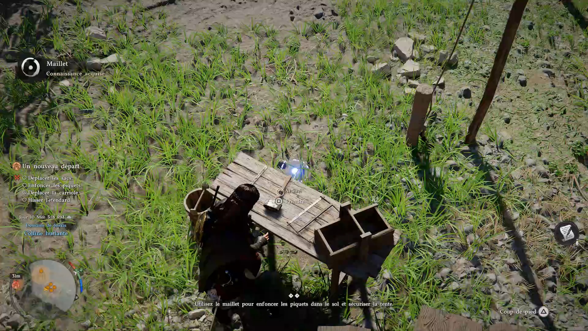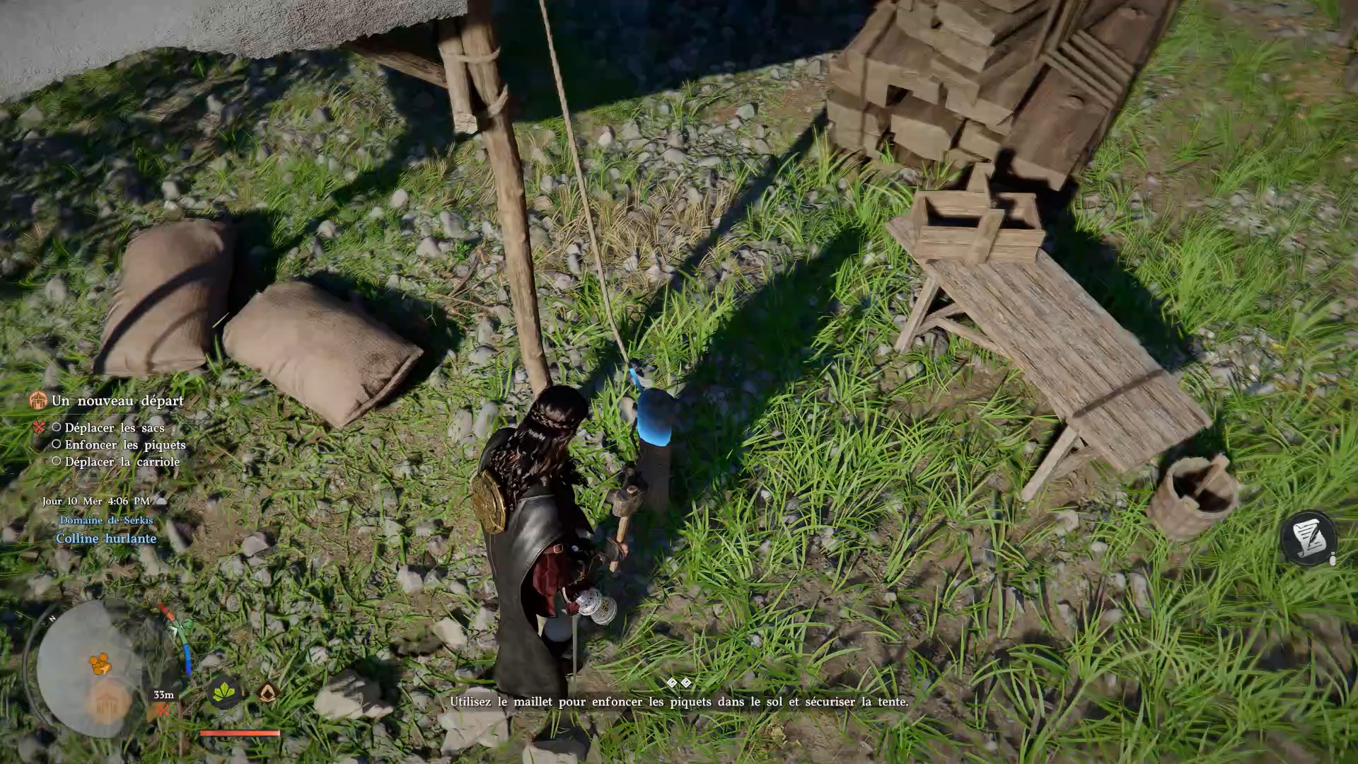 Pour enfoncer les piquets, récupérez d’abord le maillet posé sur une table indiquée sur la carte. Une fois en main, rejoignez la zone des piquets puis équipez-vous du maillet. Enfoncez les piquets un à un autour de la zone pour terminer la tâche.