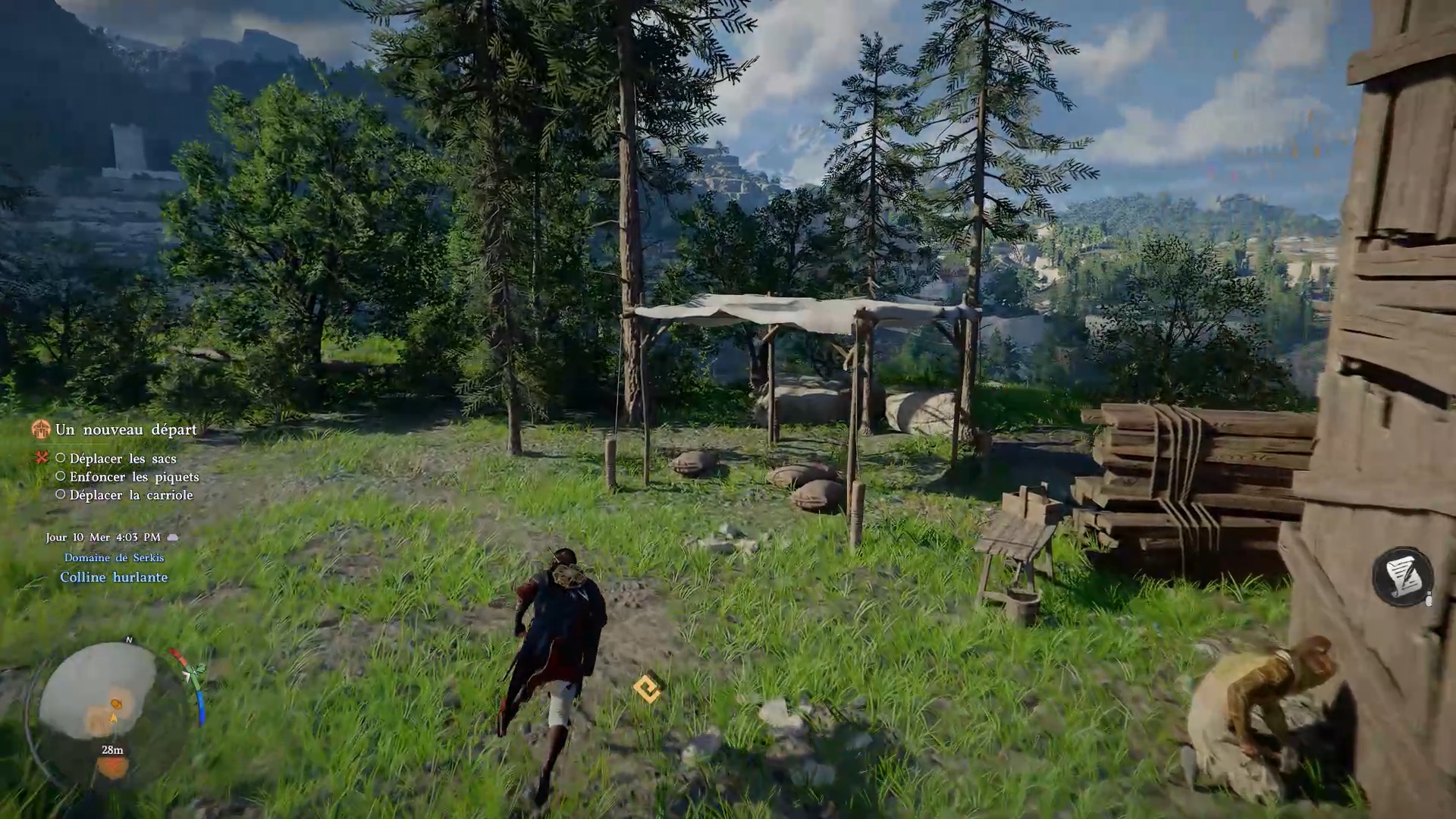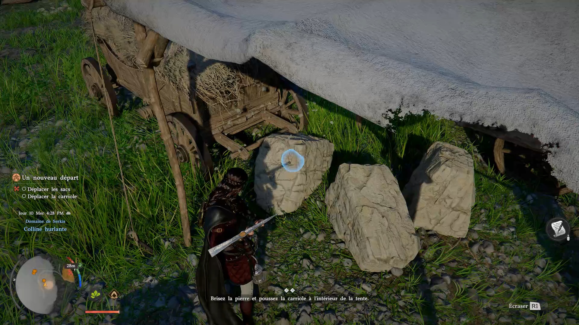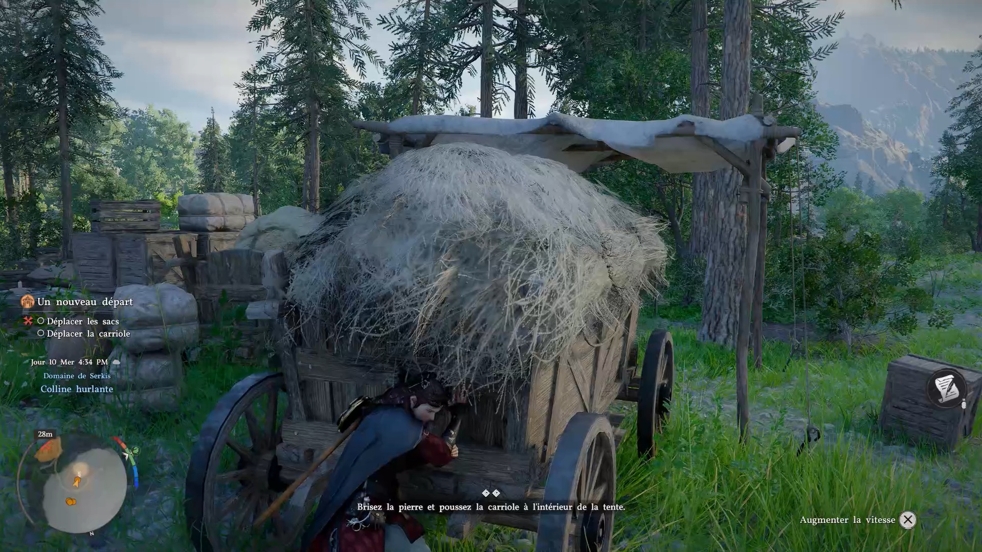 Pour déplacer la carriole, récupérez la pioche à proximité indiquée sur votre carte. Allez vers la carriole et minez les rochers à proximité pour libérer le passage. Déplacez ensuite la carriole en la poussant afin de réussir la tâche.