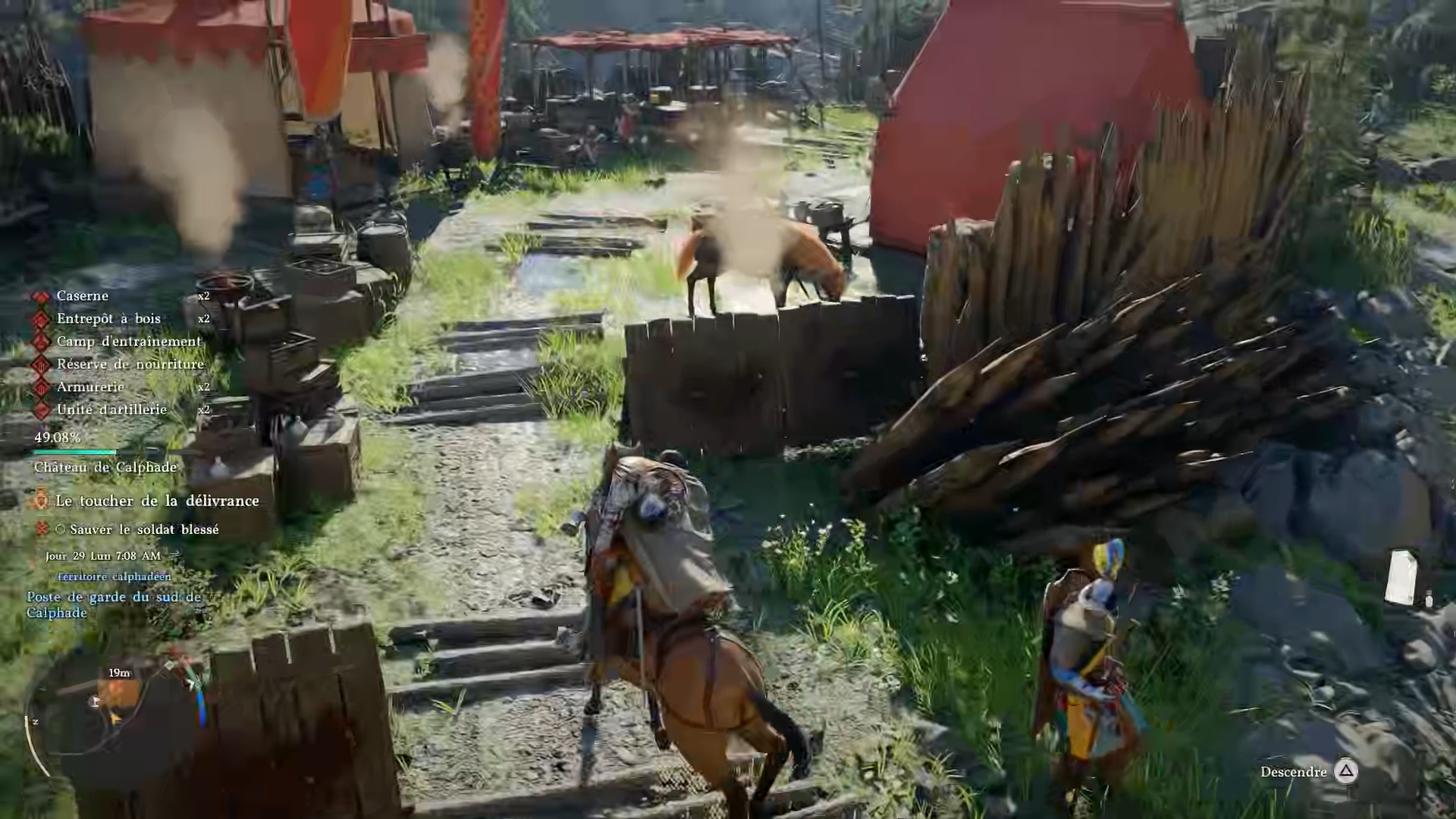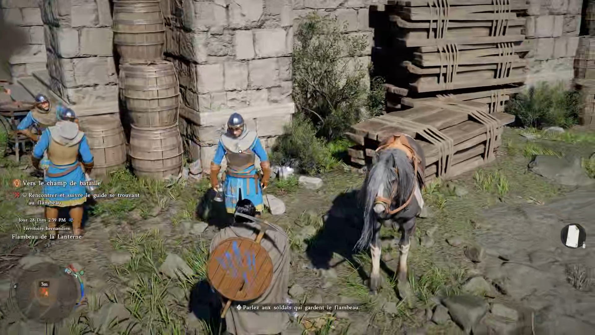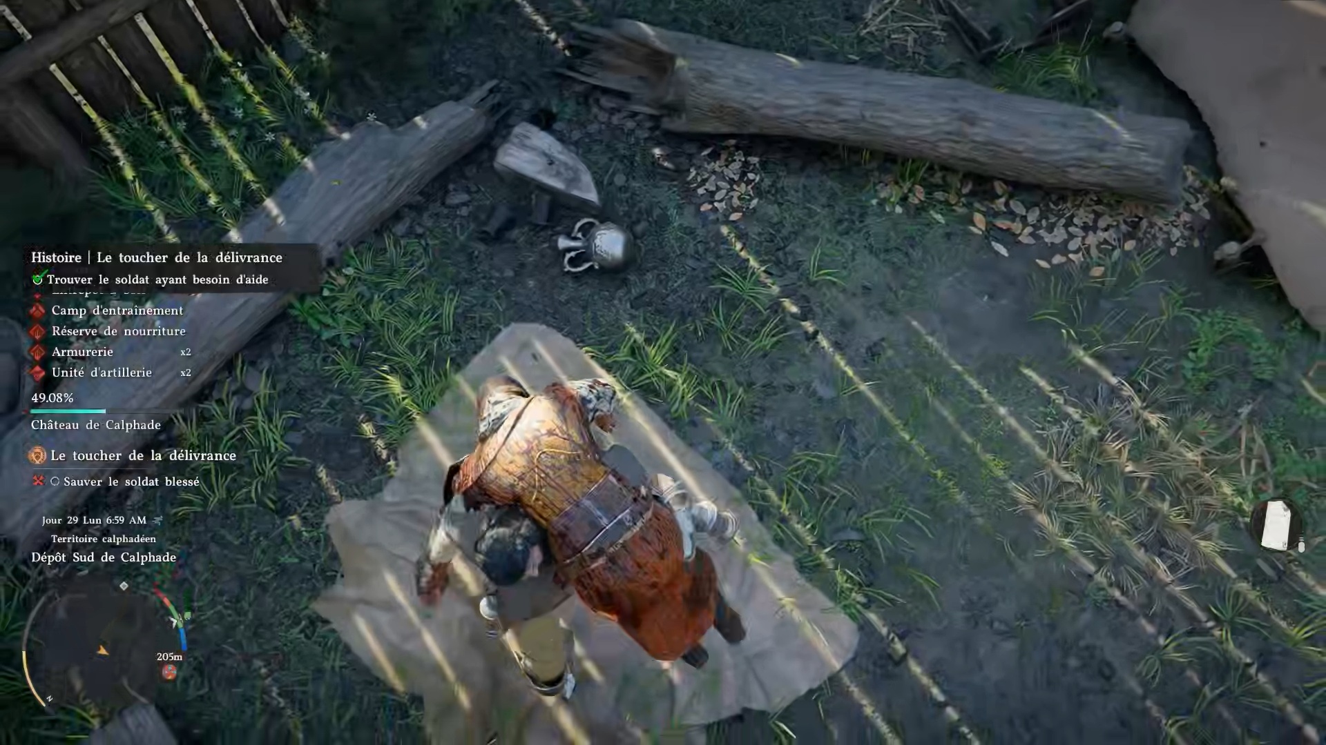 Après avoir brandit les étendards, rejoignez la position des soldats indiquée sur votre carte pour leur porter assistance. Sur place, vous trouverez un soldat à terre : récupérez son corps et ramenez-le au campement indiqué.