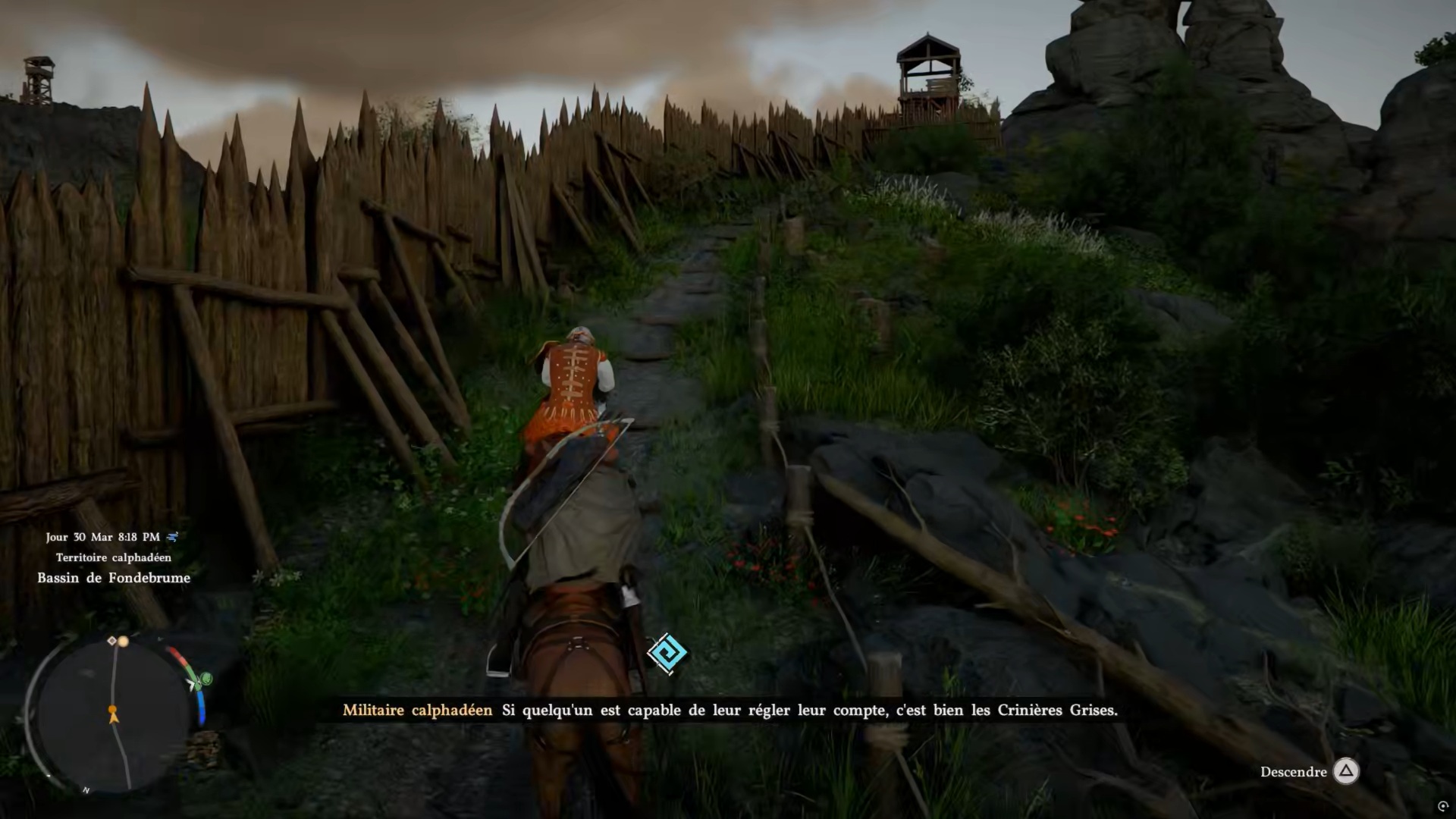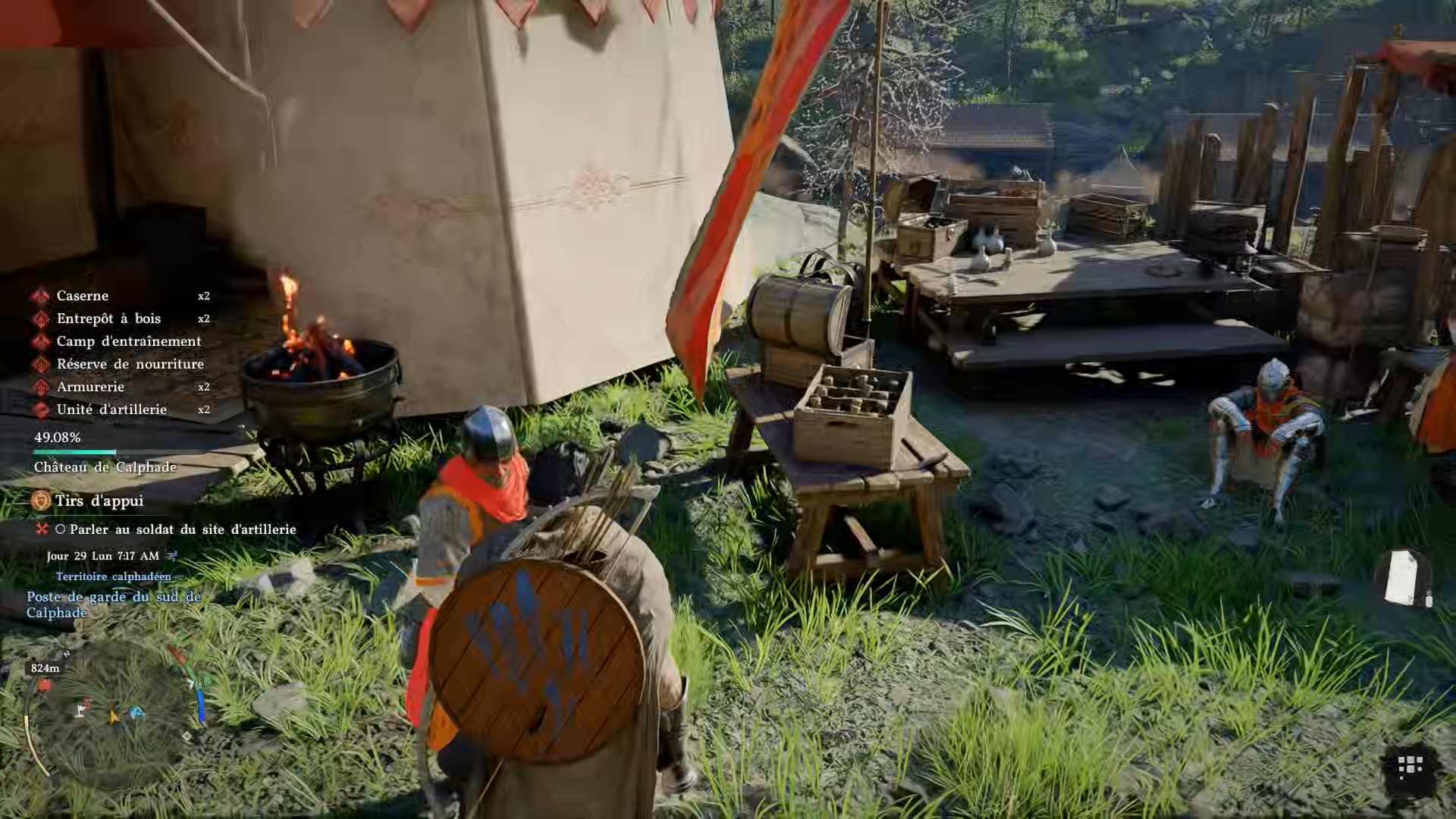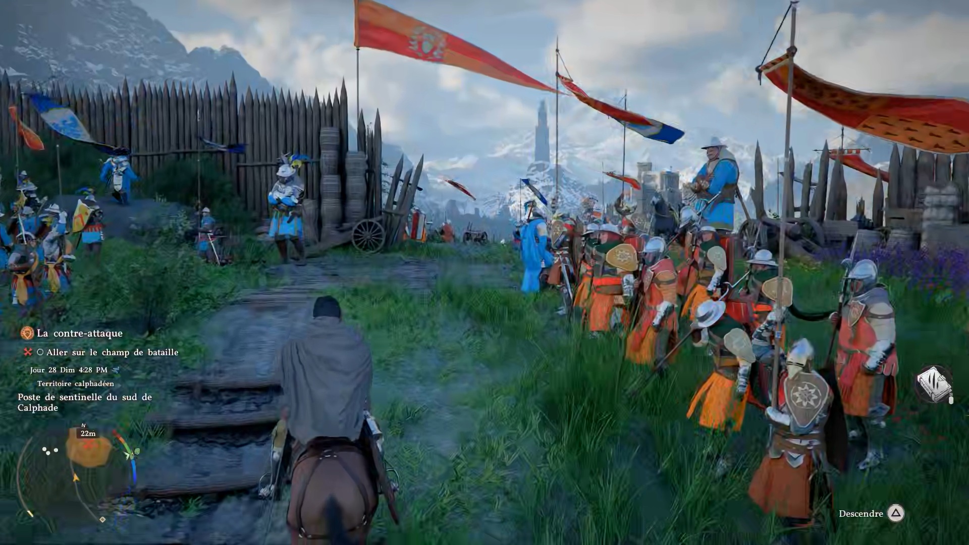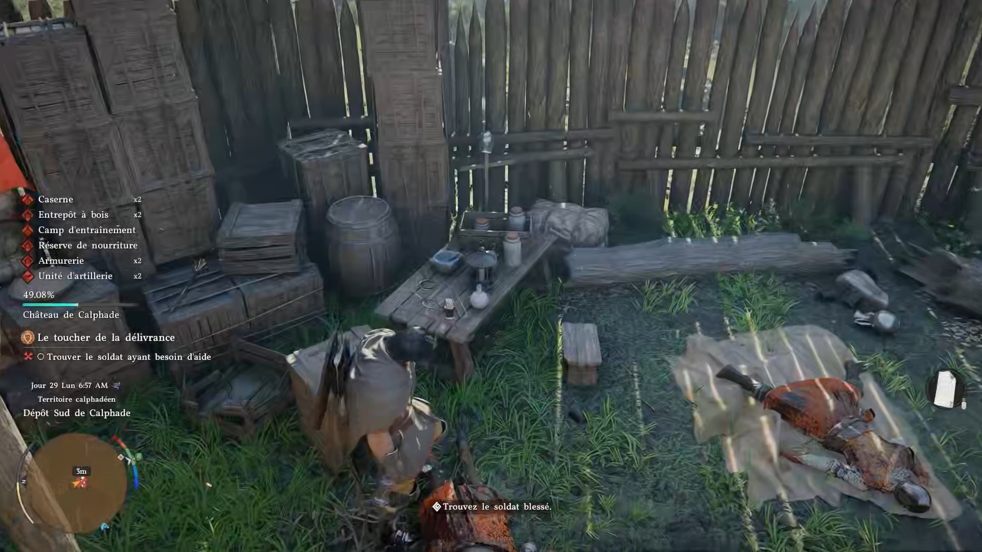 Après avoir brandit les étendards, rejoignez la position des soldats indiquée sur votre carte pour leur porter assistance. Sur place, vous trouverez un soldat à terre : récupérez son corps et ramenez-le au campement indiqué.