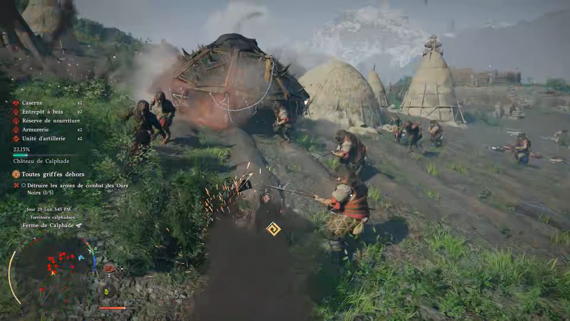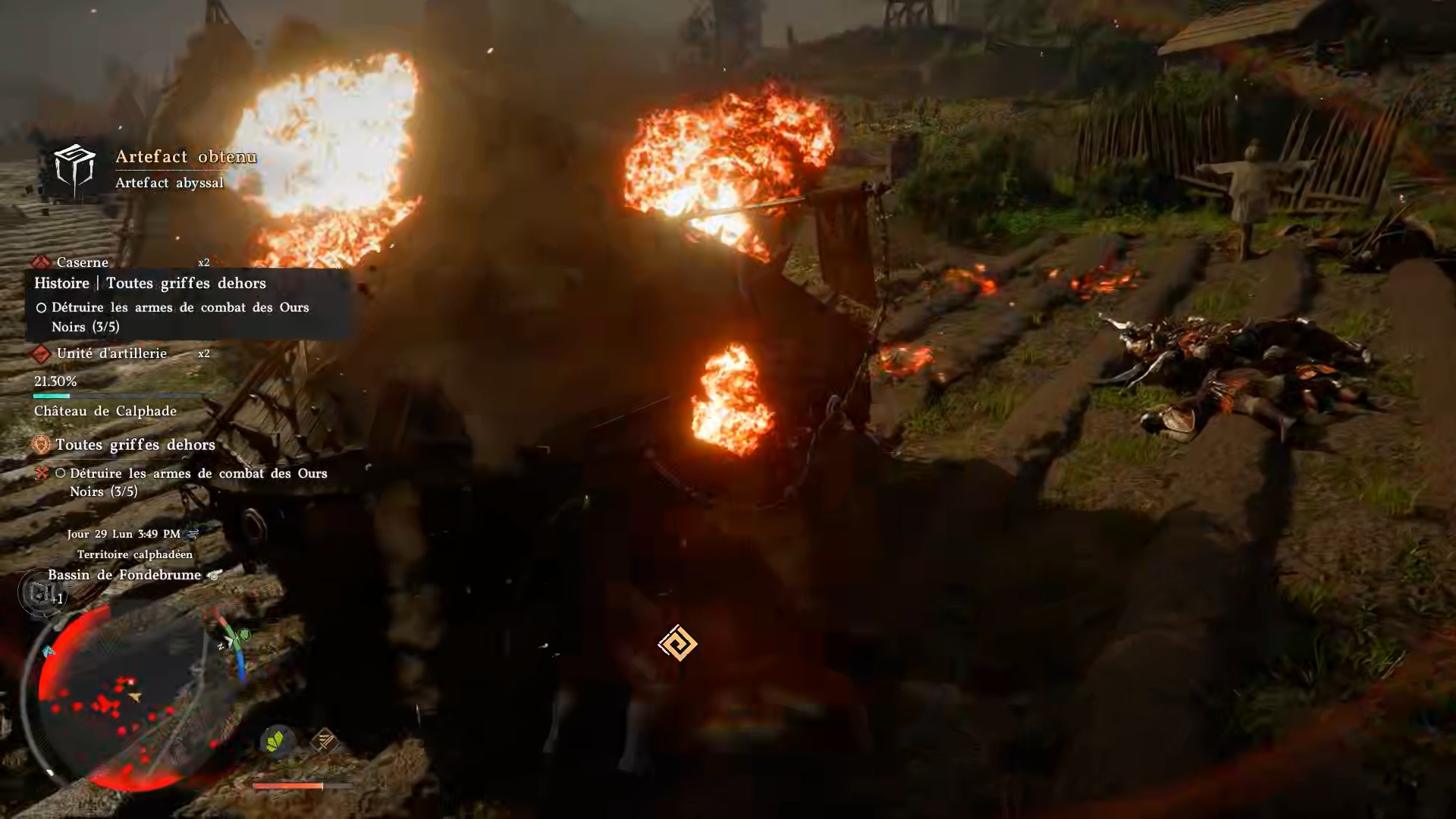 Dans cette quête, descendez dans les champs au sud pour identifier la source des tirs. Il s’agit en réalité de chars de combat. Utilisez la technique de l’entaille circulaire pour les détruire rapidement et mettre fin aux tirs contre votre campement.
