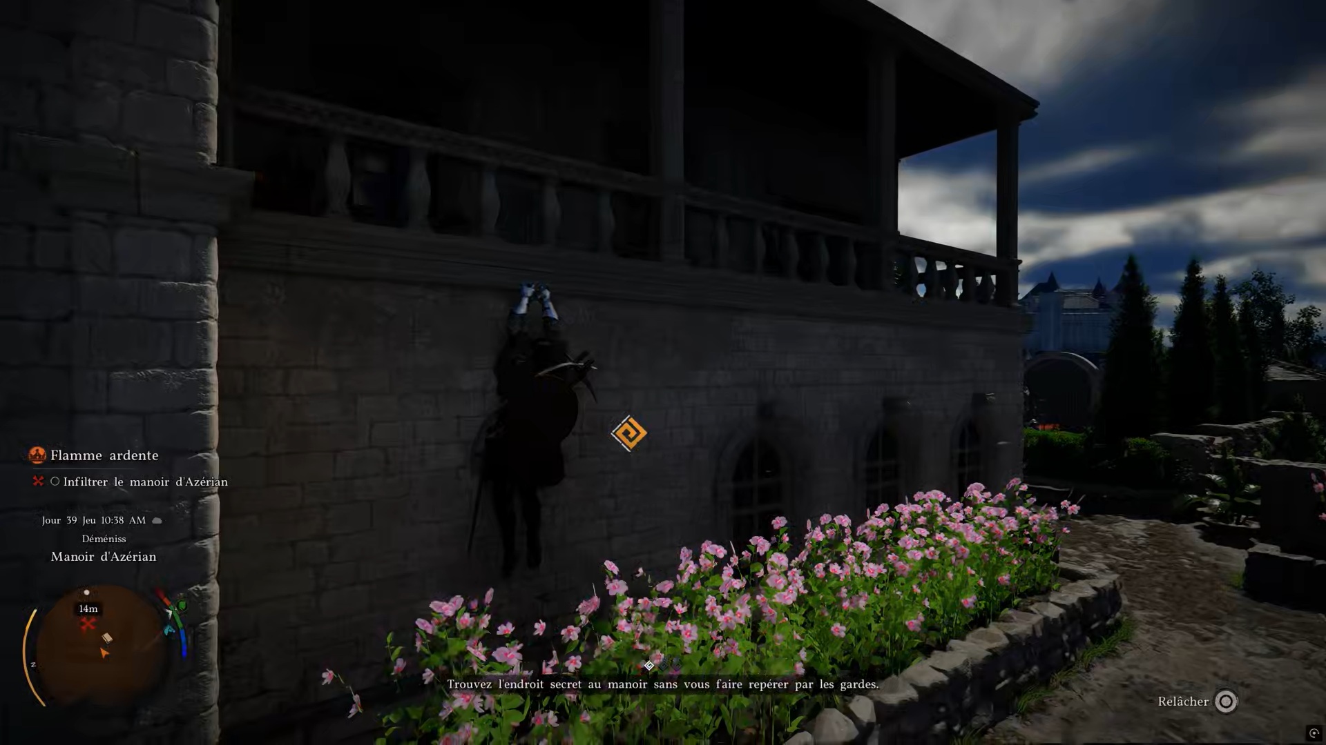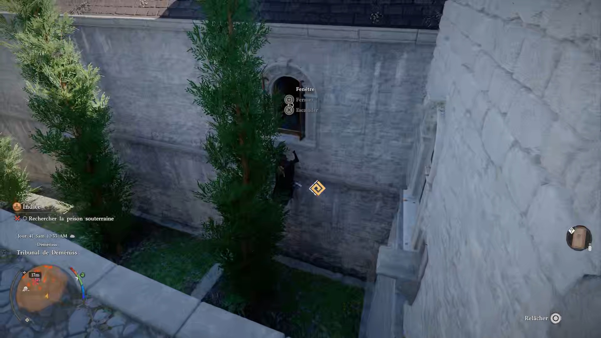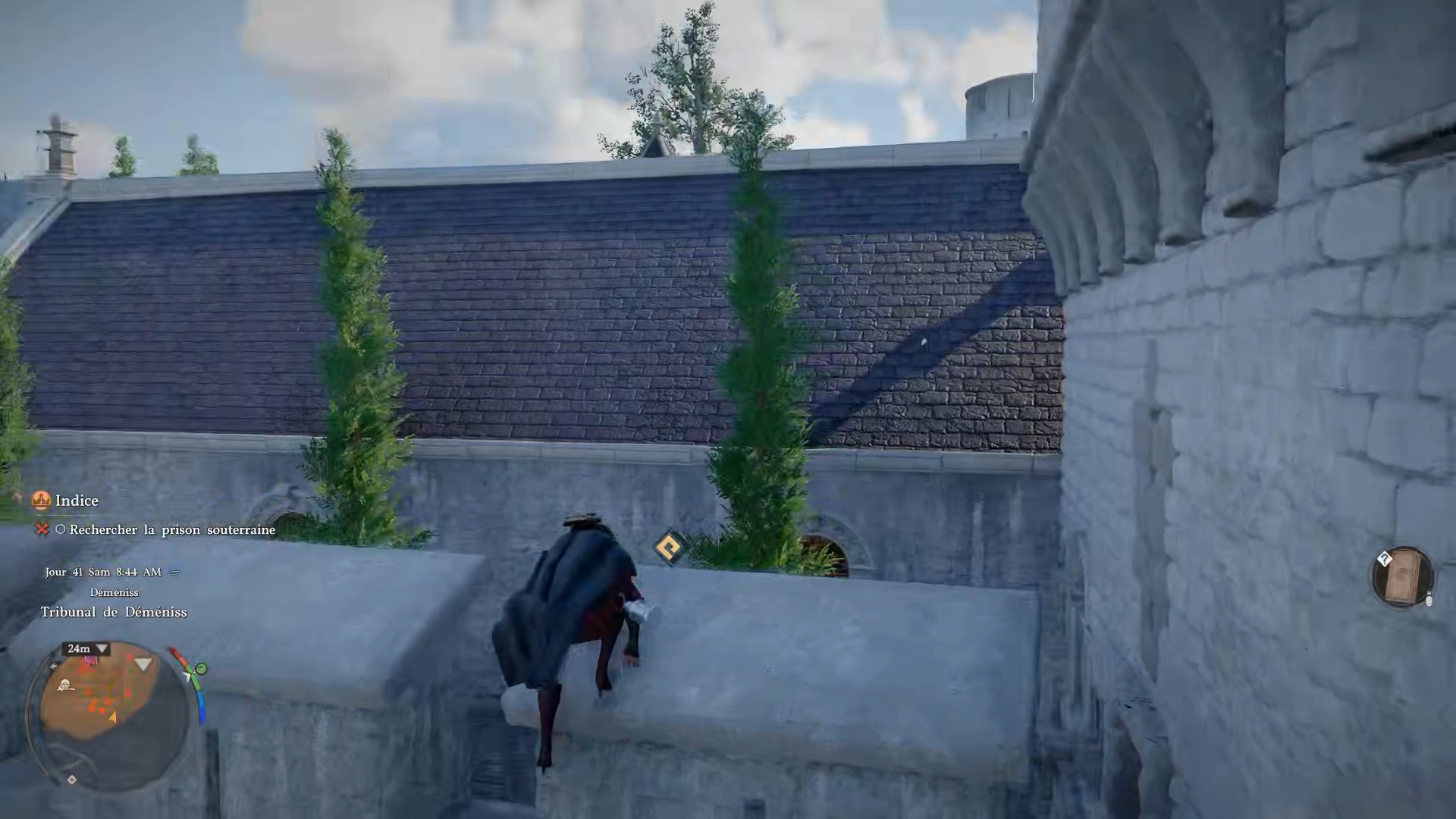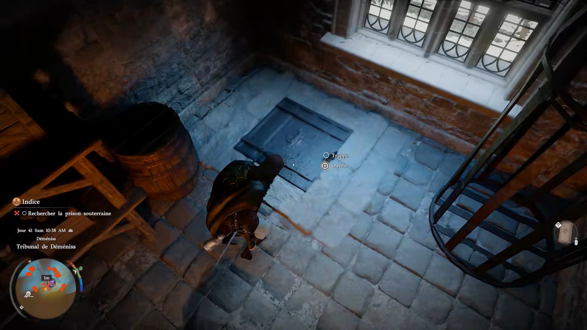 Dans la peau de Damiane, vous devrez infiltrer le tribunal de « Déméniss ». Utilisez le mur à l’ouest pour vous infiltrer, puis passez par la fenêtre la plus proche de la muraille pour entrer à l’intérieur. Au rez-de-chaussée, passez derrière le garde afin de trouver une trappe. Examinez les cellules pour retrouver Béatrice.