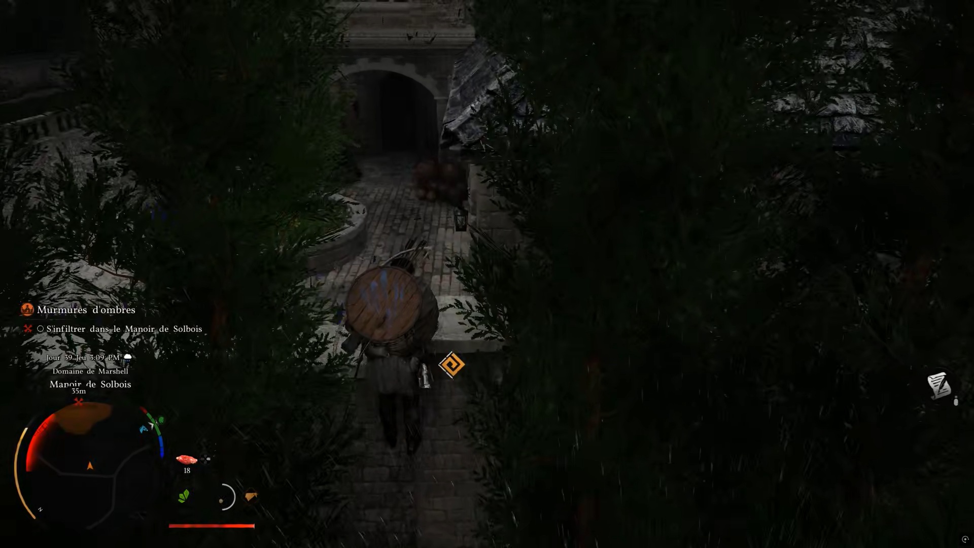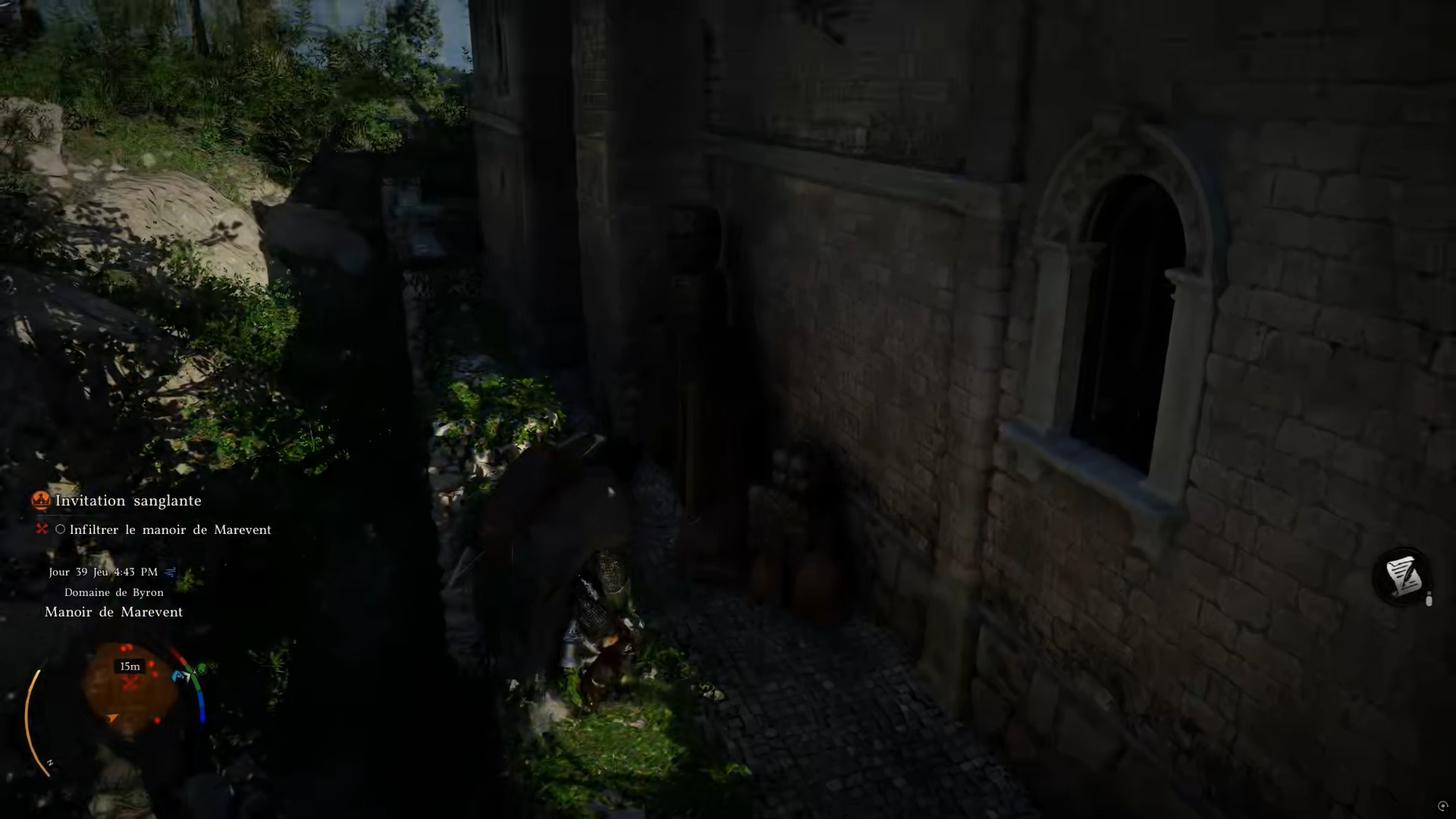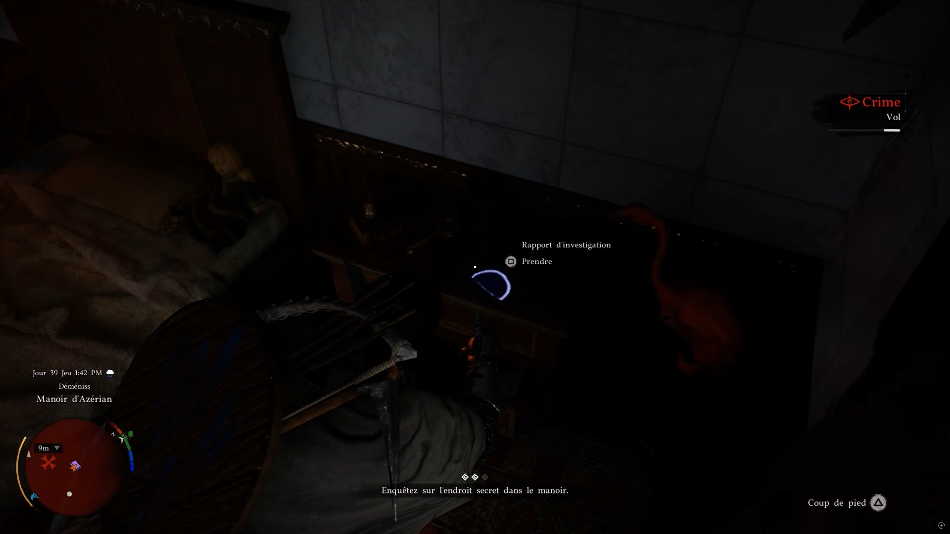 Allez à la ferme de Bourg en Bruissant pour infiltrer un manoir. Longez le mur à l’ouest afin de passer le muret, puis montez sur le balcon pour entrer à l’intérieur sans vous faire voir par les gardes. À l’étage, poussez le mur avec le tableau pour accéder à une salle secrète. Examinez la table de chevet afin de trouver un rapport. Sortez ensuite de la pièce pour déclencher une cinématique.