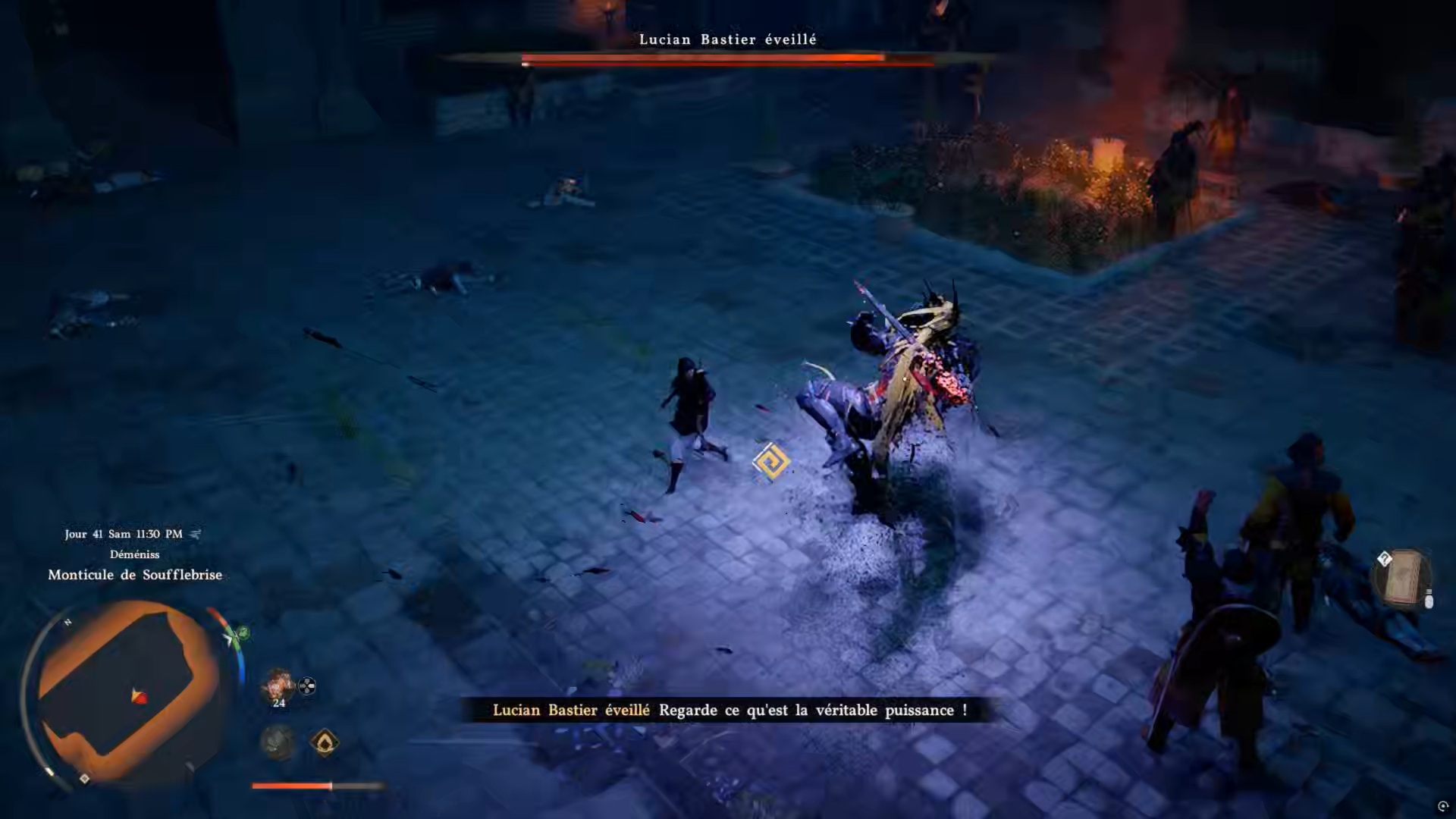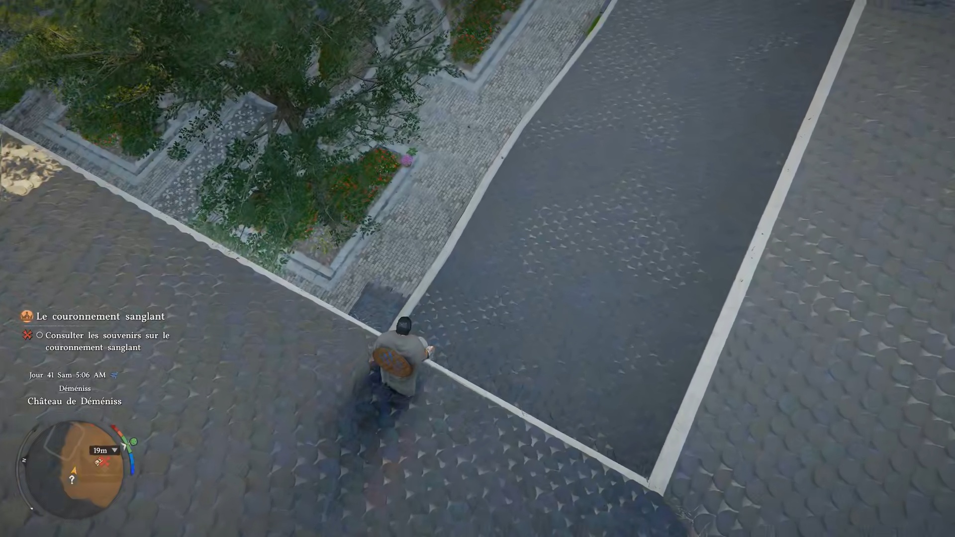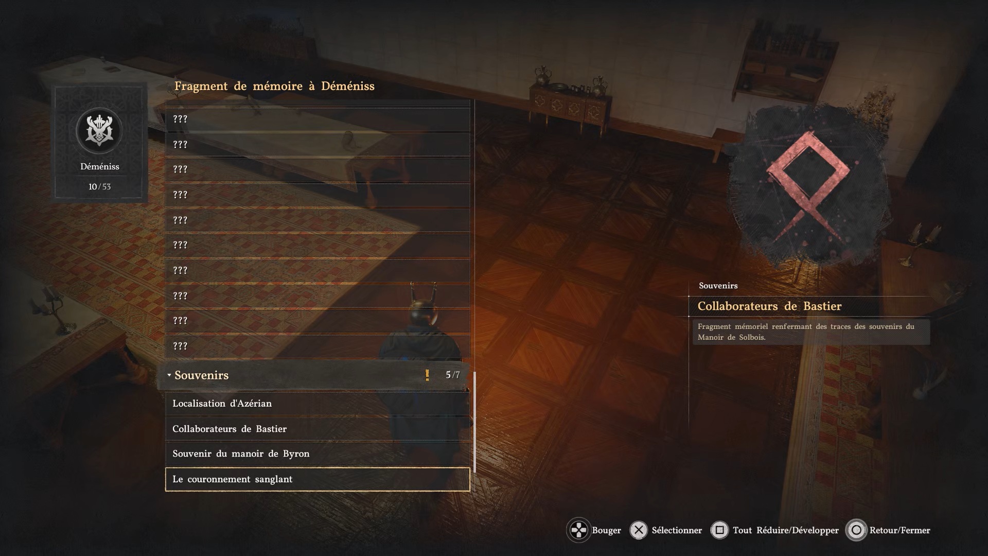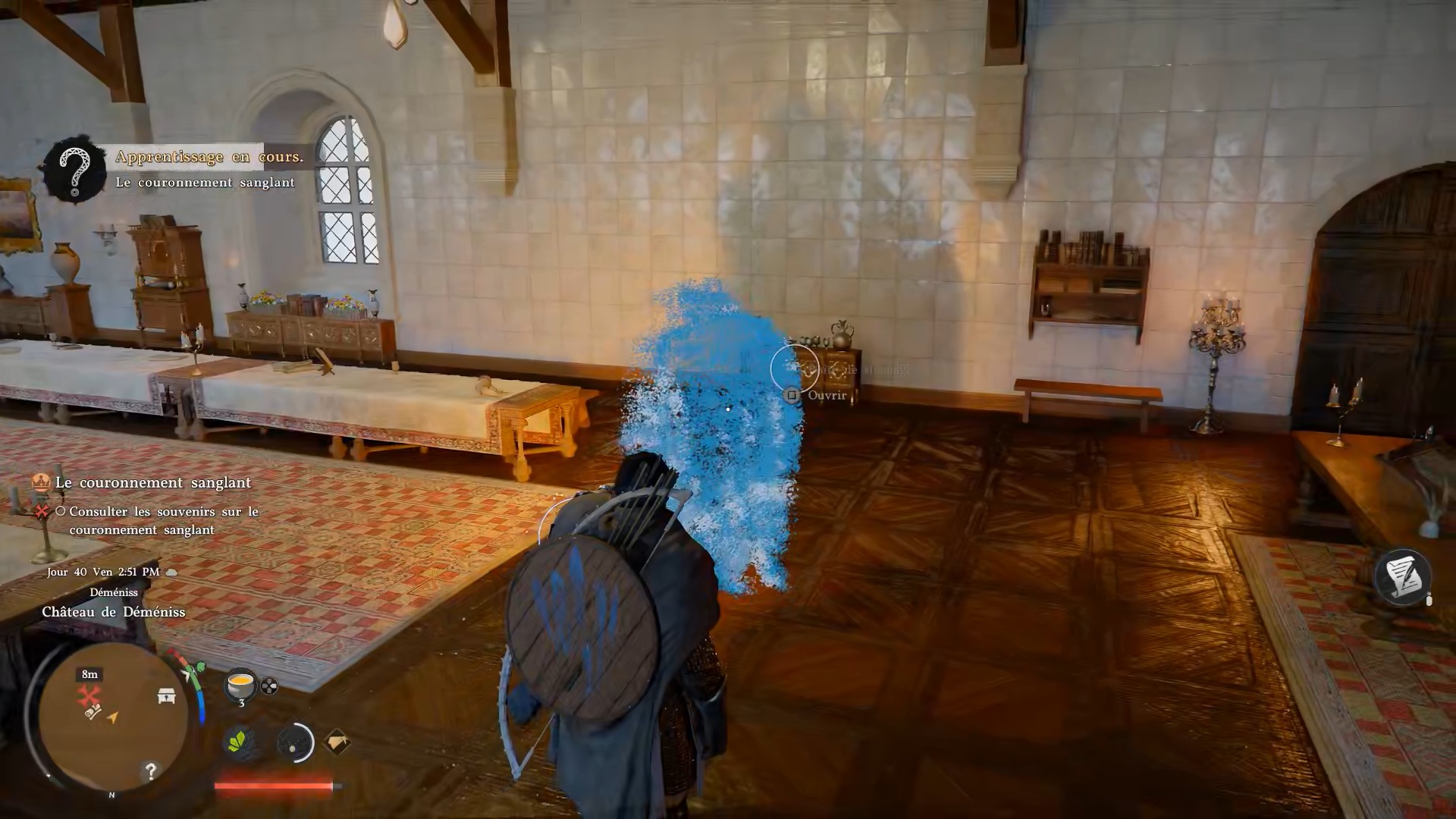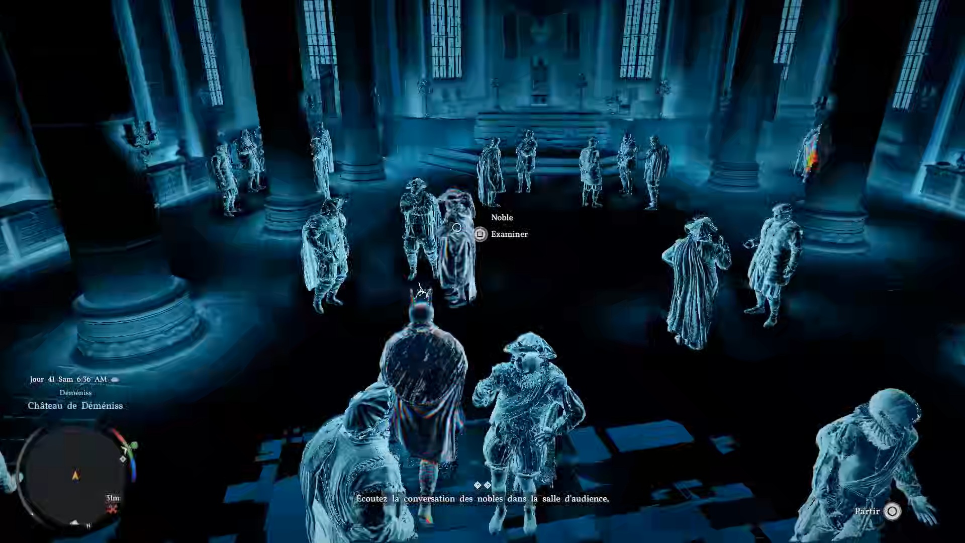 Rendez-vous dans le château de « Déméniss » en passant par le sud pour franchir les murs et atteindre les toits. Passez par les portes de la cour afin d’accéder à l’étage. Utilisez la lampe dans le hall pour trouver un souvenir de Myurdin, puis suivez Bastier pour progresser jusqu’à la salle de couronnement. Attention : si vous retirez le casque Visione, vous devrez le rééquiper dans le hall du premier étage et relancer le souvenir depuis le menu Visione. Une fois dans la salle de couronnement, interrogez les nobles pour déclencher un combat et terminer la quête.