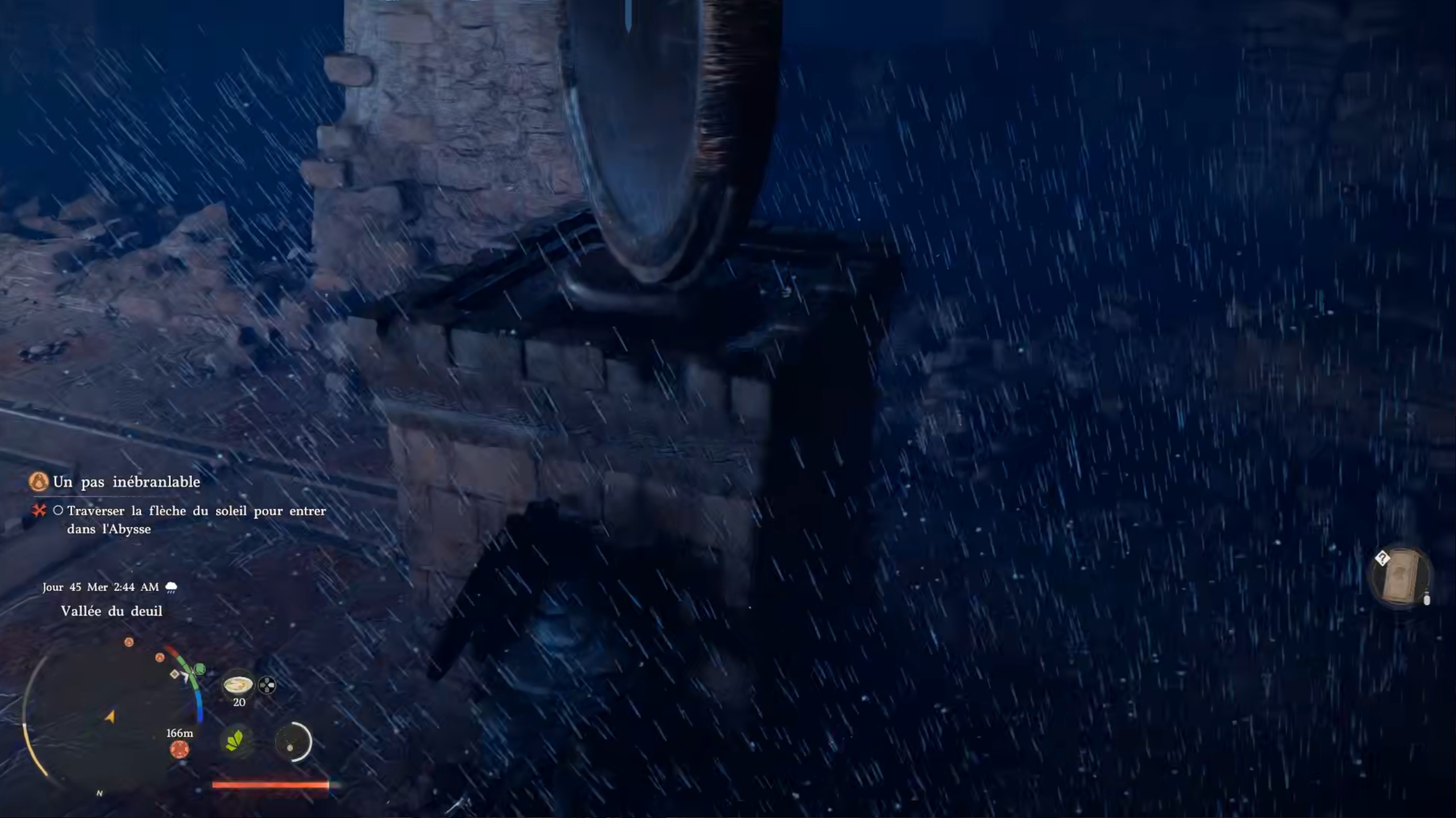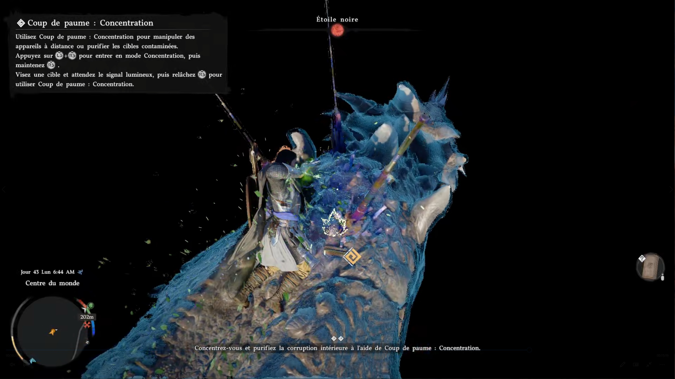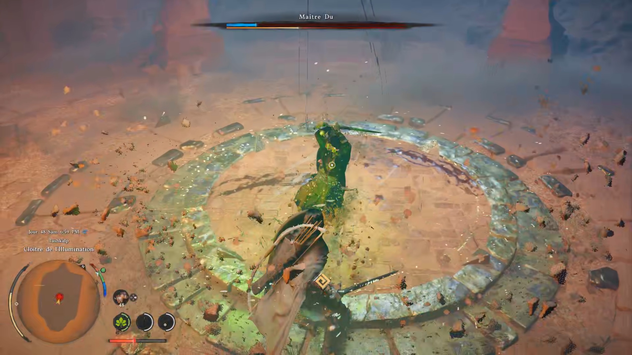 Après avoir ouvert les portes, un combat de boss se déclenche contre Maître Du. Attention, il n’est pas comme les autres boss rencontrés jusqu’à présent. Nous vous recommandons vivement de disposer d’un maximum de santé et d’endurance pour le vaincre. Faites le plein de concentré de palme et de vivres, comme les bouillons clairs, afin d’encaisser les dégâts. Lors du combat, utilisez la parade au moment précis où son arme vous touche pour le contrer et réduire son endurance. Si possible, passez en mode performance ou baissez les graphismes afin d’obtenir un meilleur framerate et faciliter vos contres. Lorsqu’il saute sur les piliers, cachez-vous rapidement derrière l’un d’eux, puis placez-vous à l’opposé pour éviter son attaque. Quand il utilise un rayon vert, esquivez pour tenter de fuir : cette attaque peut être difficile à éviter. N’hésitez pas à utiliser vos concentrés de palme pour vous soigner et poursuivre le combat jusqu’à la victoire.