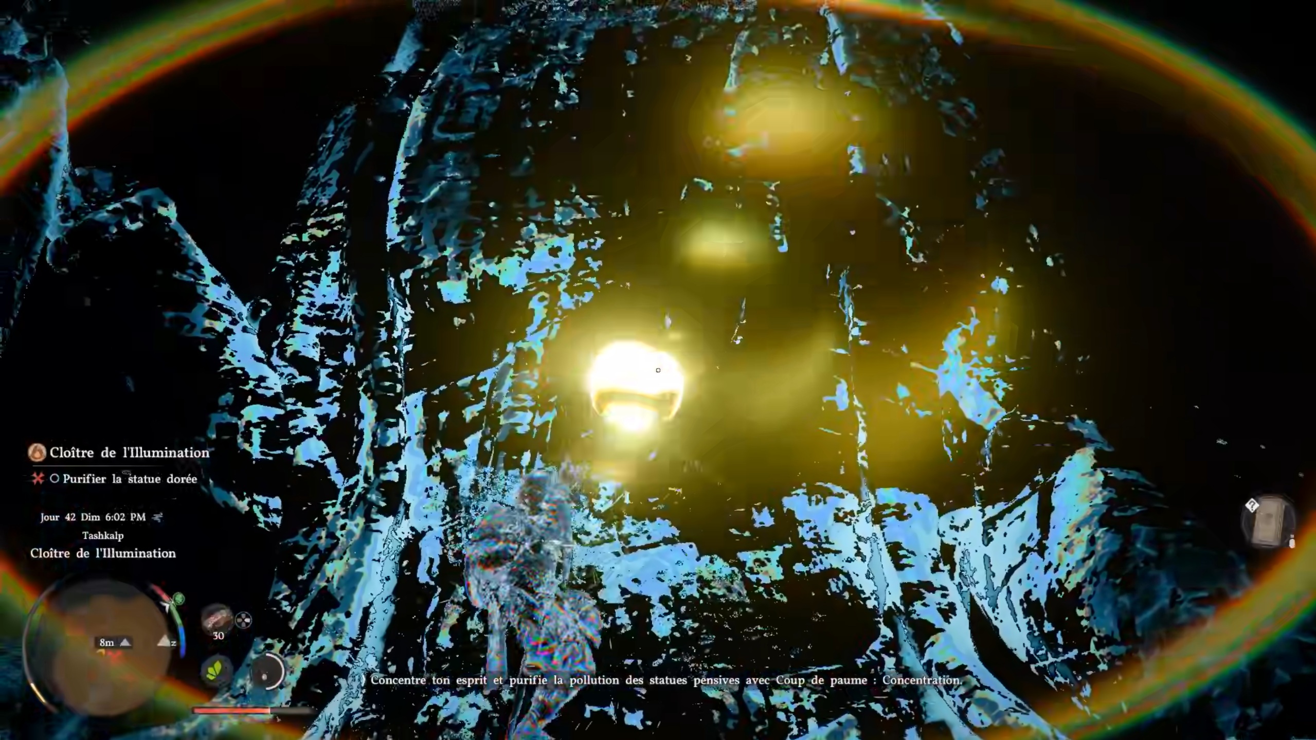 Dans la grotte de l’épreuve, montez sur la statue en bismuth pour utiliser la technique de concentration. Pendant son maintien, vous apercevrez une orbe à l’intérieur de la statue. Frappez l’orbe pour lui redonner ses couleurs d’antan et terminer la quête. Dégagez ensuite chacune des tablettes aux pieds des statues pour obtenir de nouvelles quêtes.