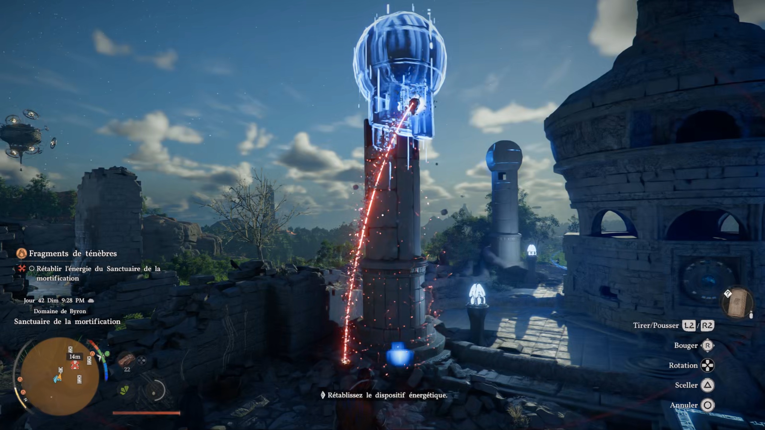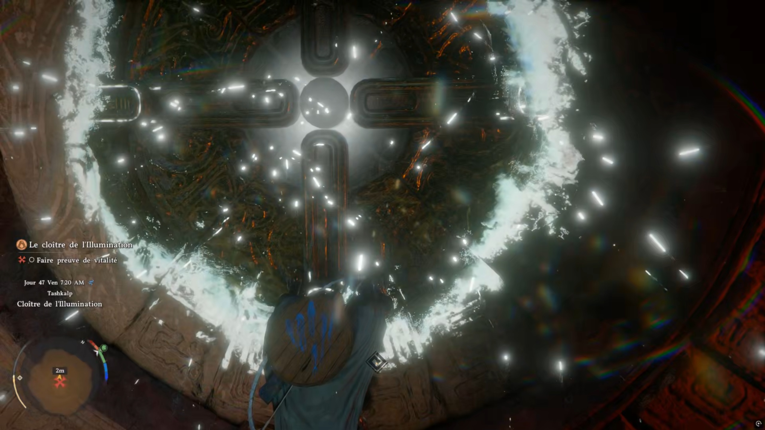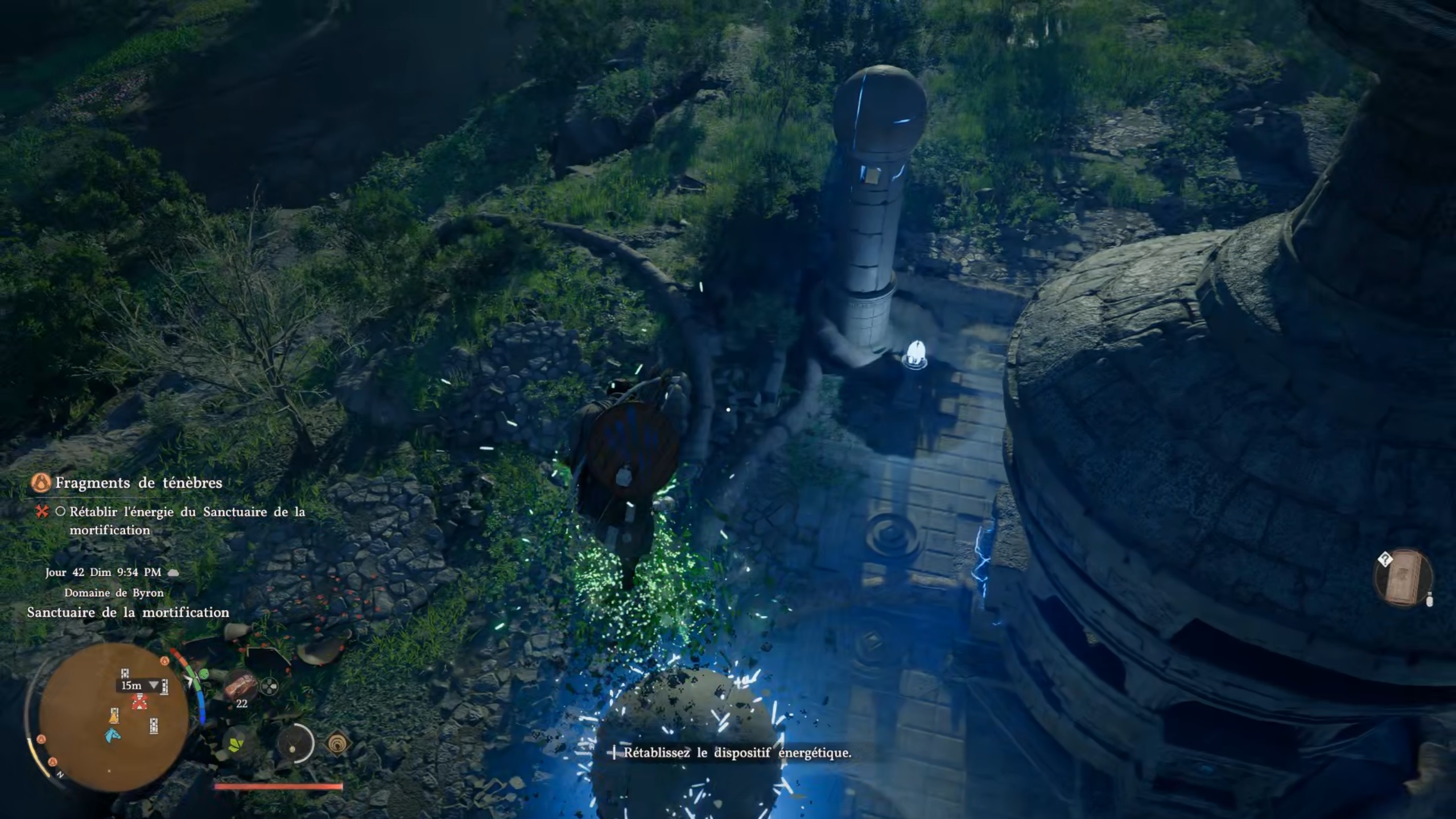 Dans la quête « Fragments de ténèbre », rejoignez le point indiqué sur votre carte pour atteindre une tour. Entrez à l’intérieur et examinez le sommet afin de trouver un tableau avec lequel interagir. Rejoignez ensuite la seconde position indiquée pour atteindre un sanctuaire. Éliminez les menaces sur place, puis consultez votre carte pour repérer les artefacts manquants. Le premier se trouve dans la tour : utilisez la force axiomatique, puis scellez-le dans votre chaudron pour le récupérer. Sortez-le à l’extérieur, puis placez-le au sommet d’un pilier et fixez-le à l’aide d’un coup de paume.