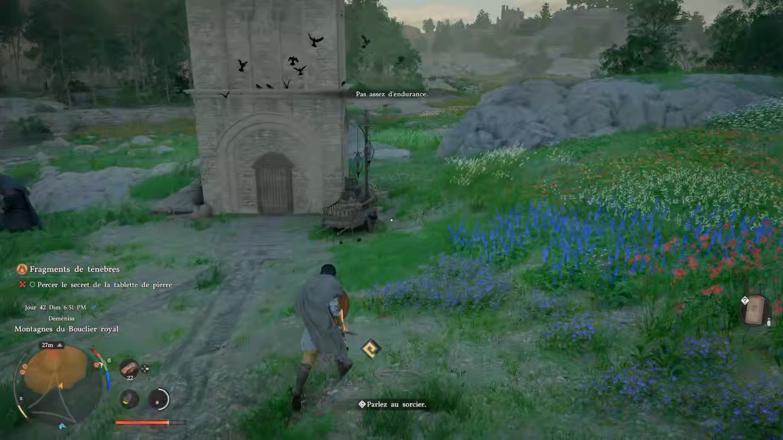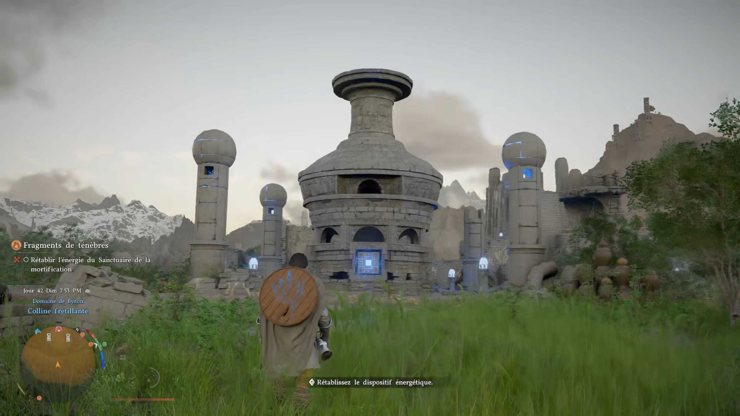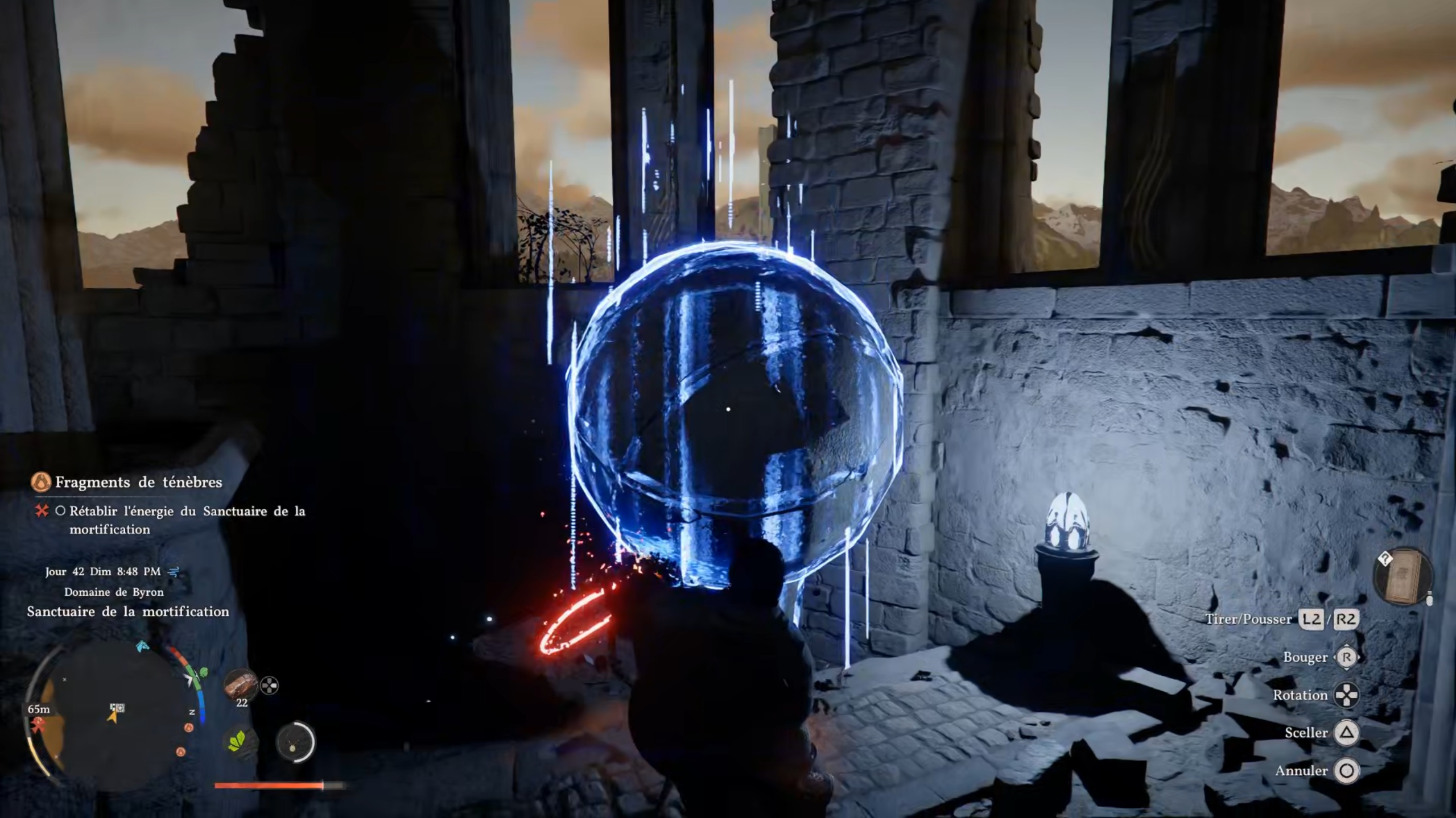 Dans la quête « Fragments de ténèbre », rejoignez le point indiqué sur votre carte pour atteindre une tour. Entrez à l’intérieur et examinez le sommet afin de trouver un tableau avec lequel interagir. Rejoignez ensuite la seconde position indiquée pour atteindre un sanctuaire. Éliminez les menaces sur place, puis consultez votre carte pour repérer les artefacts manquants. Le premier se trouve dans la tour : utilisez la force axiomatique, puis scellez-le dans votre chaudron pour le récupérer. Sortez-le à l’extérieur, puis placez-le au sommet d’un pilier et fixez-le à l’aide d’un coup de paume.