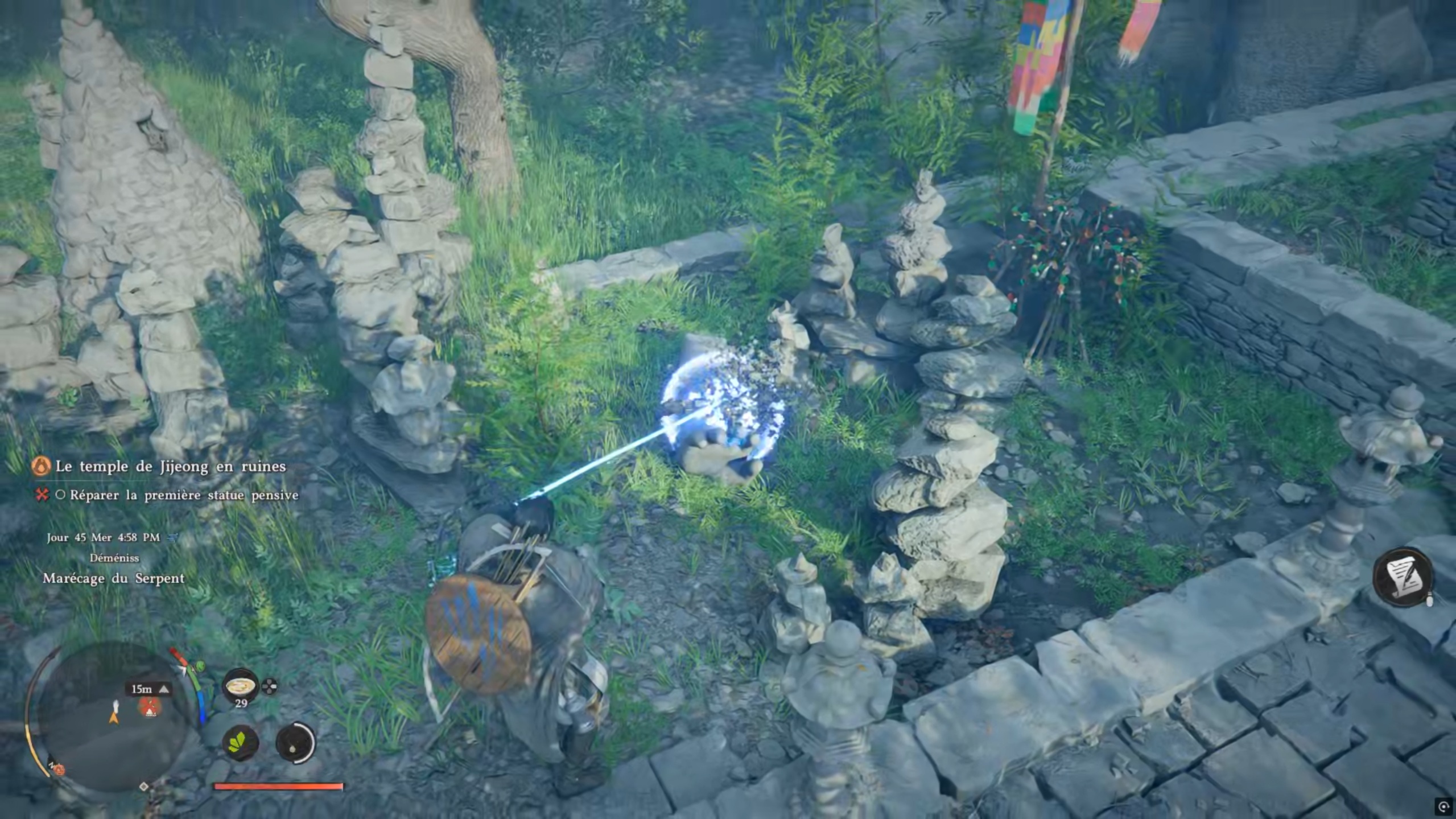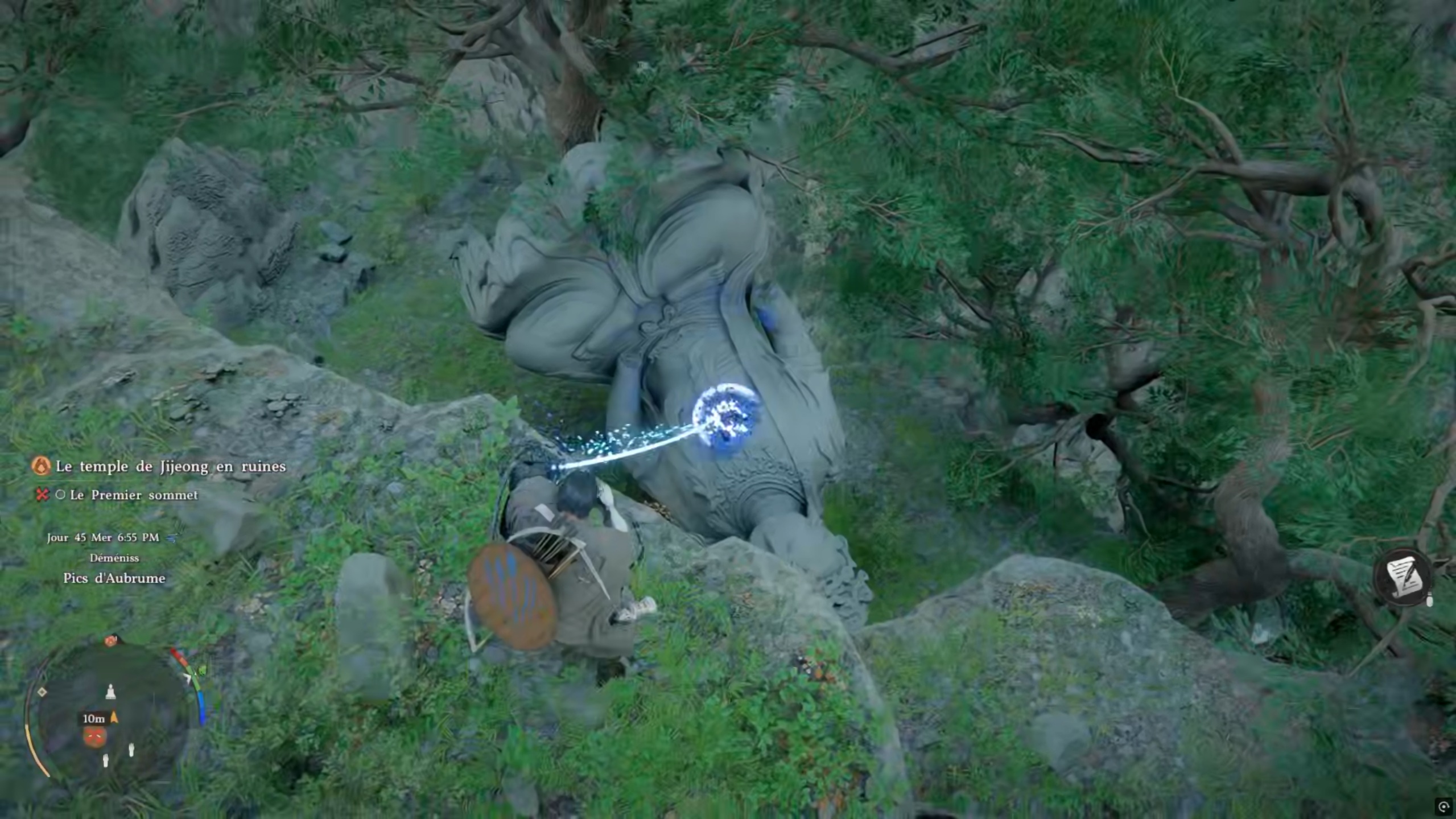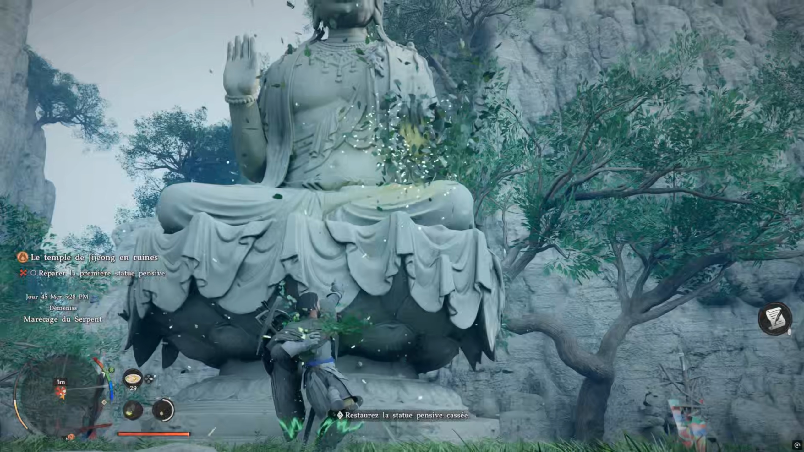 Suivez la quête « Brume matinale » pour trouver la position du temple de Jijeong. Sur place, parlez au moine en chef. Suivez ensuite le second repère pour déclencher une cinématique et être confronté à votre première statue à réparer.