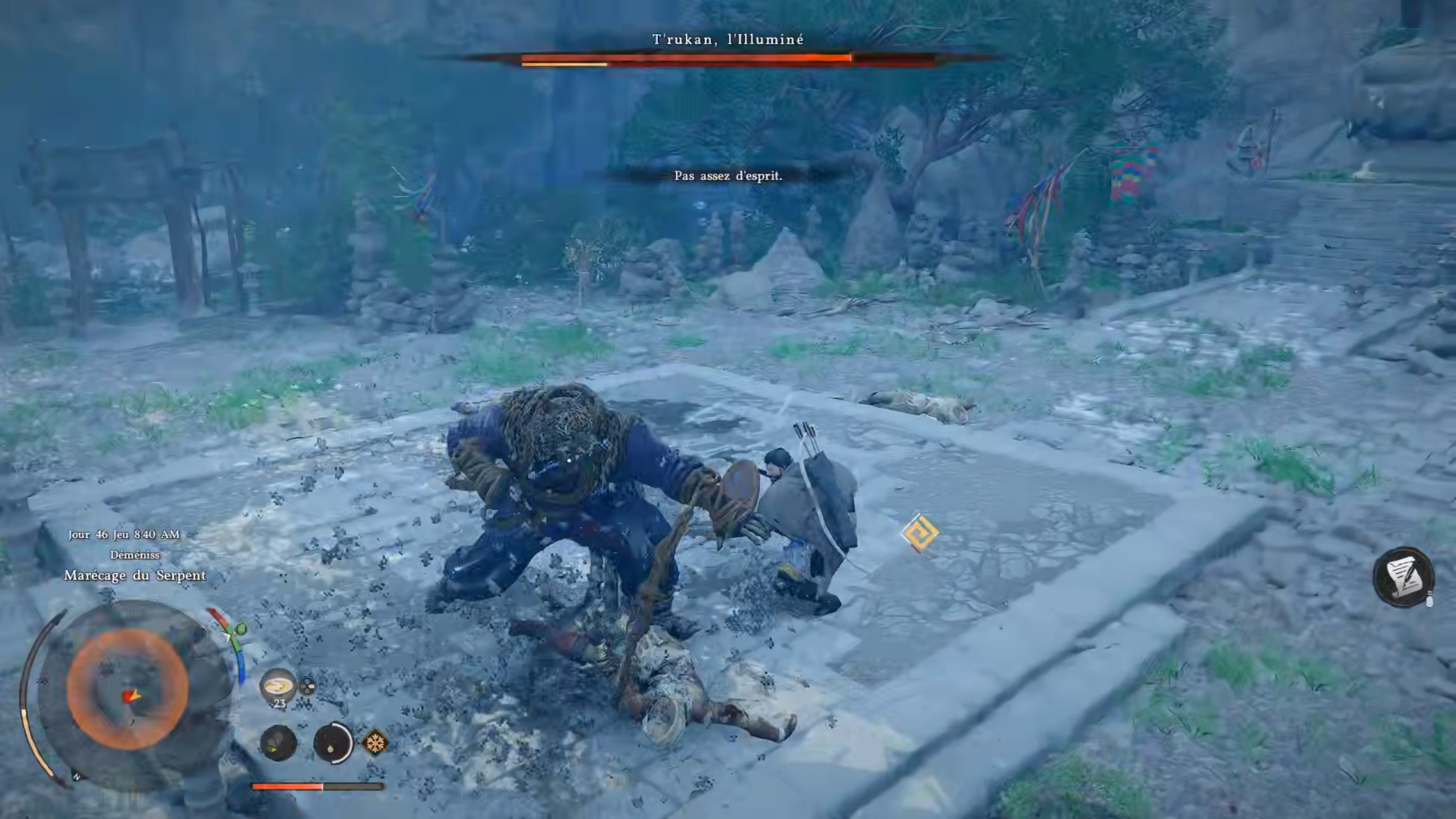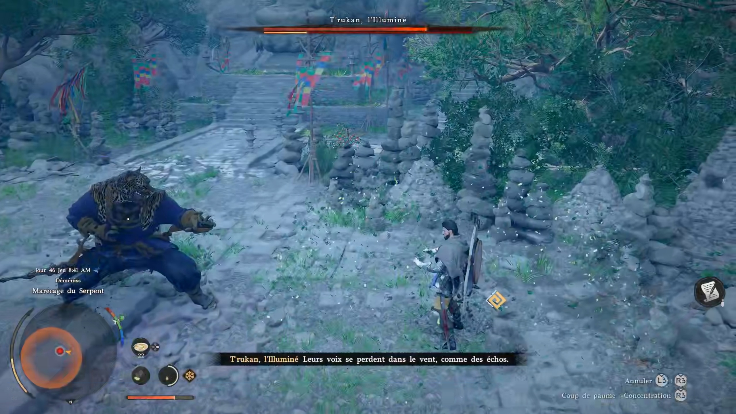 Dans la quête « La vraie force », vous devrez affronter King de Tekken… T’rukan, pardon. Comme pour chaque boss, utilisez les esquives et les attaques lourdes pour le vaincre facilement. Faites le plein de bouillon clair et de vivres afin de récupérer votre vie si nécessaire. Suivez ensuite la quête « Affrontez son soi intérieur » pour rejoindre le repère sur votre carte et terminer les missions du temple.