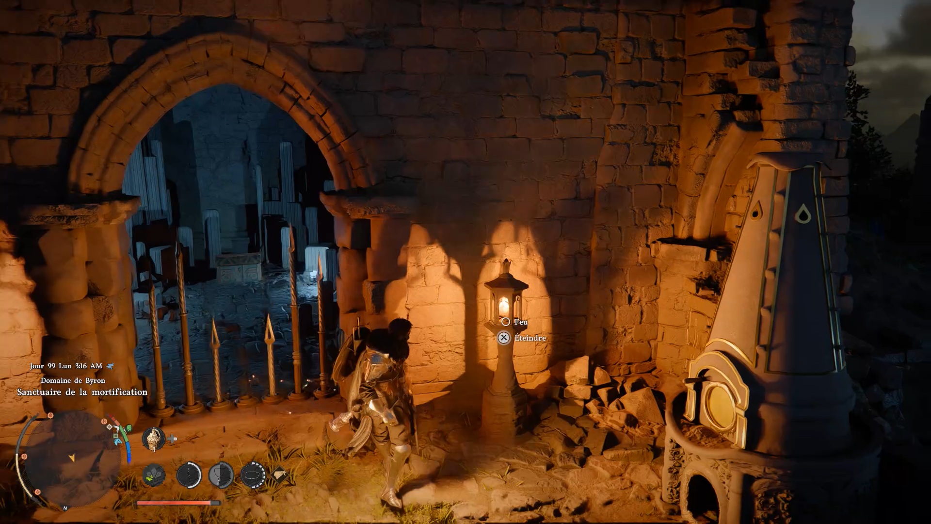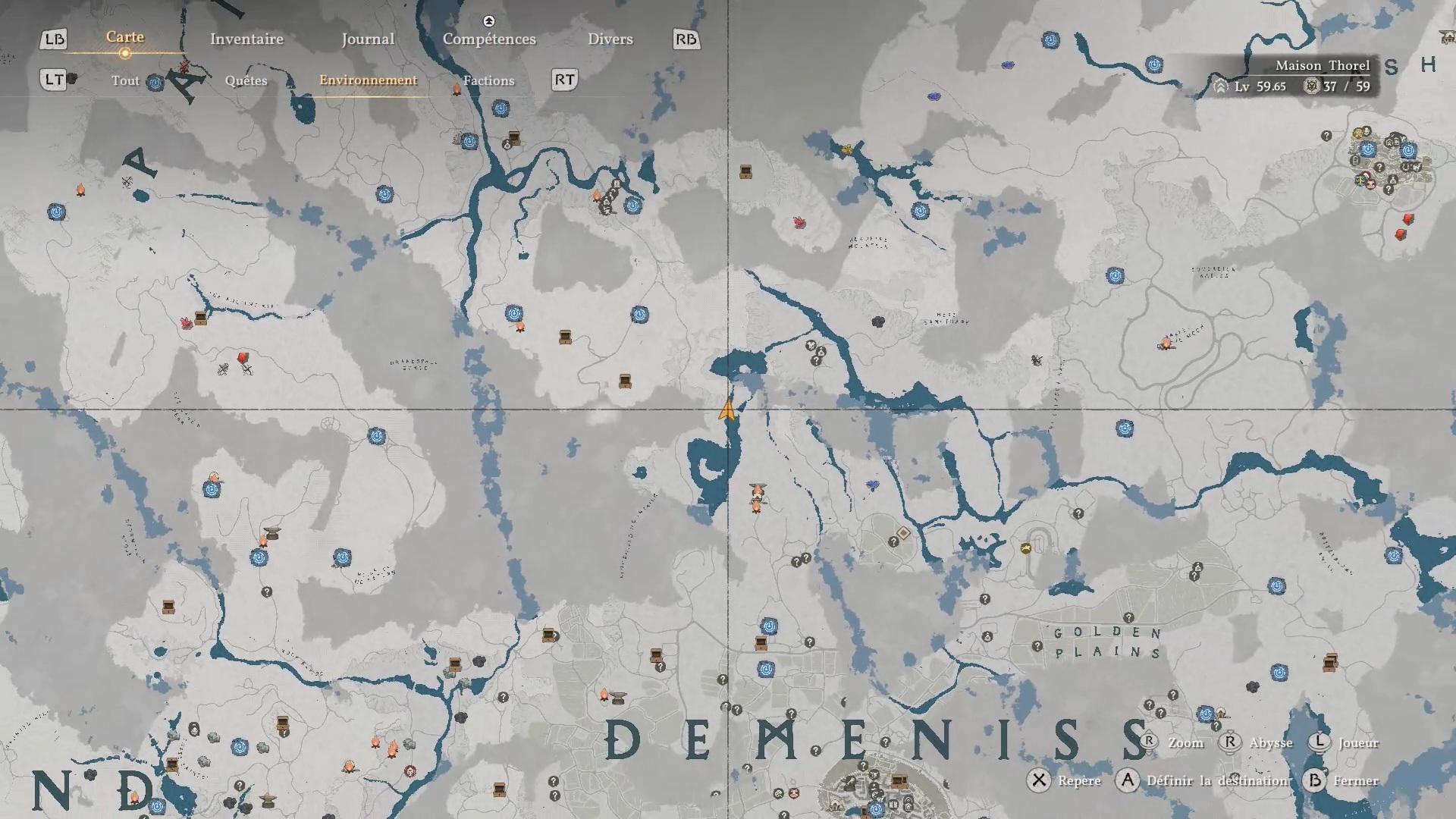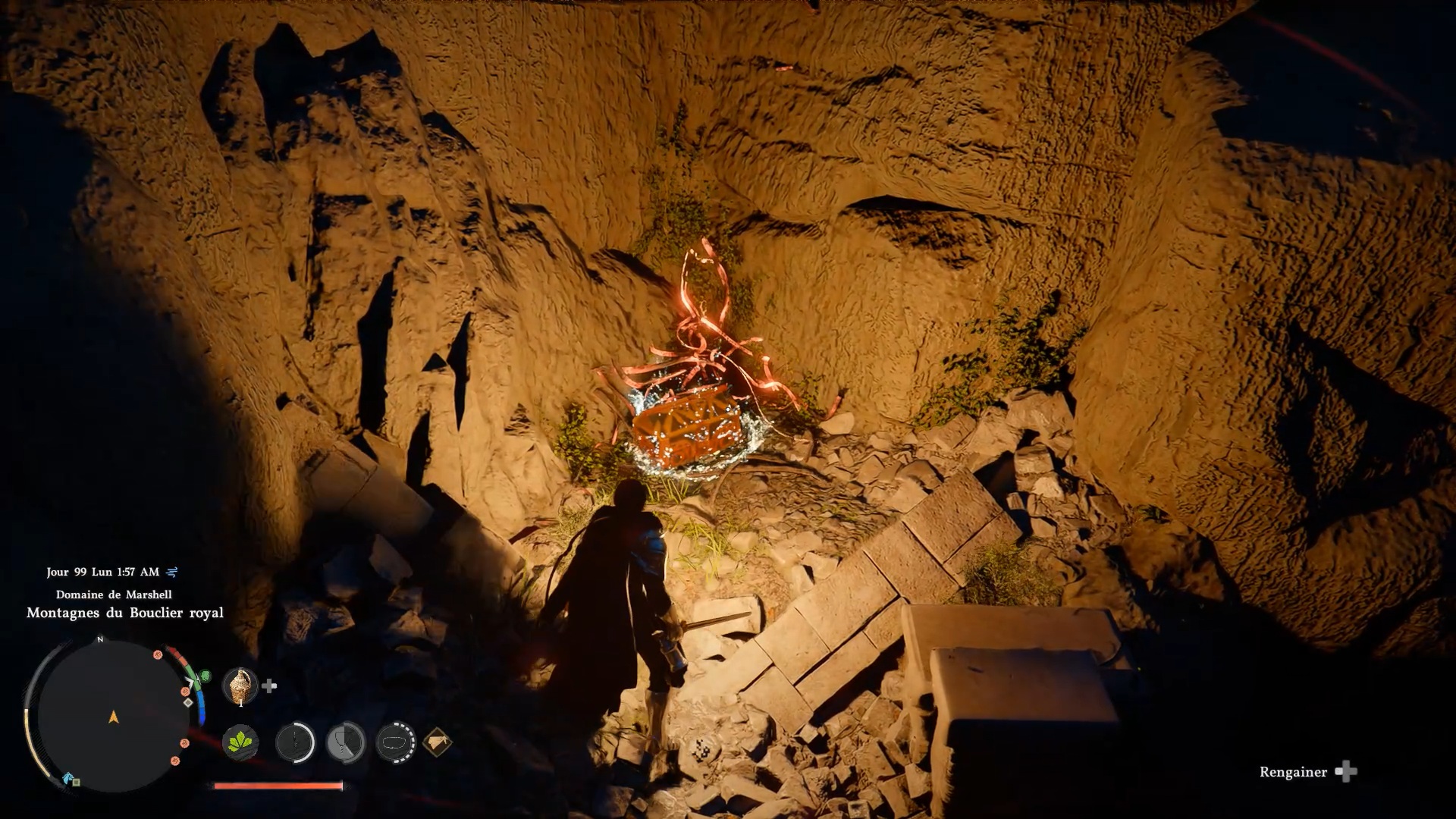 Le heaume de plates de banquet d’automne se situe dans un gouffre au nord-ouest de « Demeniss », à l’ouest de « Kingsheidl Mountains ». Plongez dans le gouffre à l’emplacement indiqué pour repérer un amas de ronces bloquant le passage. Utilisez la compétence « Collecte de lumière » pour brûler les ronces et libérer l’accès au coffre contenant le heaume.