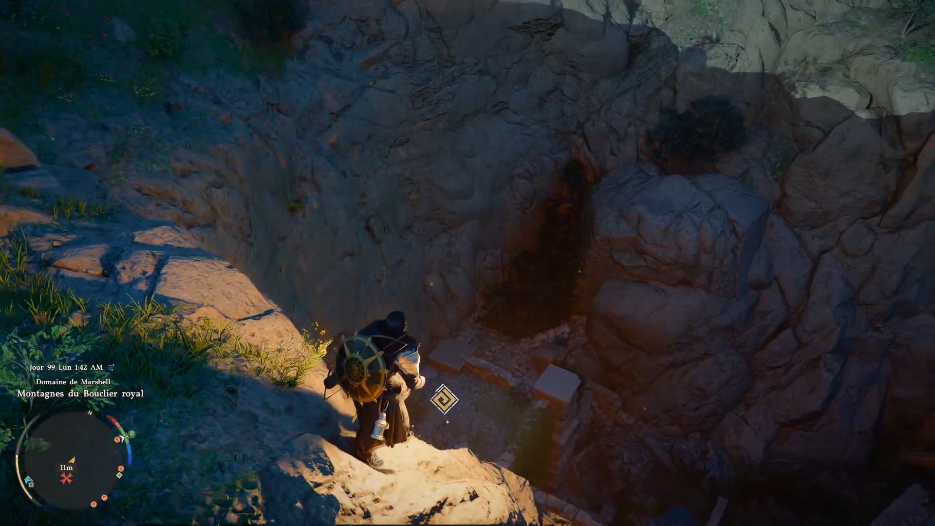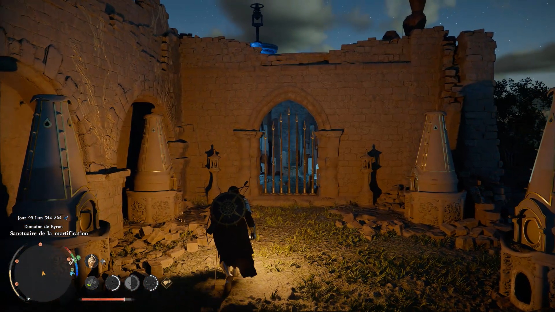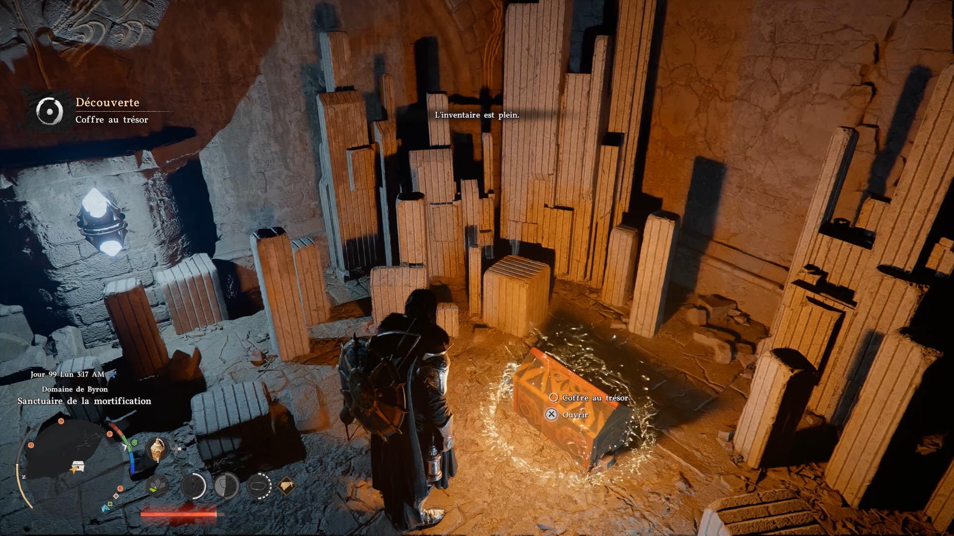 Le heaume de plates de banquet d’automne se situe dans un gouffre au nord-ouest de « Demeniss », à l’ouest de « Kingsheidl Mountains ». Plongez dans le gouffre à l’emplacement indiqué pour repérer un amas de ronces bloquant le passage. Utilisez la compétence « Collecte de lumière » pour brûler les ronces et libérer l’accès au coffre contenant le heaume.