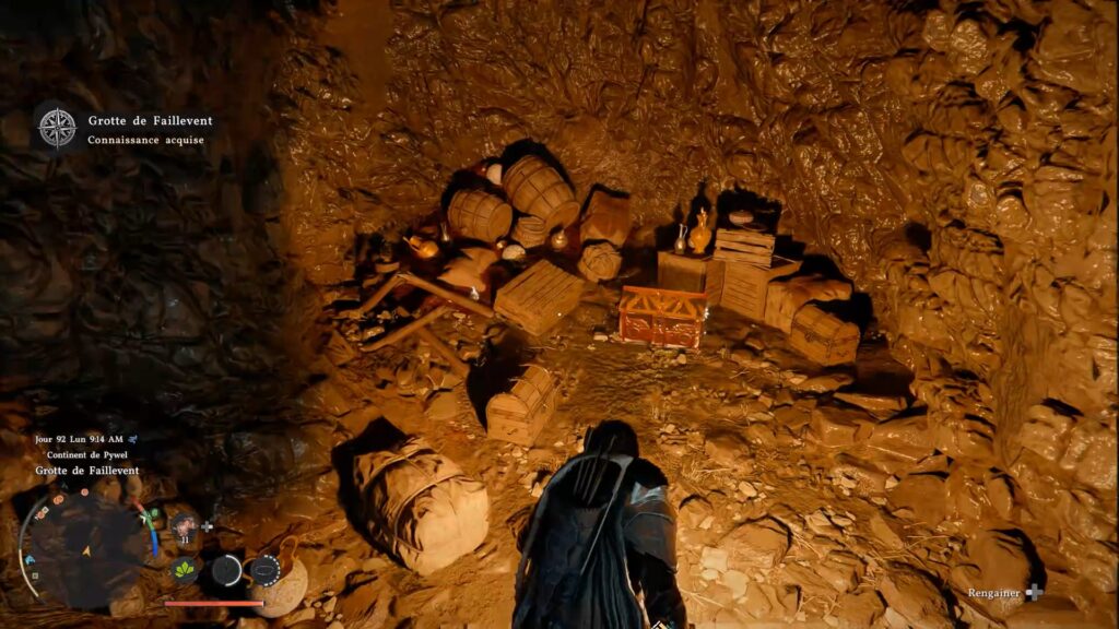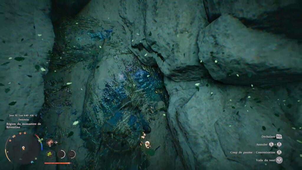 Les gants de plates de l’âme maudite se situent à l’ouest de « Demeniss », dans la « Grotte du Désir de la colline de l’Enclume ». L’emplacement se trouve à l’ouest de « Rocca’s Hill ». Au point indiqué, vous trouverez une grotte bloquée par un rocher. Utilisez la compétence « Concentration », puis enchaînez avec un « coup de paume » pour libérer le passage et atteindre le coffre contenant les gants.