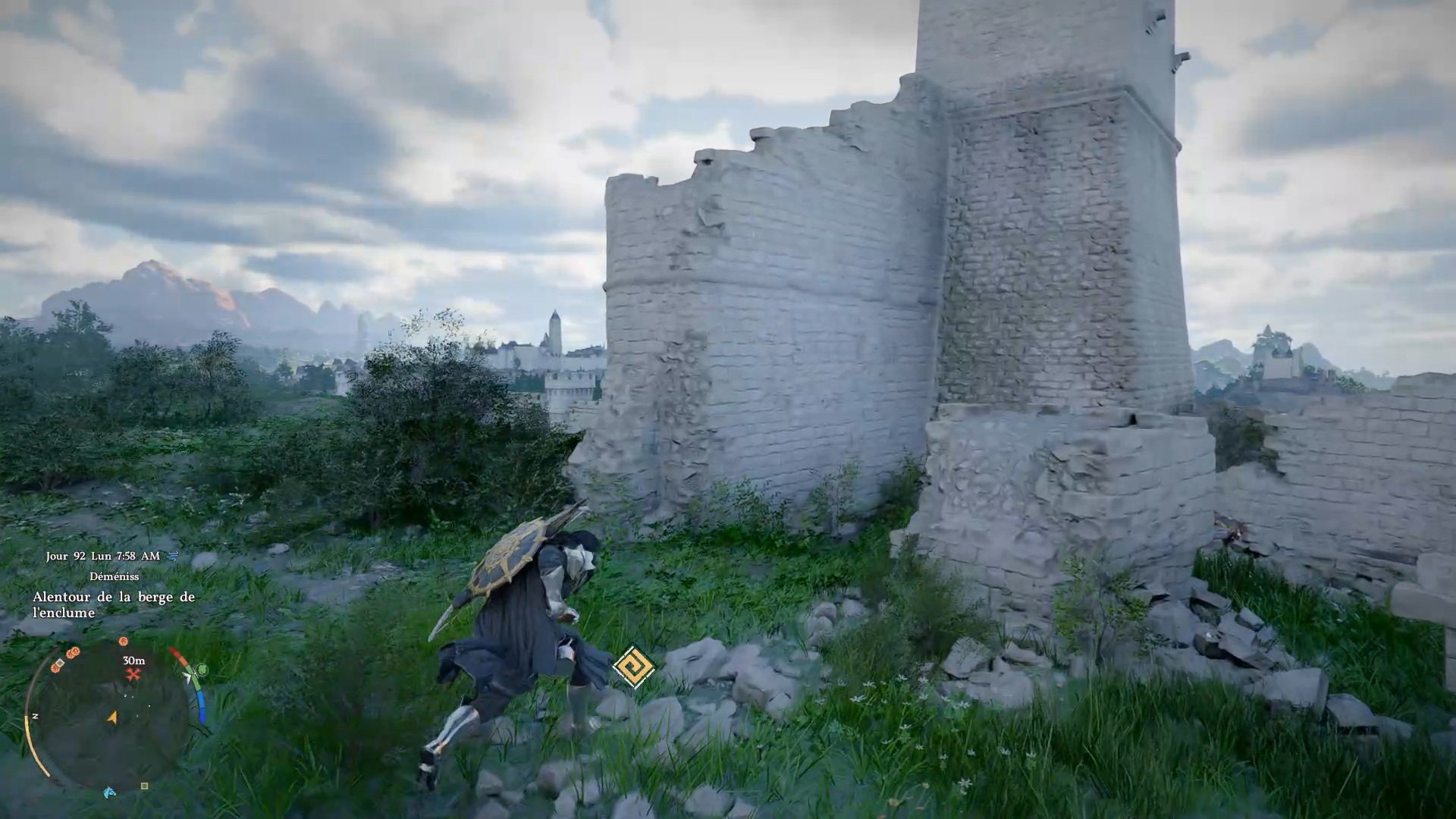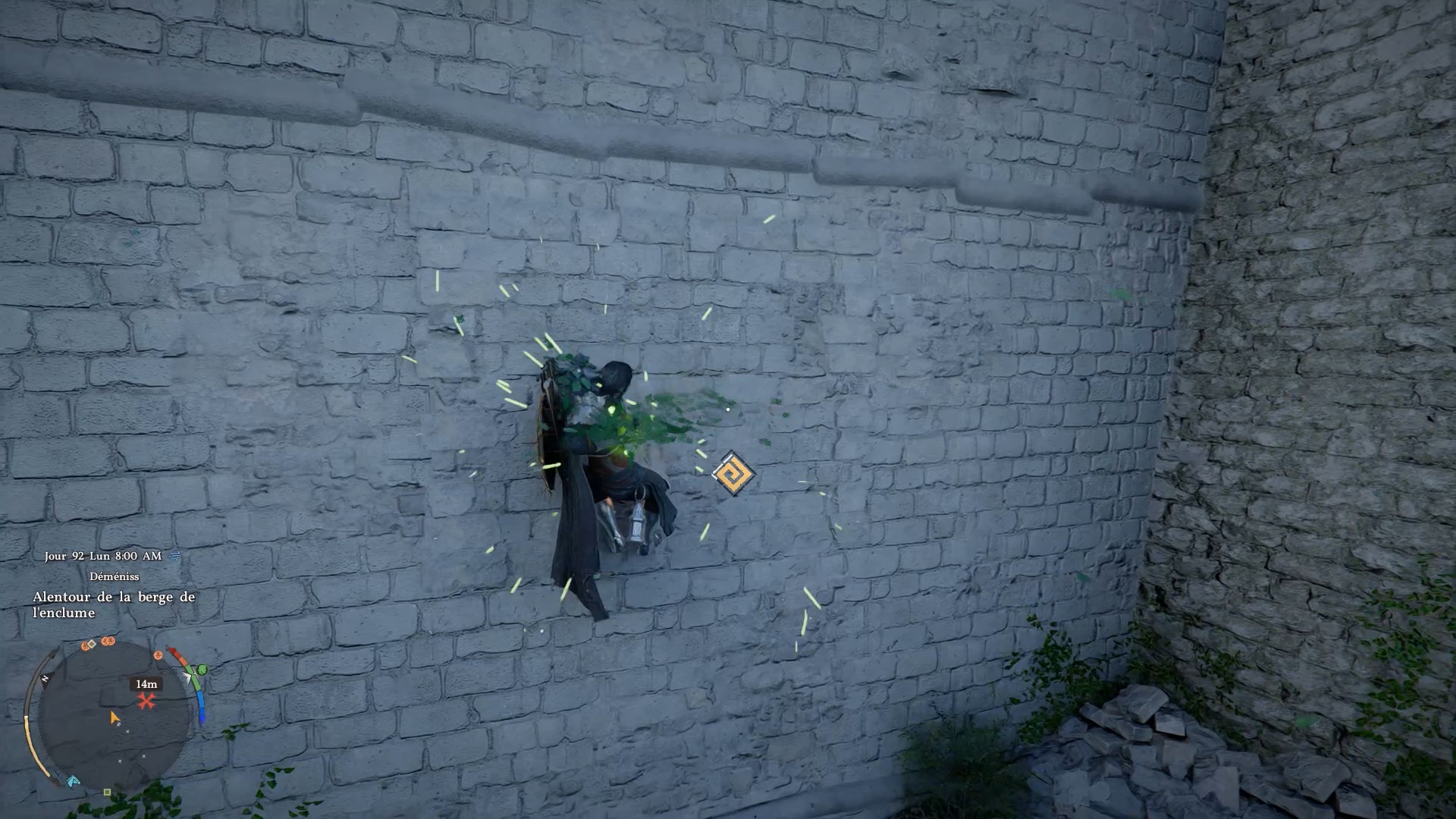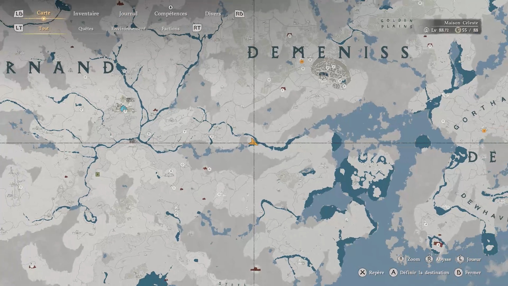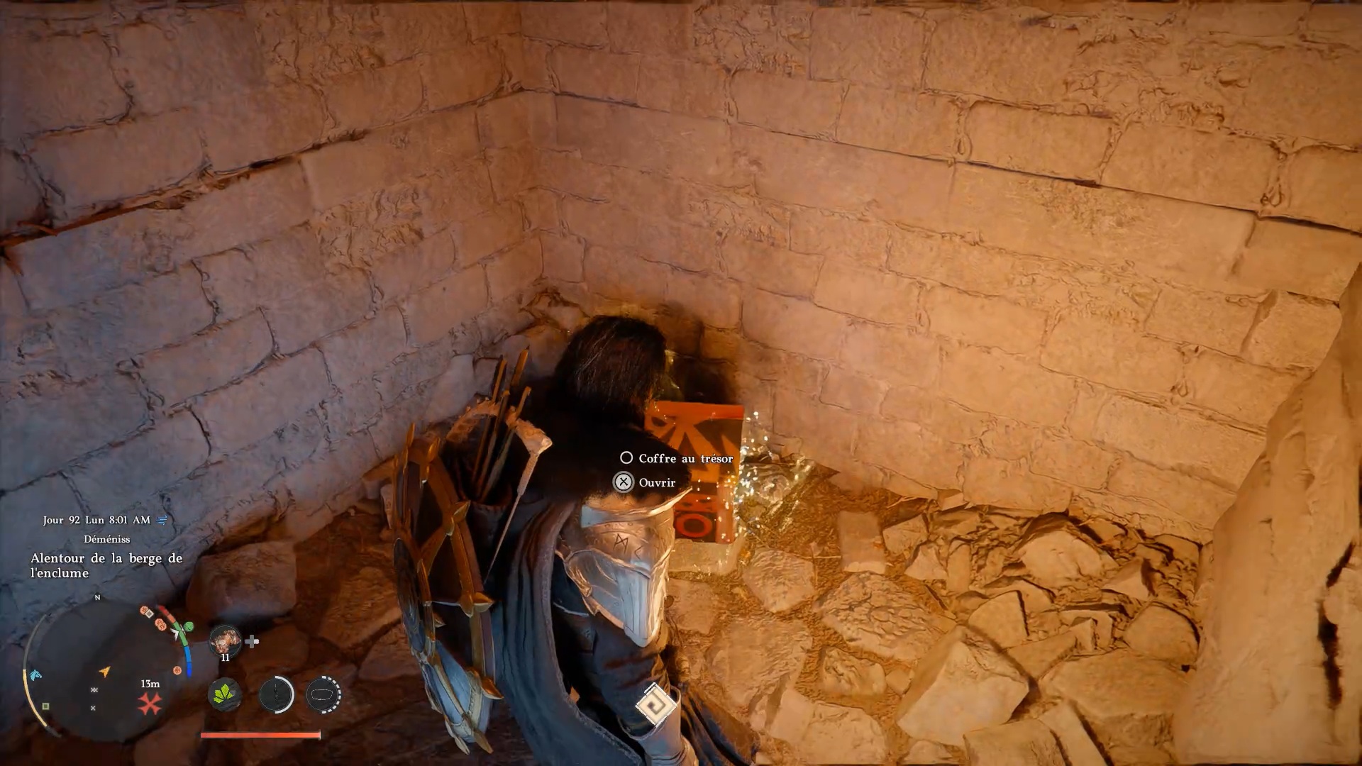 La cape de plates de l’âme maudite se situe à l’est des « Ruines déménissiennes », au sud-ouest de « Demeniss » et à l’est de « Anvill Hill ». Dirigez-vous au nord-est des ruines pour repérer une tour en ruine adossée à un pan de mur. Vous devez grimper sur la façade, en visant une zone carrée en briques, différente du reste du mur. Une fois en position, agrippez-vous avec la commande « Résister », puis utilisez la compétence « coup de paume » pour ouvrir un passage et atteindre le coffre contenant la cape.