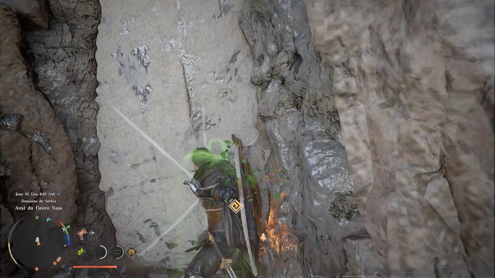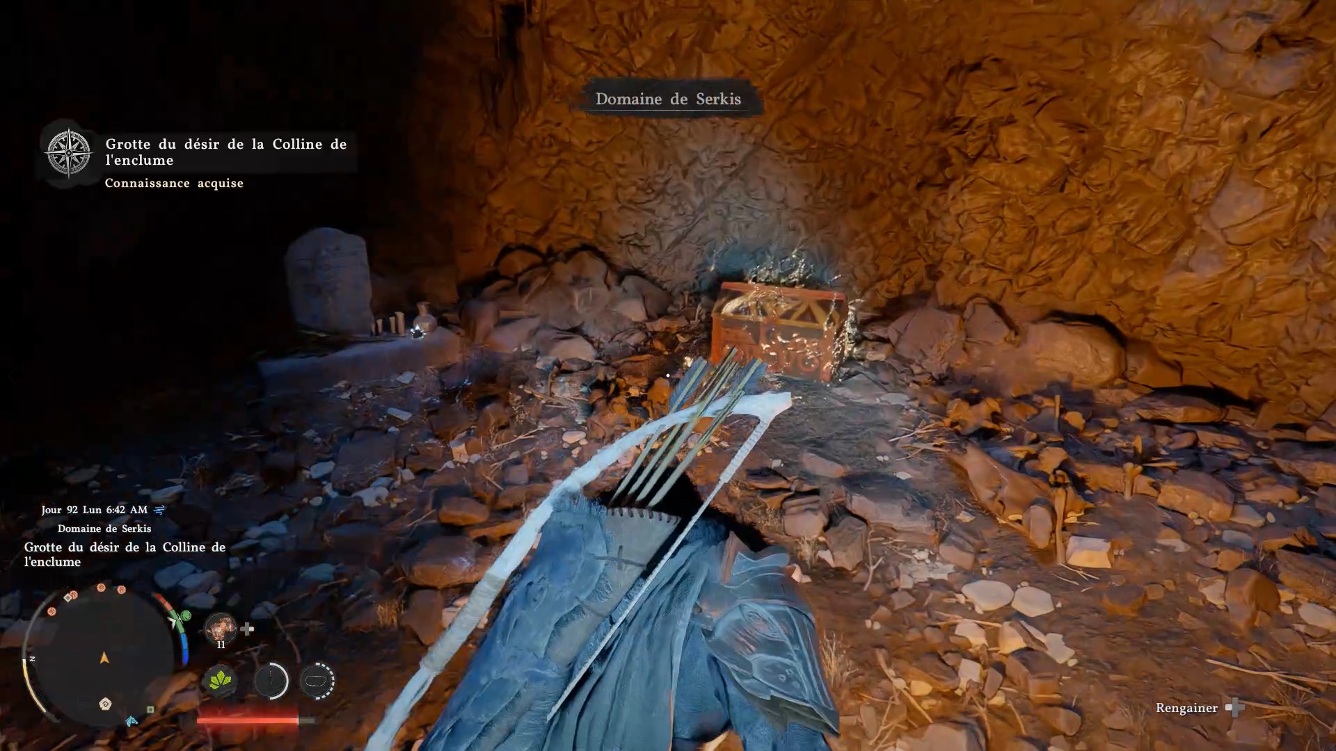 Les gants de plates de l’âme maudite se situent à l’ouest de « Demeniss », dans la « Grotte du Désir de la colline de l’Enclume ». L’emplacement se trouve à l’ouest de « Rocca’s Hill ». Au point indiqué, vous trouverez une grotte bloquée par un rocher. Utilisez la compétence « Concentration », puis enchaînez avec un « coup de paume » pour libérer le passage et atteindre le coffre contenant les gants.