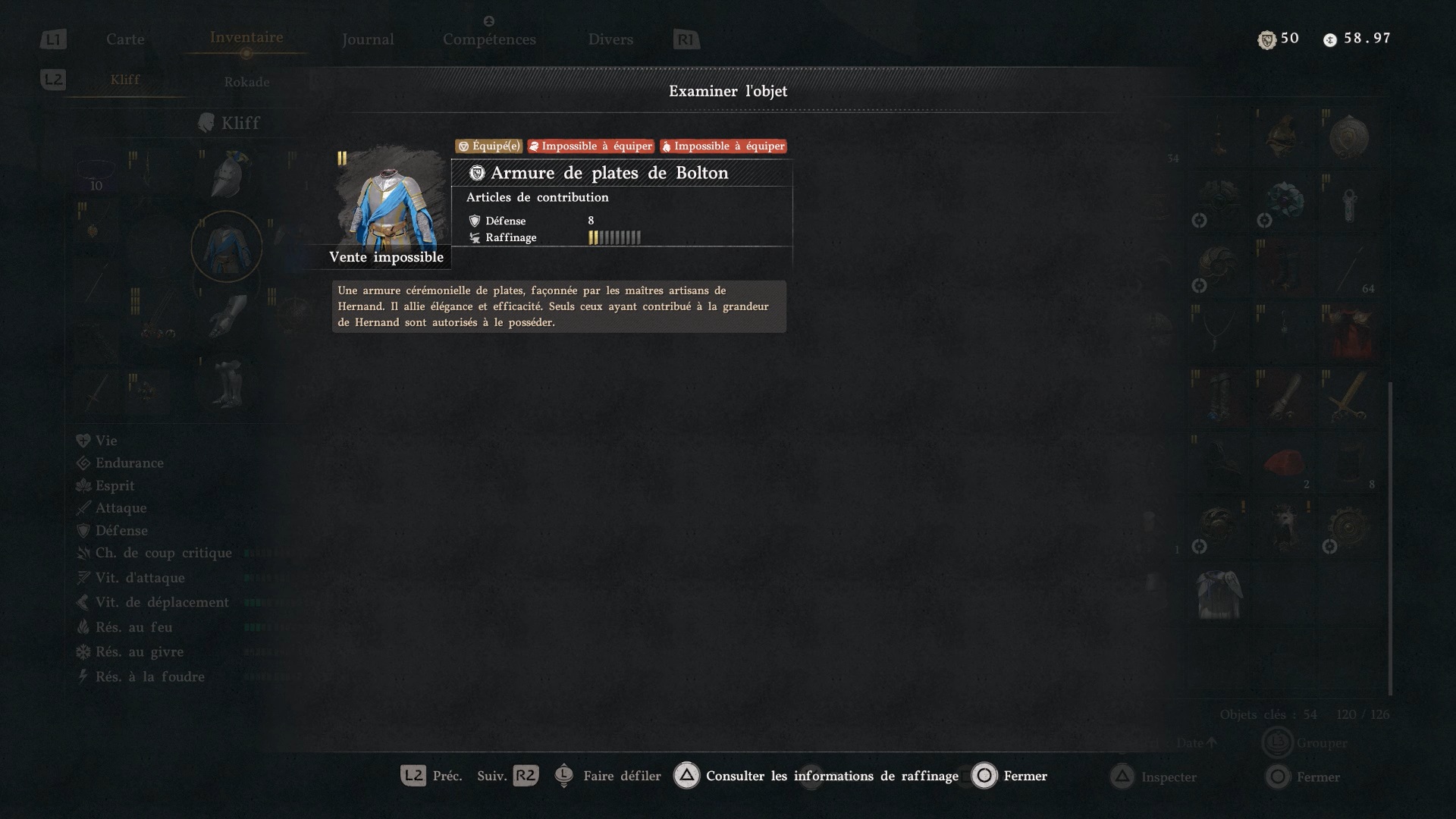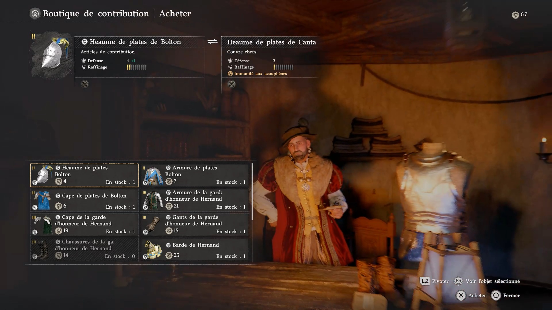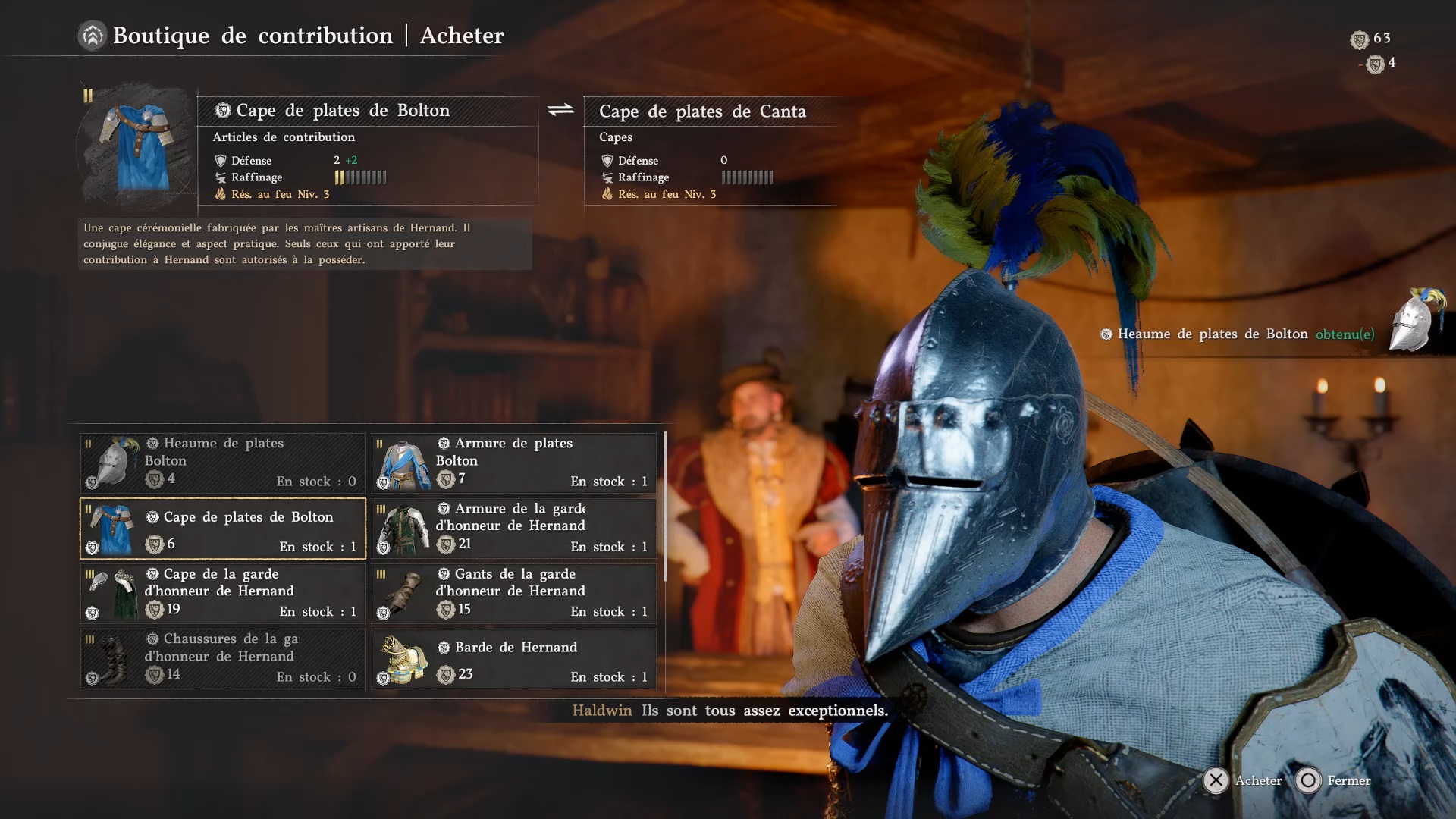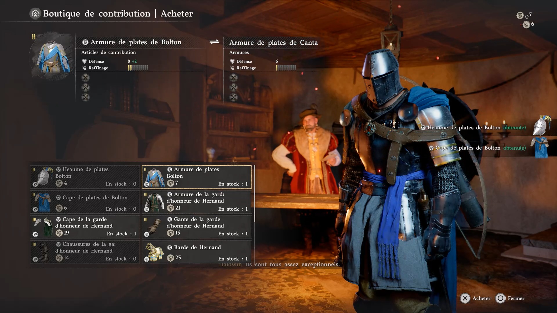 L’armure de plates de bolton s’achète directment à Hernand à la boutique de contribution près du château. Pour débloquer ces récompenses dans la boutique, avancez dans les quêtes d’hernand pour augmenter votre contribution à la région.