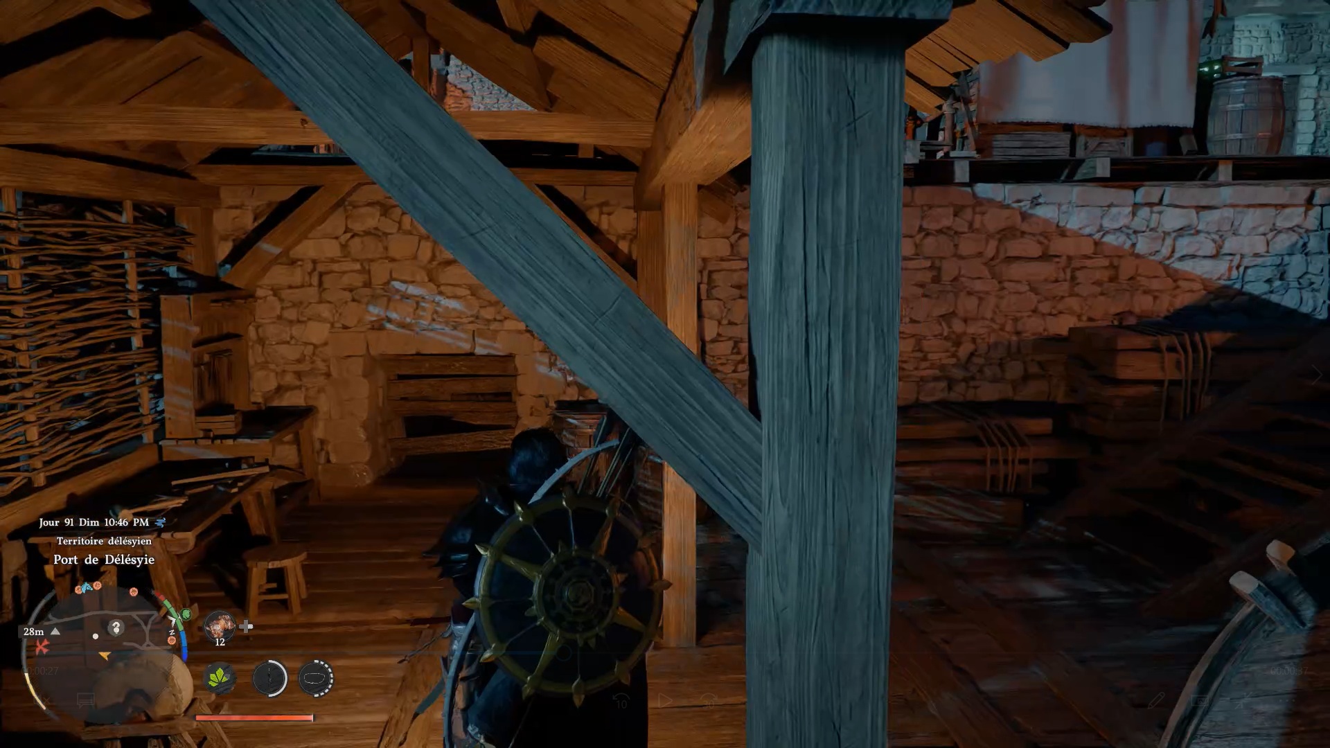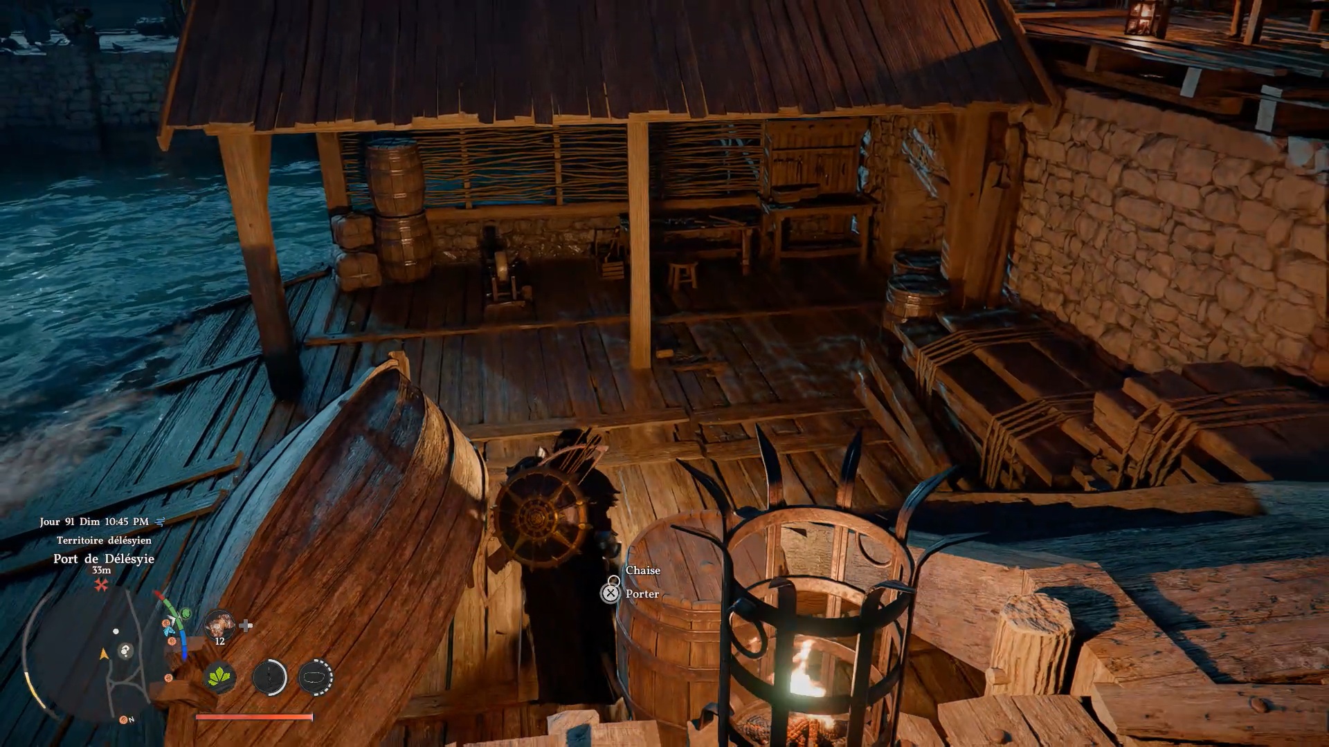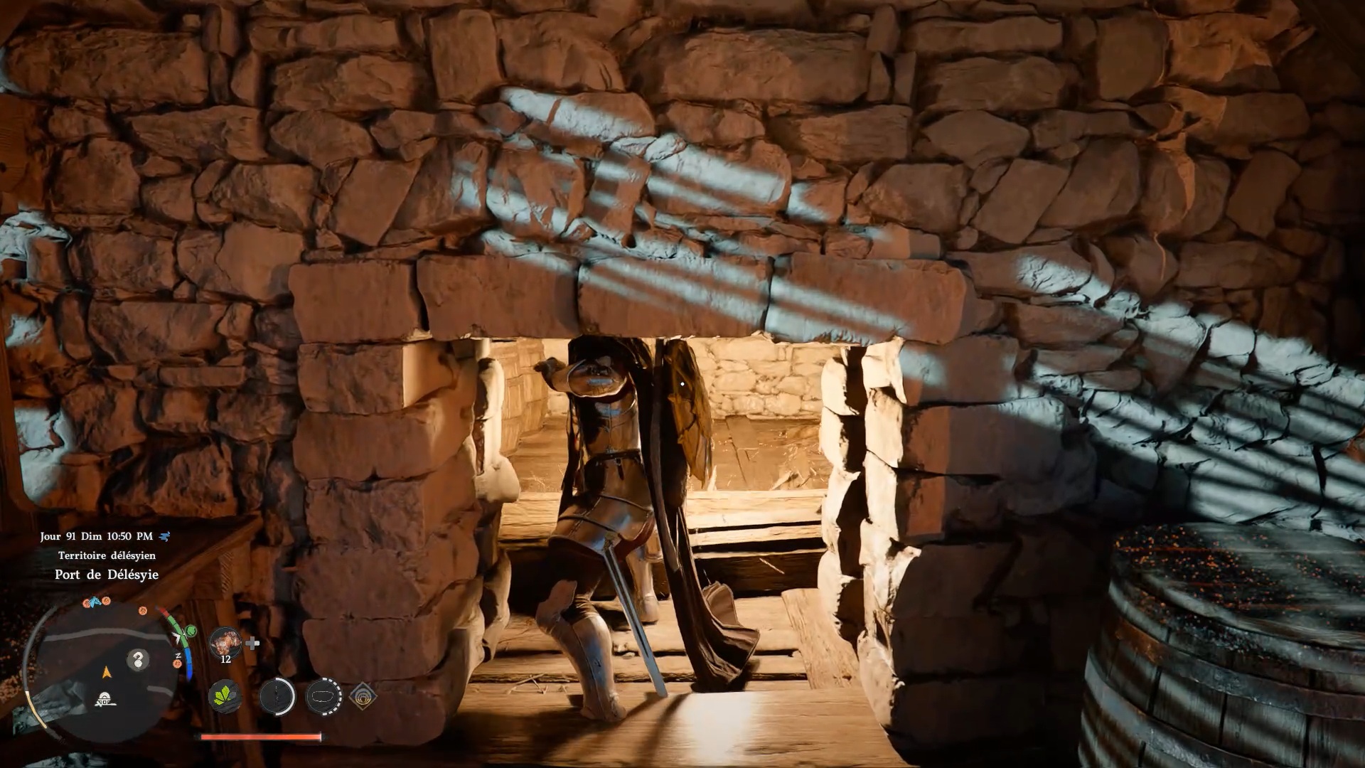 Pour obtenir les gants de plates de Cœur Gelé, dirigez-vous au nord-est de « Delesyia », au niveau du port de Délesyie. Face au navire du port, vous trouverez un étal avec une pierre à aiguiser. À proximité, repérez un passage bloqué par des planches dans le mur. Accroupissez-vous, puis frappez les planches pour libérer le passage menant au coffre contenant les gants.
