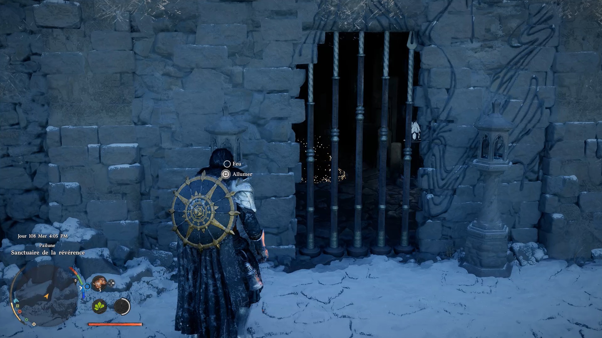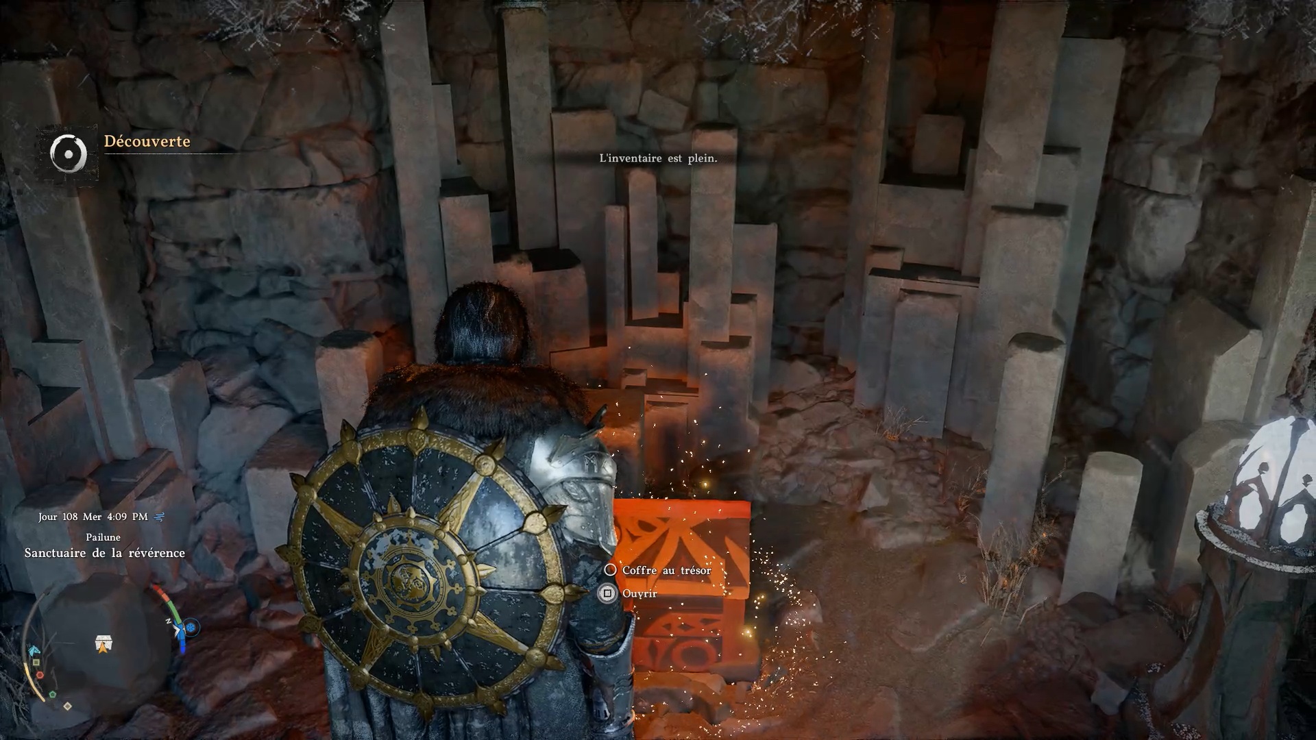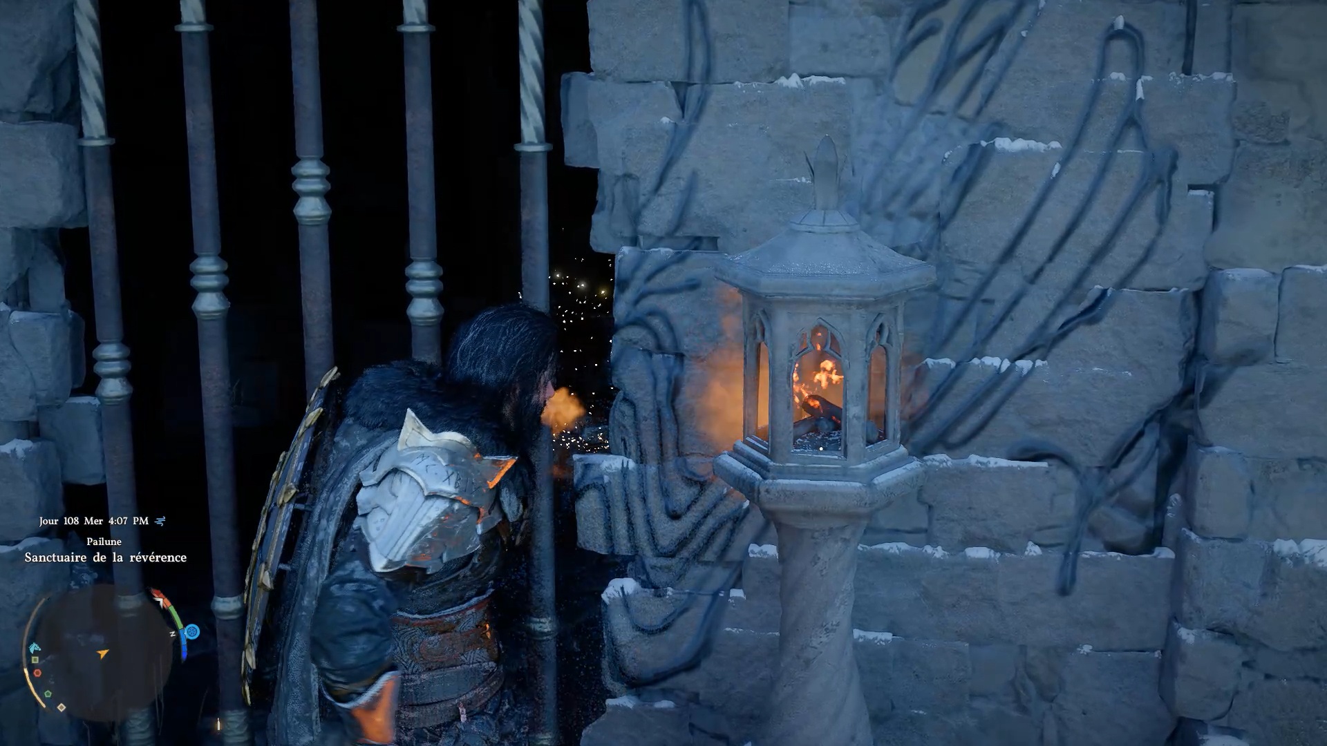 Les gants de plates d’Éclair se situent au nord-ouest de « Pailune », au niveau du « Sanctuaire de la Révérance ». Au sud du sanctuaire, vous trouverez un coffre bloqué par une grille. Allumez les deux lanternes de chaque côté de la grille pour débloquer l’accès au coffre.