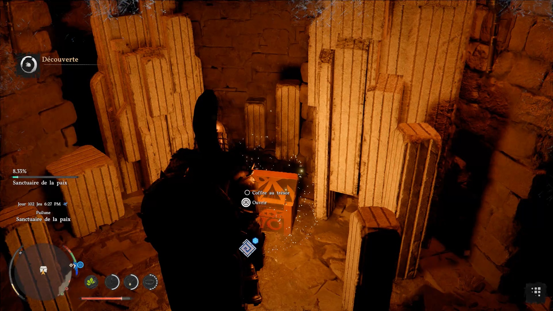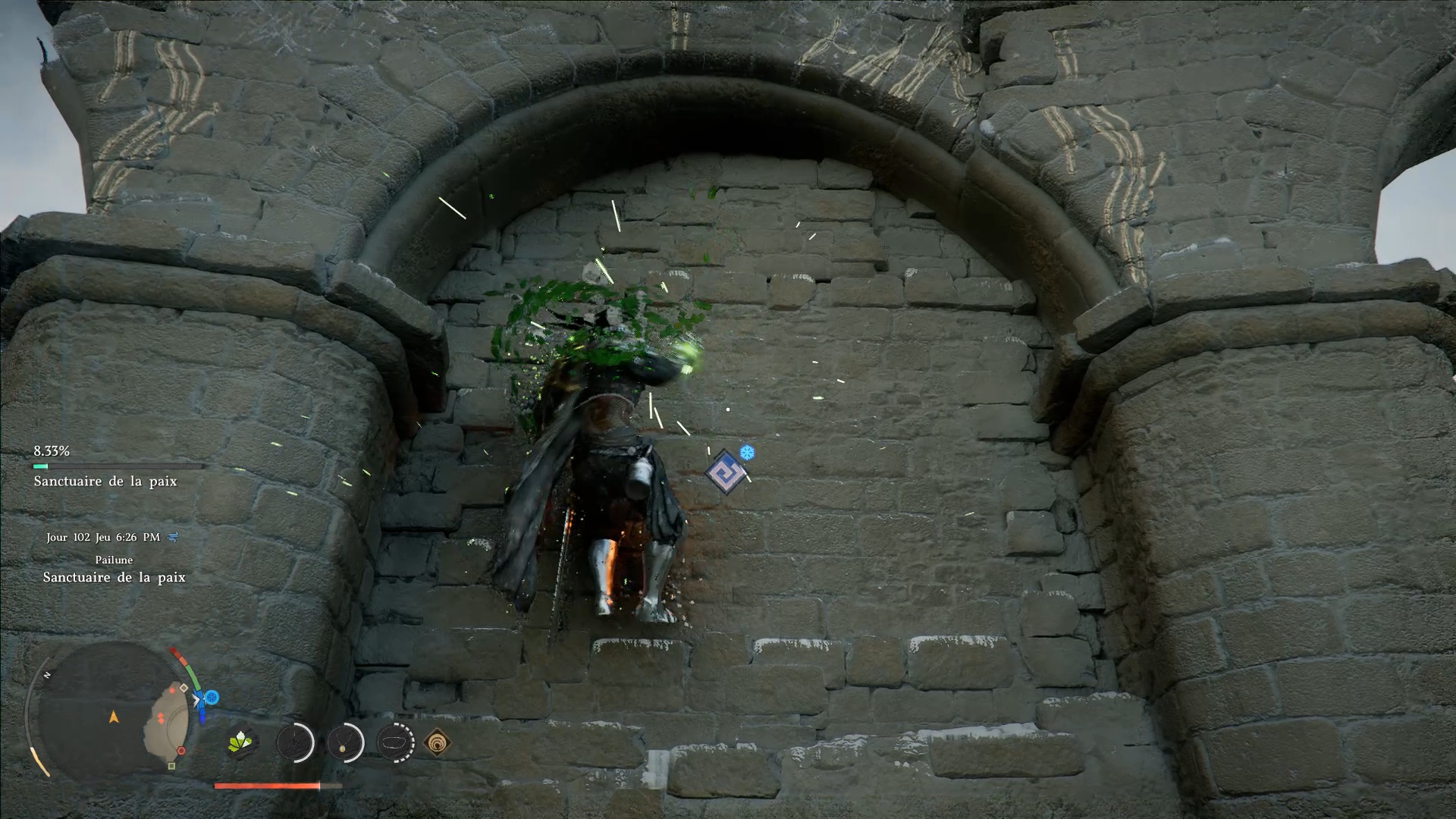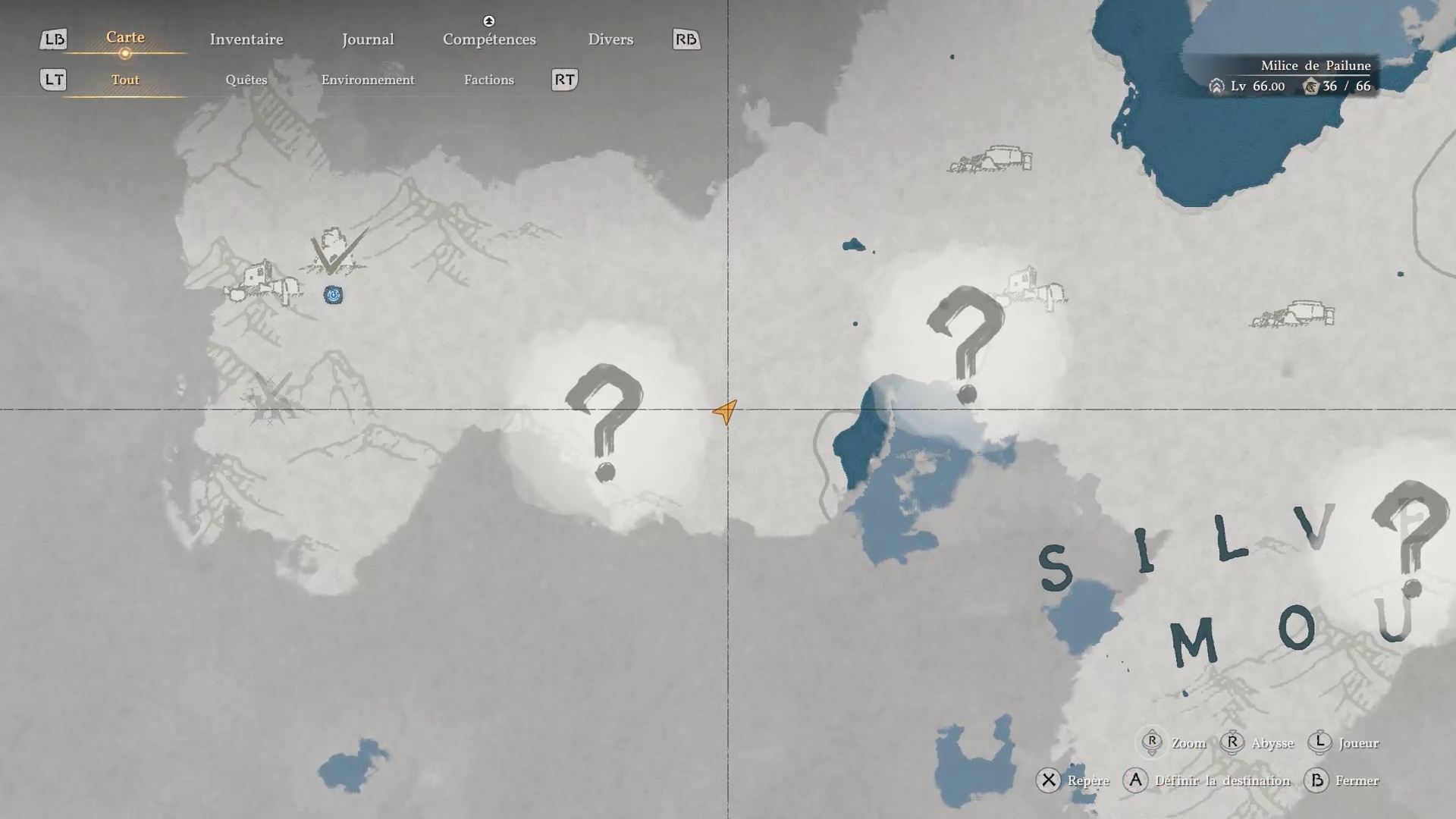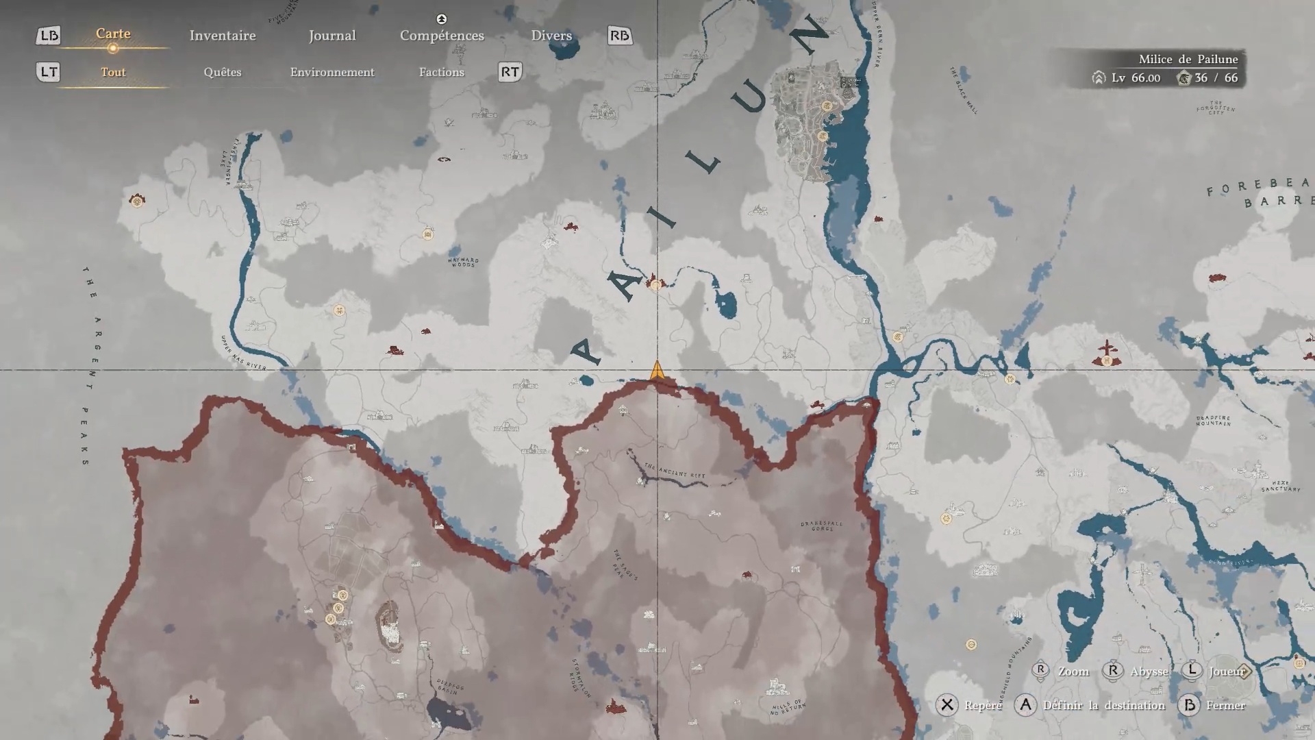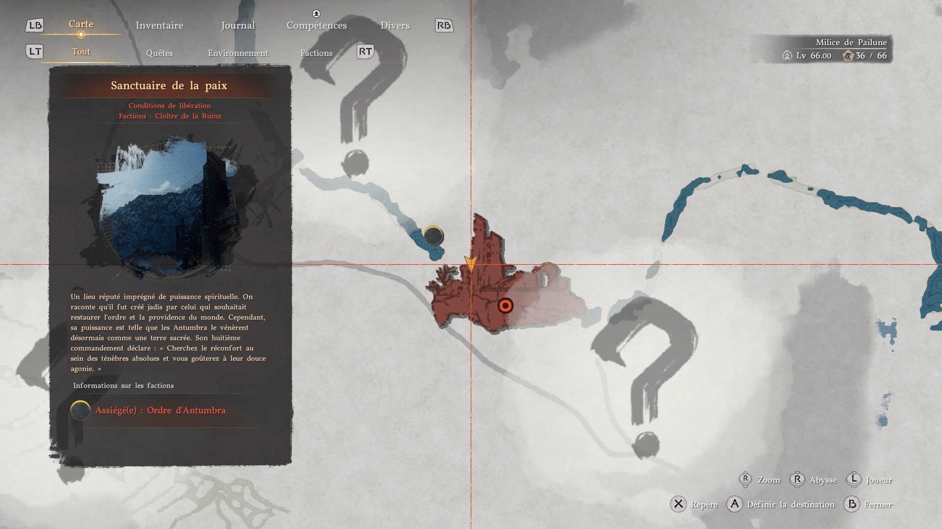 Les bottes de plates des Ailes gelées se situent au « Sanctuaire de la Paix », au centre de « Pailune ». L’emplacement exact correspond à la lettre « A » sur la carte. Une fois sur place, dirigez-vous vers l’ouest pour trouver une zone de combat avec le boss « Bâton d’Entumbra ». Une fois vaincu, repérez la façade en ruine la plus haute et grimpez dessus. En hauteur de la façade, vous verrez un carré de briques distinct du reste de la façade. Placez-vous au centre, puis utilisez la compétence « Résister », suivie d’un « coup de paume » pour ouvrir un passage menant au coffre contenant les bottes.
