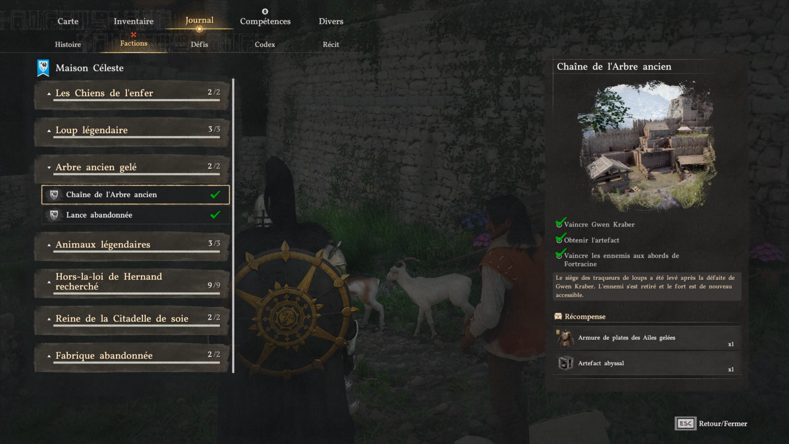 L‘armure de plates des Ailes gelées s’obtient en terminant la quête « Arbre ancien gelé » de la faction « Maison céleste », dans la région de « Hernand ». Pour débloquer cette quête, le cheminement peut varier d’un joueur à l’autre, mais voici les quêtes qui semblent indispensables à partir du moment où vous avez débloqué la quête « Loup légendaire » :