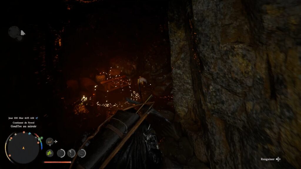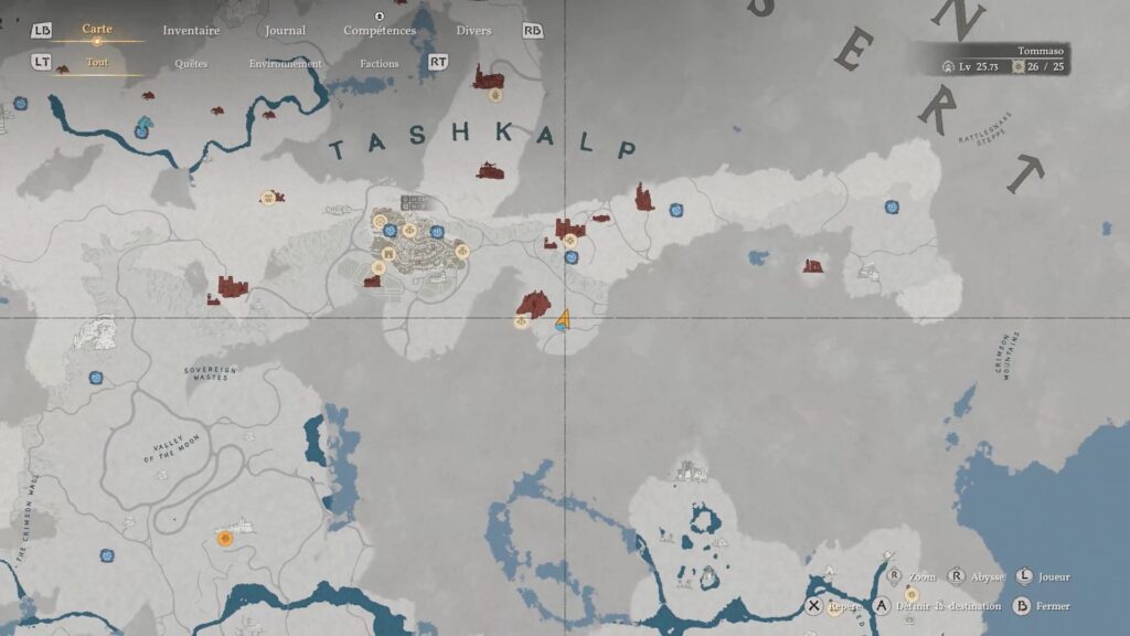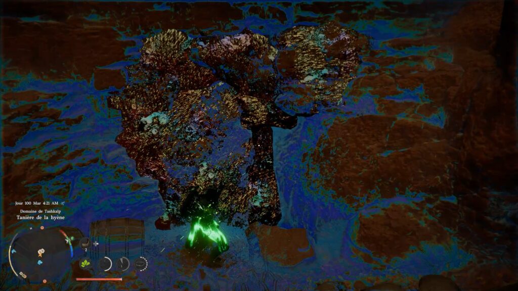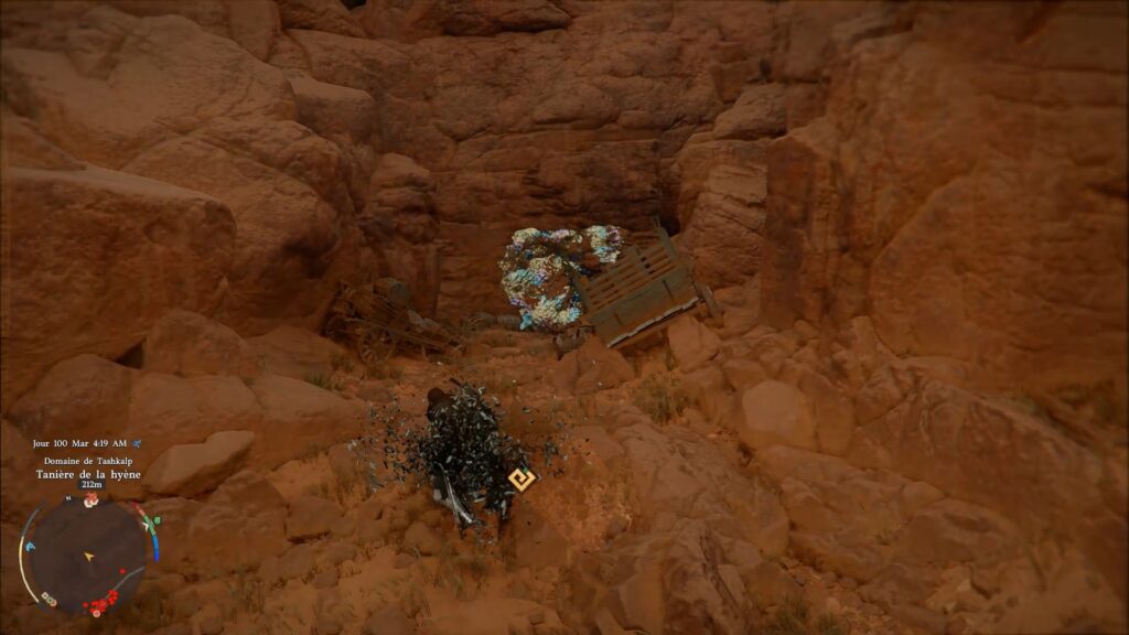 Les gants de plates de la gloire dorée se situent au sud de « Crimson Desert » et de « Tashkalp », à l’est de la tanière de la hyène. À l’emplacement indiqué, vous trouverez une grotte bloquée par un rocher. Utilisez la compétence « Concentration », puis enchaînez avec un « coup de paume » pour libérer le passage et accéder au coffre contenant les gants.