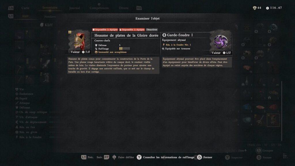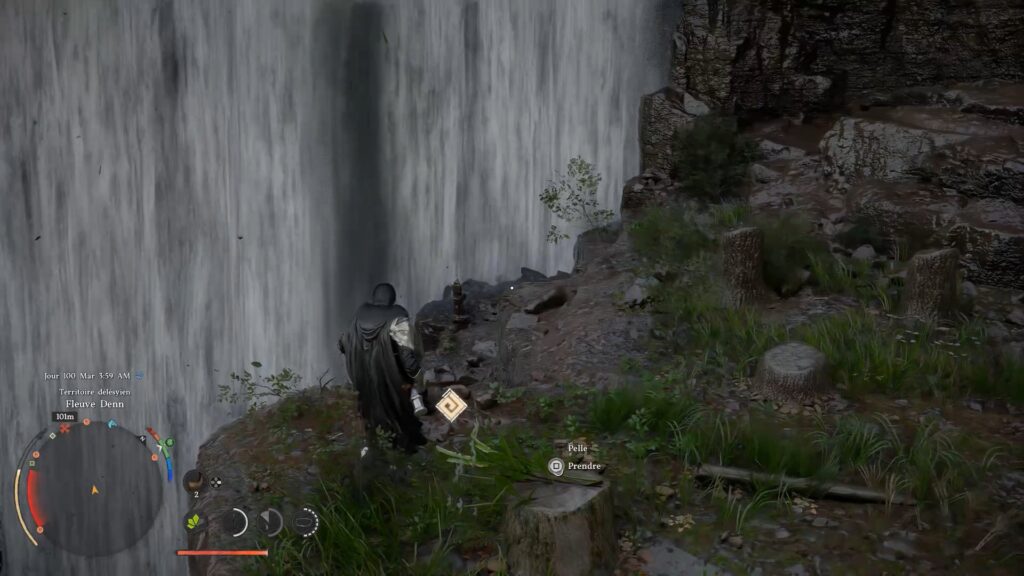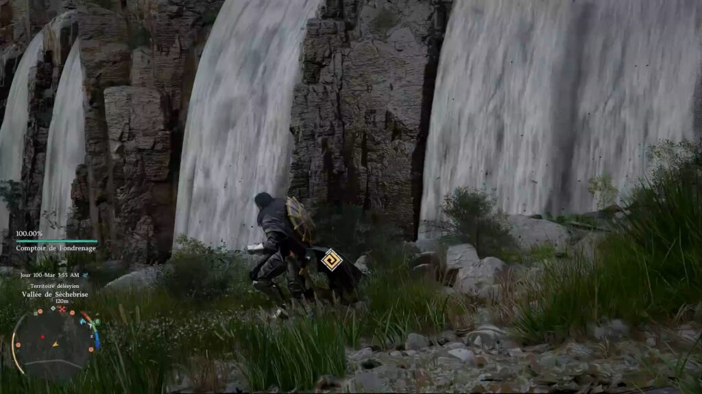 Le heaume de plates de la gloire dorée se situe dans la grotte du Gouffre au Miroir, derrière une cascade au nord-est de «Demeniss» et à l’ouest de «Drywind Valley» . Dans la zone indiquée, vous trouverez plusieurs cascades : dirigez-vous vers celle de droite, reconnaissable à une statuette composée de trois pierres à ses pieds. Une fois devant, approchez-vous de l’eau et utilisez la compétence « Perforation » pour traverser le mur d’eau. Vous accéderez alors à une grotte cachée, où se trouve le coffre contenant ce heaume.