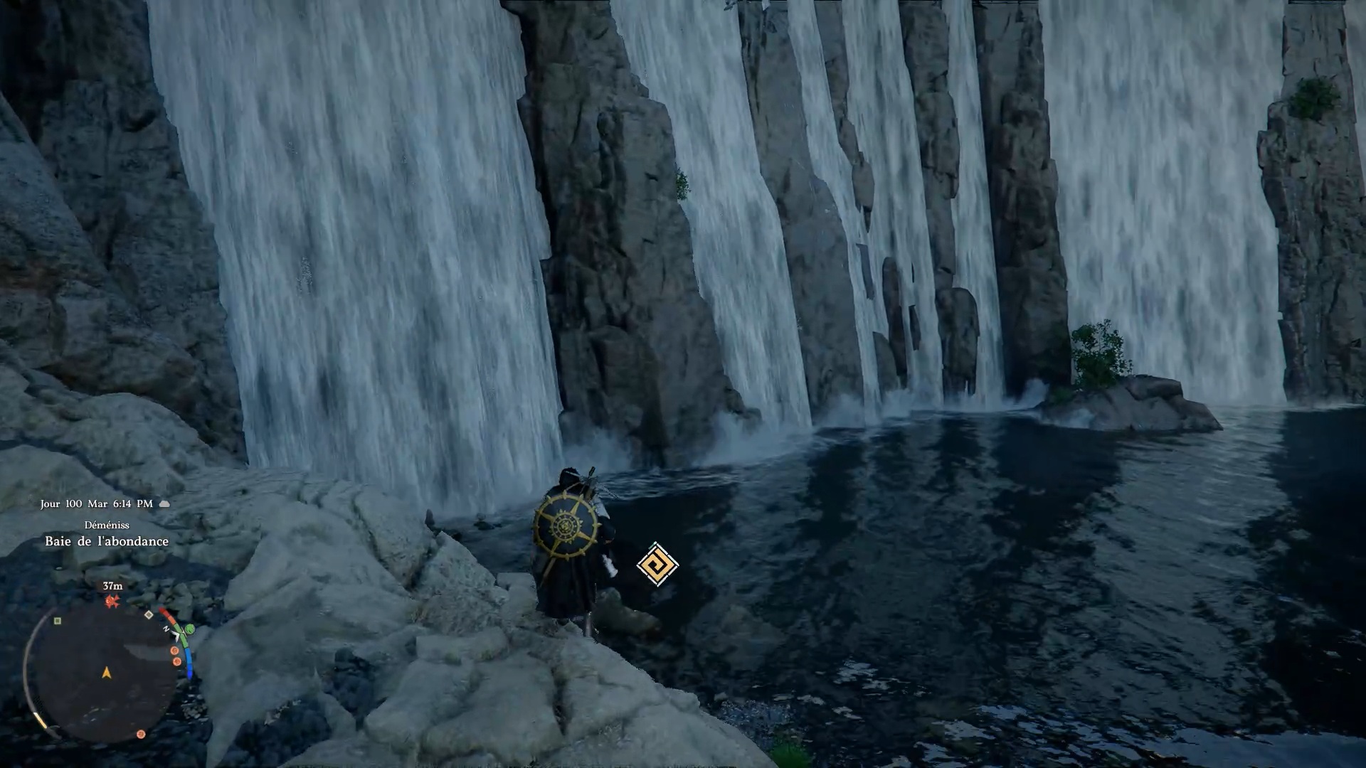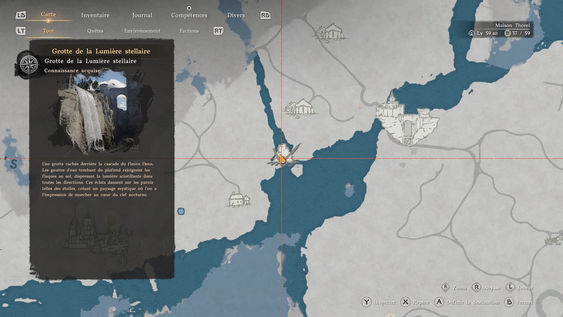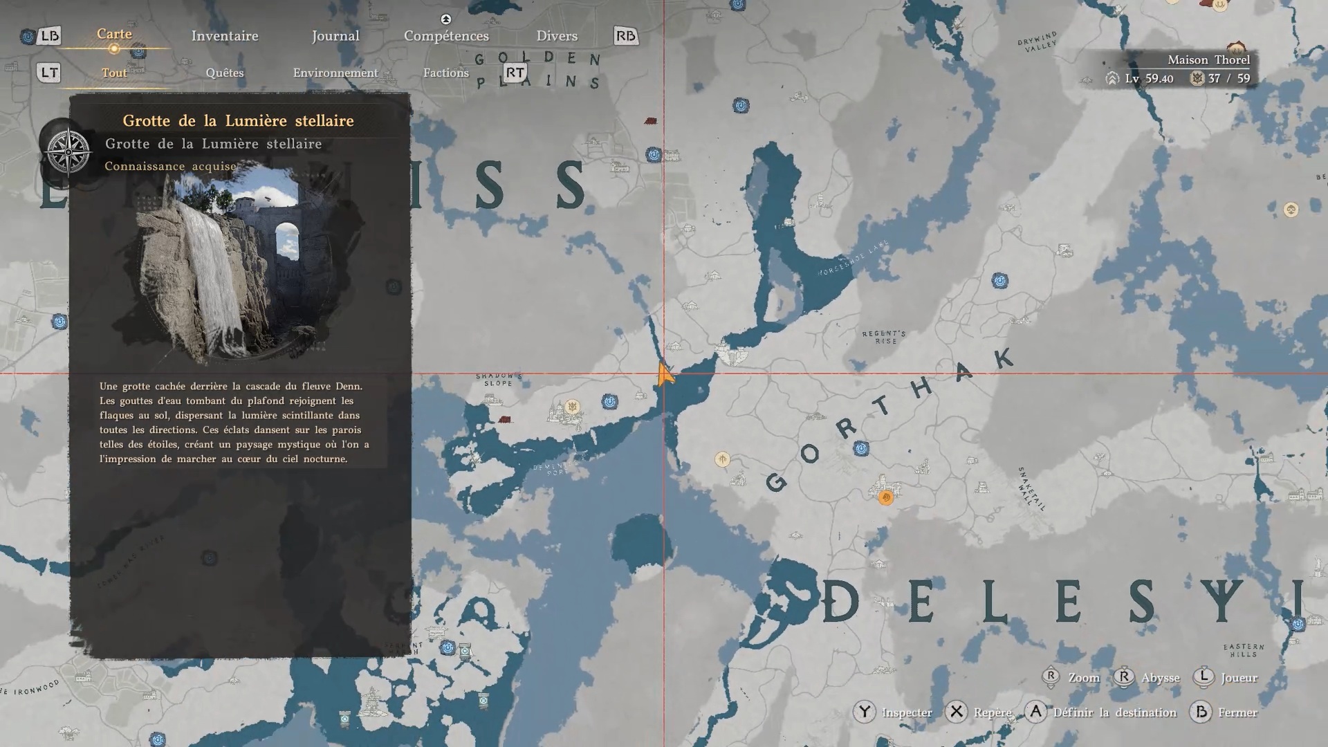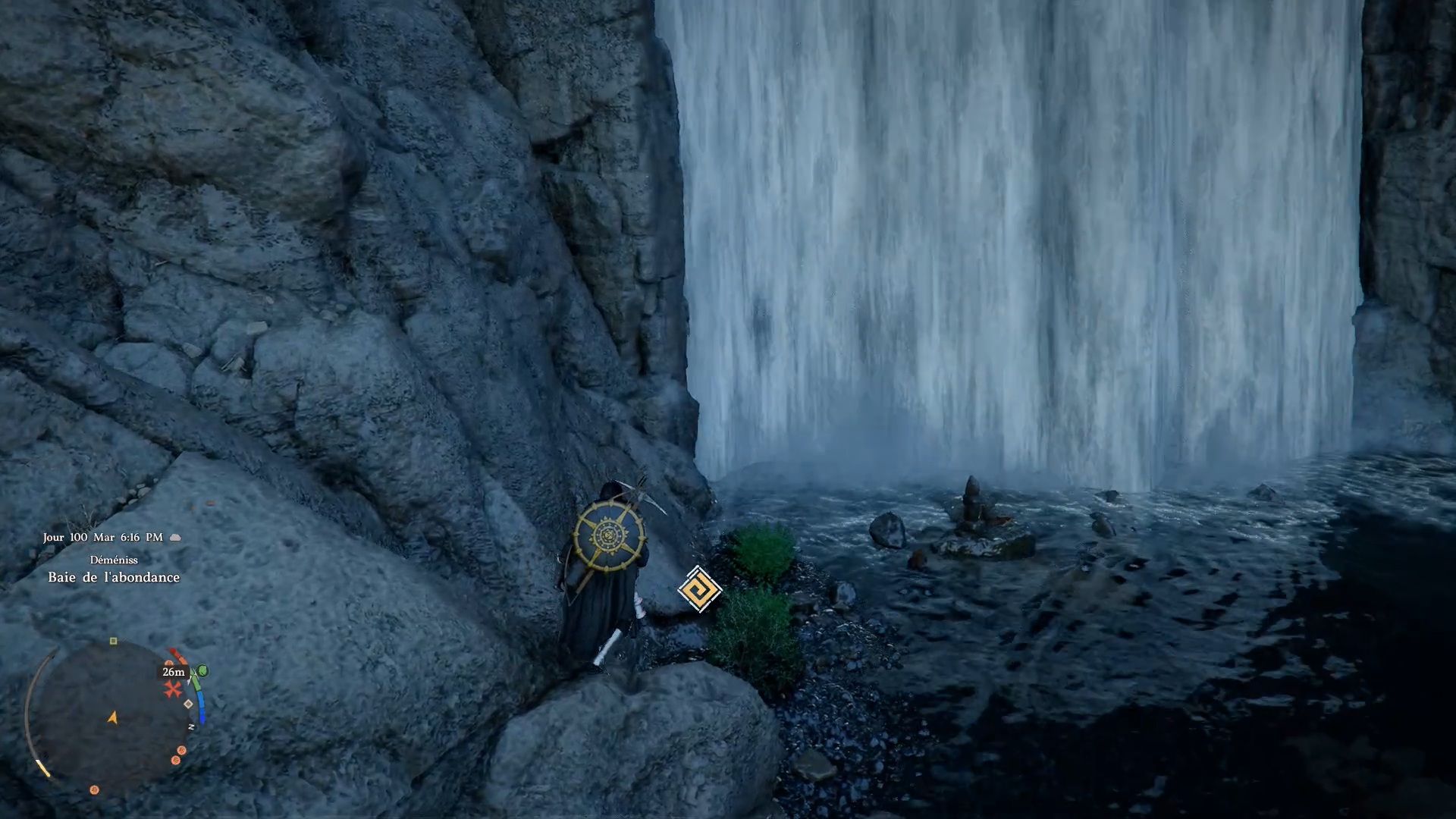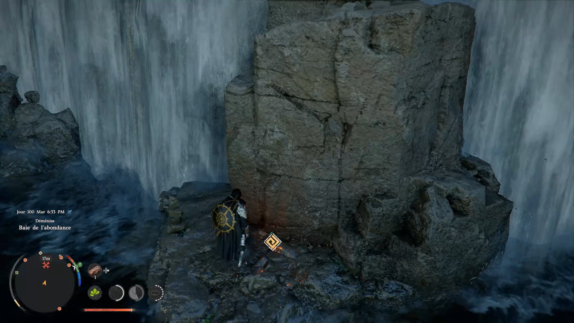 La cape en cuir du Vagabond de la foi se situe derrière une cascade au sud-est de la région « Demeniss », à l’ouest de la porte de « Demeniss ». À cet emplacement, vous trouverez plusieurs cascades : dirigez-vous vers celle de gauche, reconnaissable à une statuette composée de trois pierres à ses pieds. Une fois devant, approchez-vous de l’eau et utilisez la compétence « Perforation » pour traverser le mur d’eau. Vous accéderez alors à une grotte cachée, où se trouve le coffre contenant la cape.