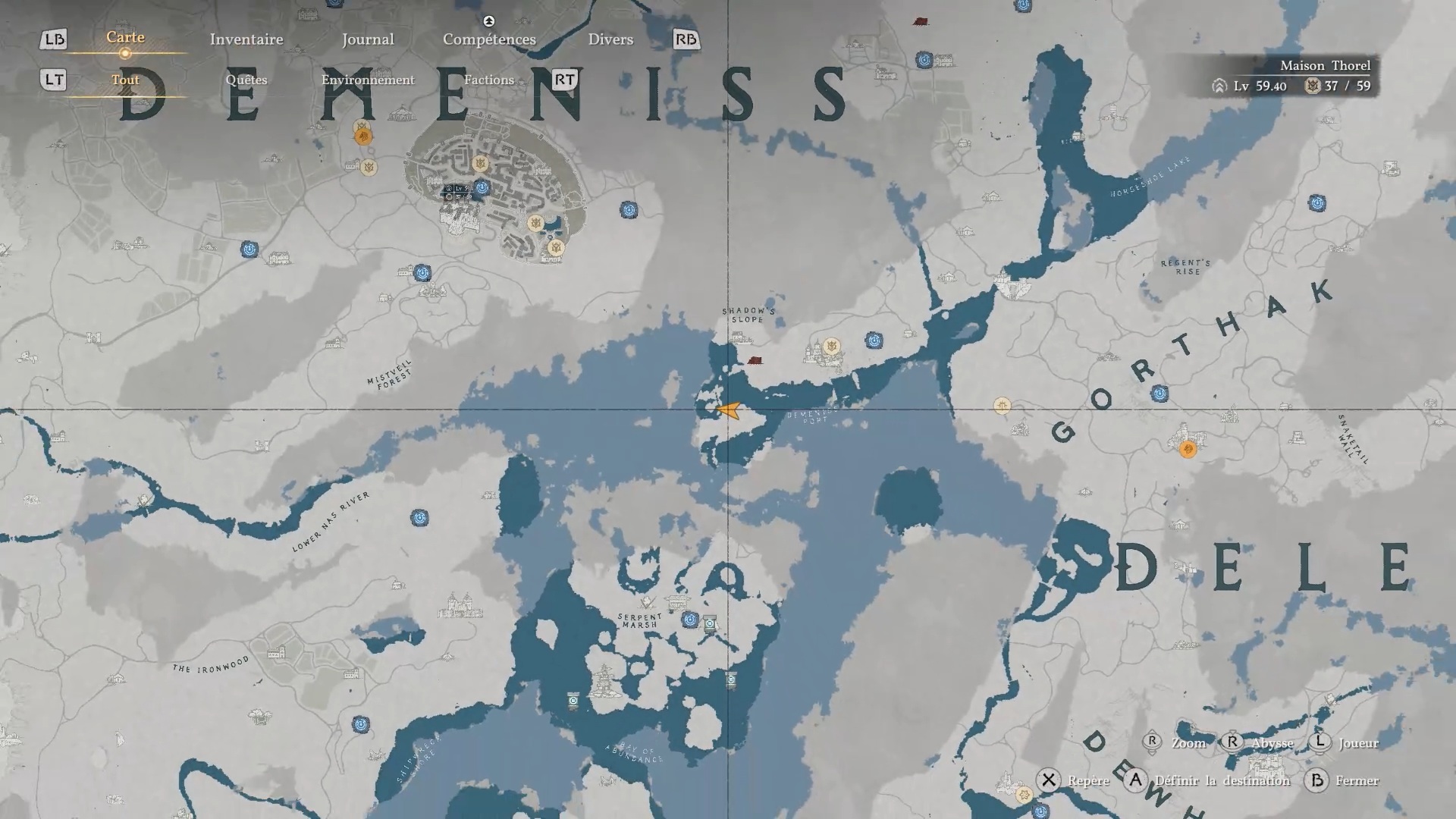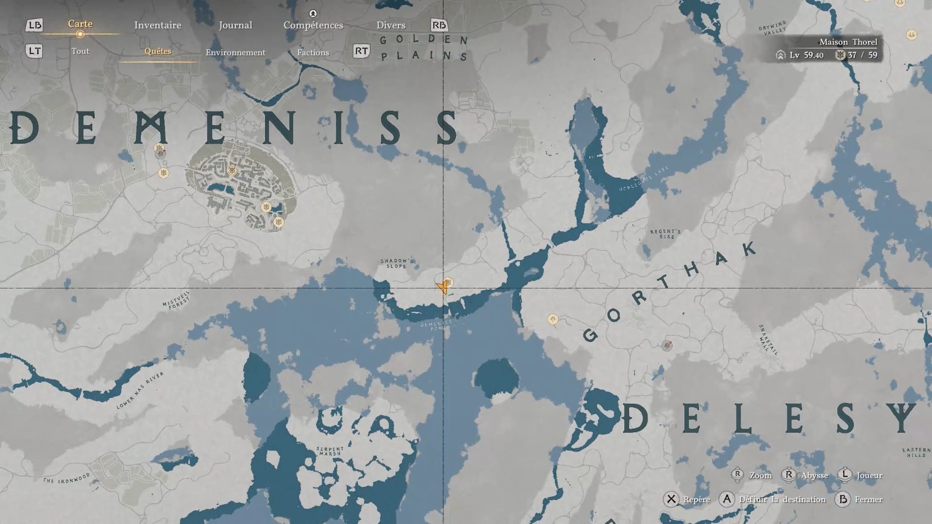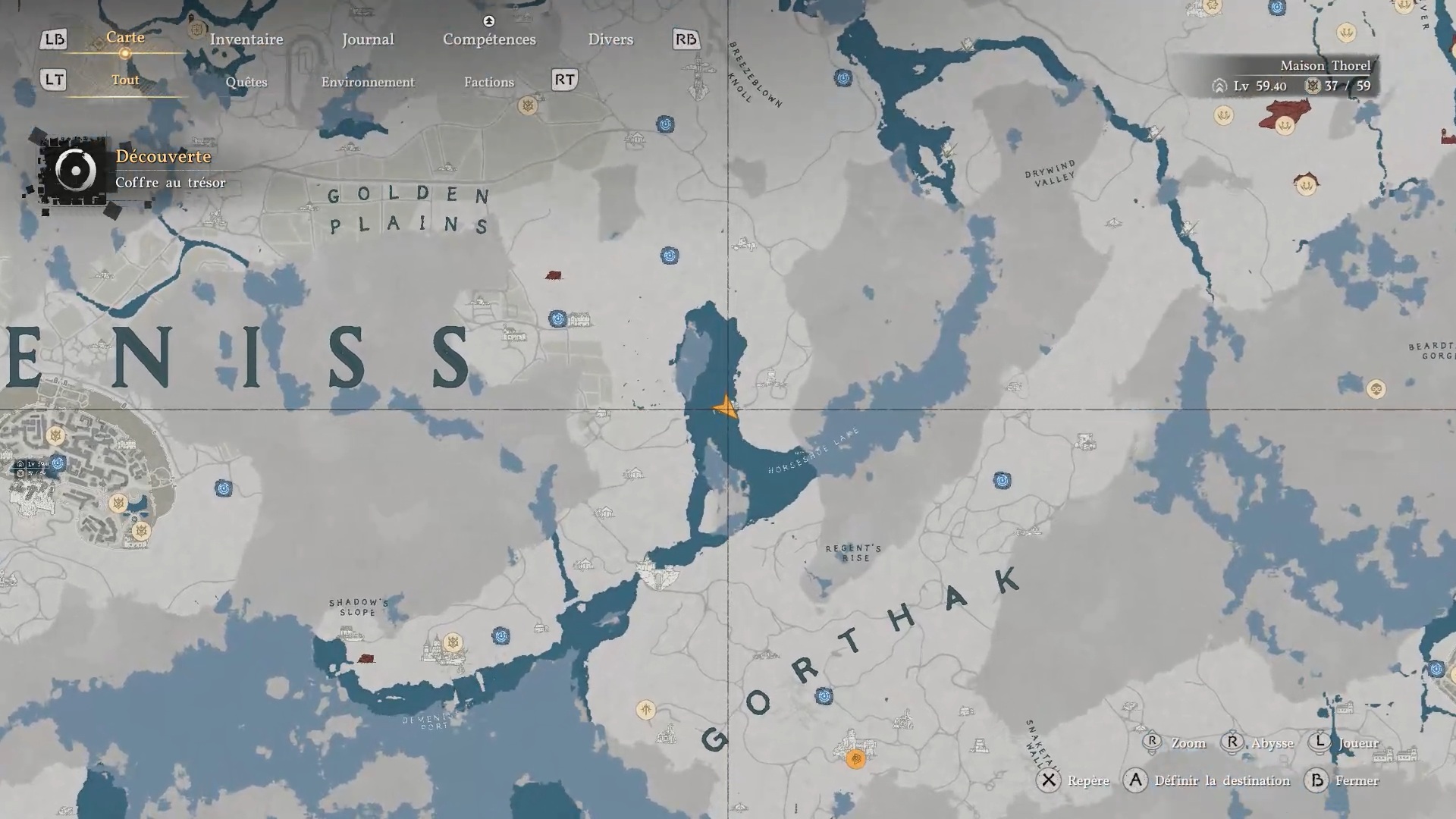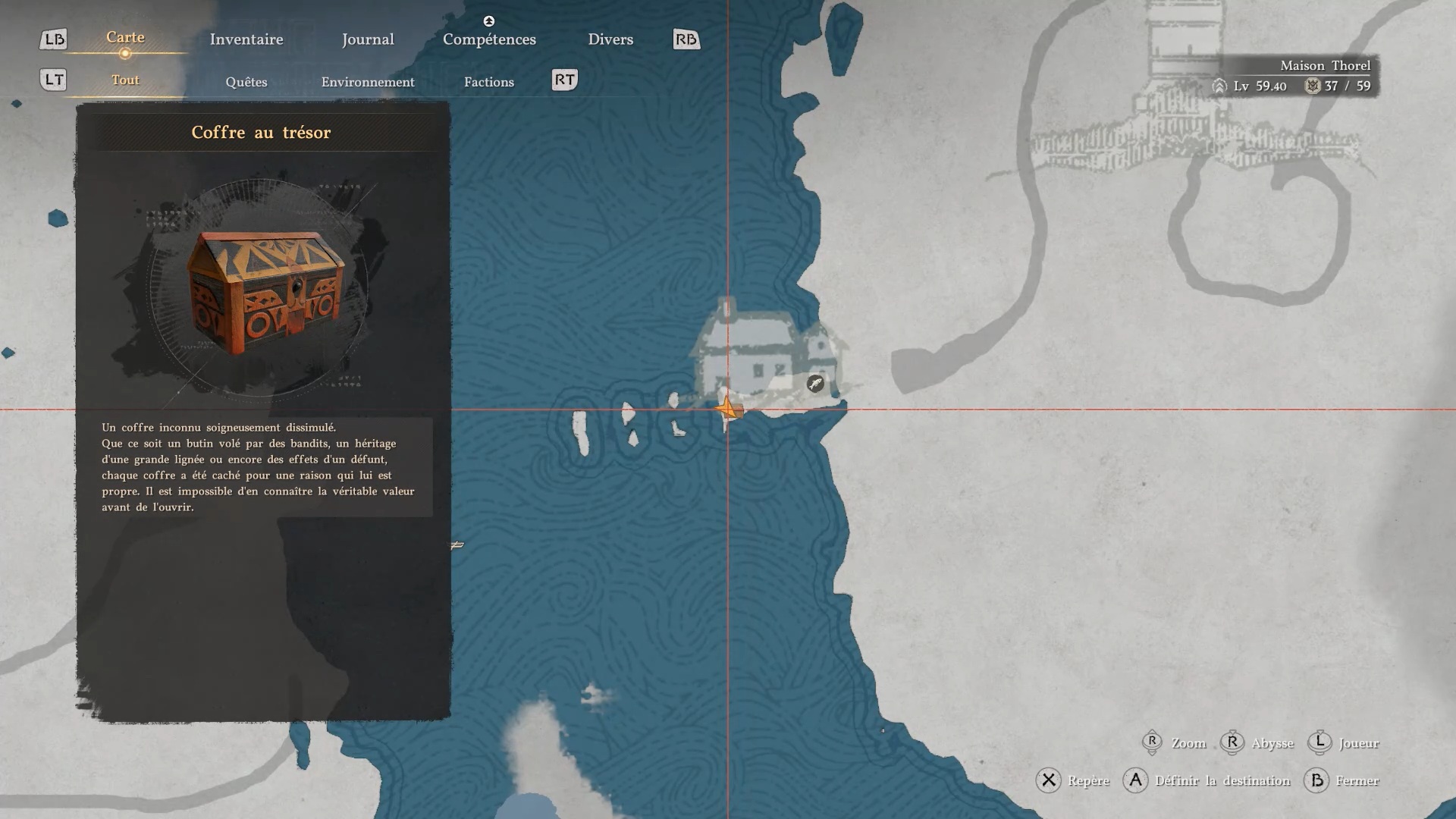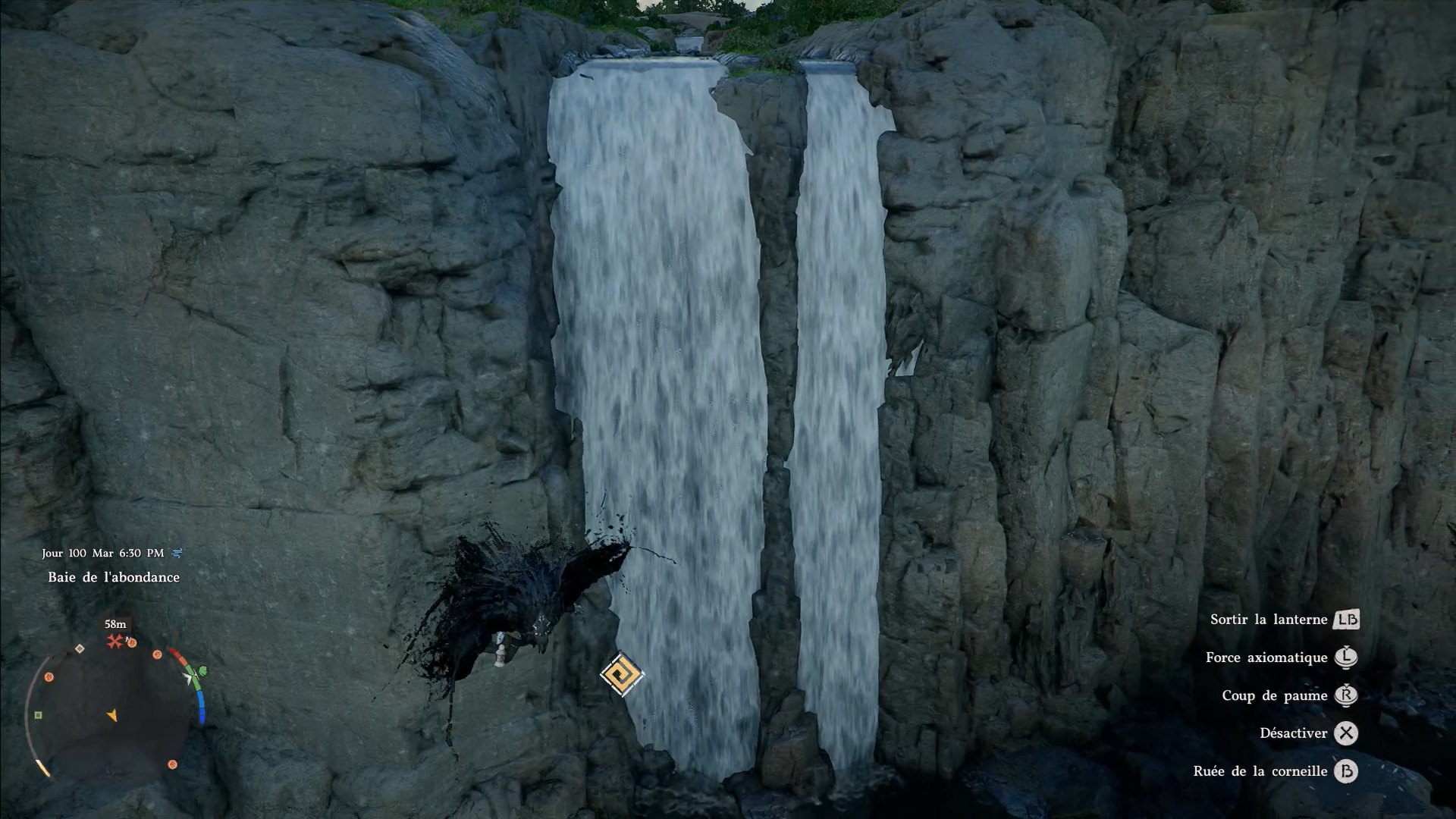 La cape en cuir du Vagabond de la foi se situe derrière une cascade au sud-est de la région « Demeniss », à l’ouest de la porte de « Demeniss ». À cet emplacement, vous trouverez plusieurs cascades : dirigez-vous vers celle de gauche, reconnaissable à une statuette composée de trois pierres à ses pieds. Une fois devant, approchez-vous de l’eau et utilisez la compétence « Perforation » pour traverser le mur d’eau. Vous accéderez alors à une grotte cachée, où se trouve le coffre contenant la cape.