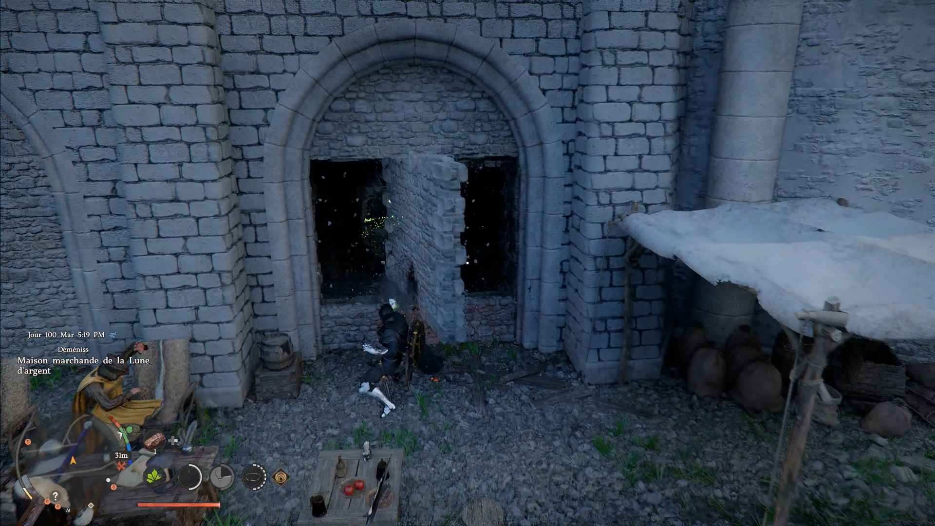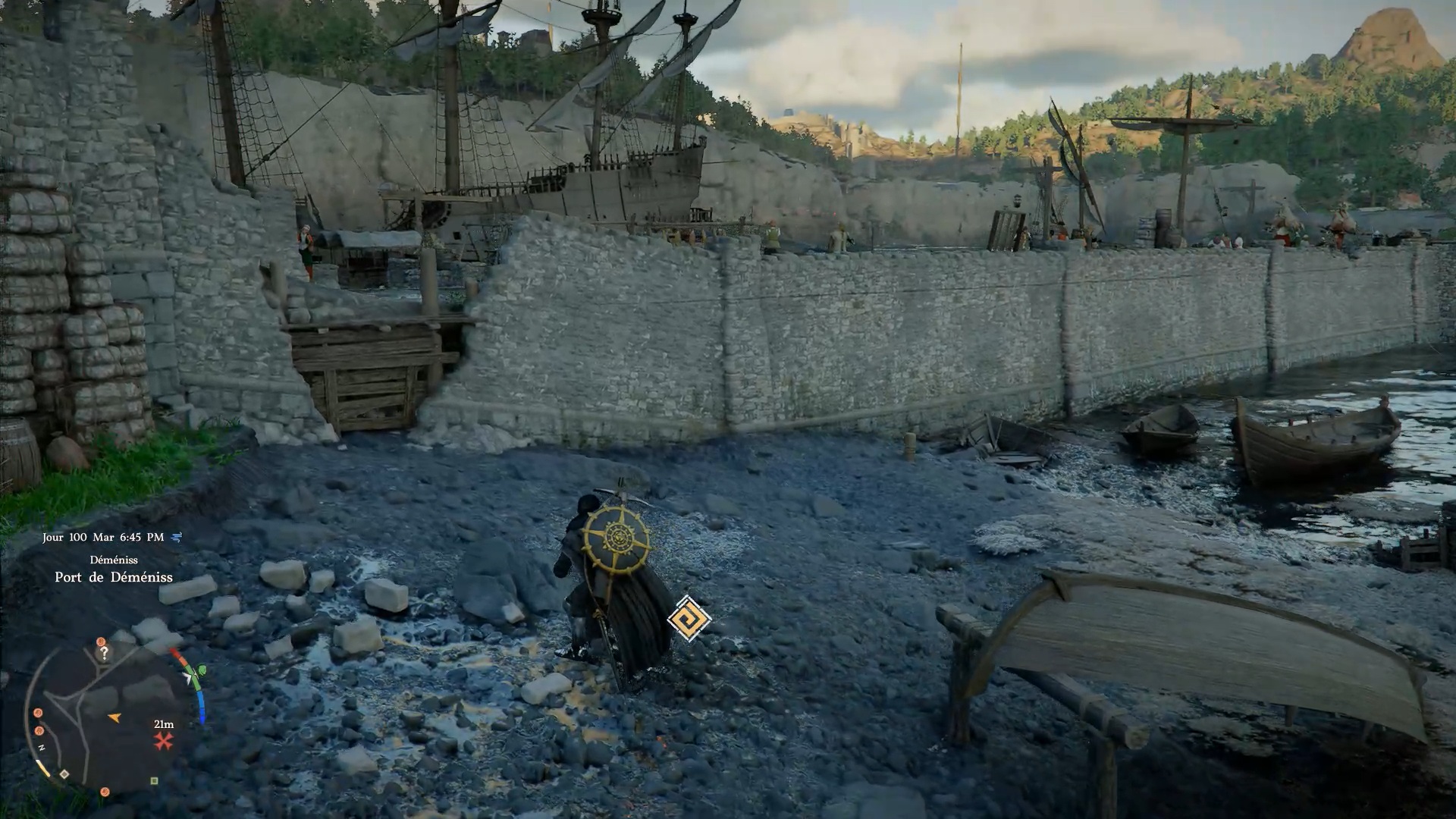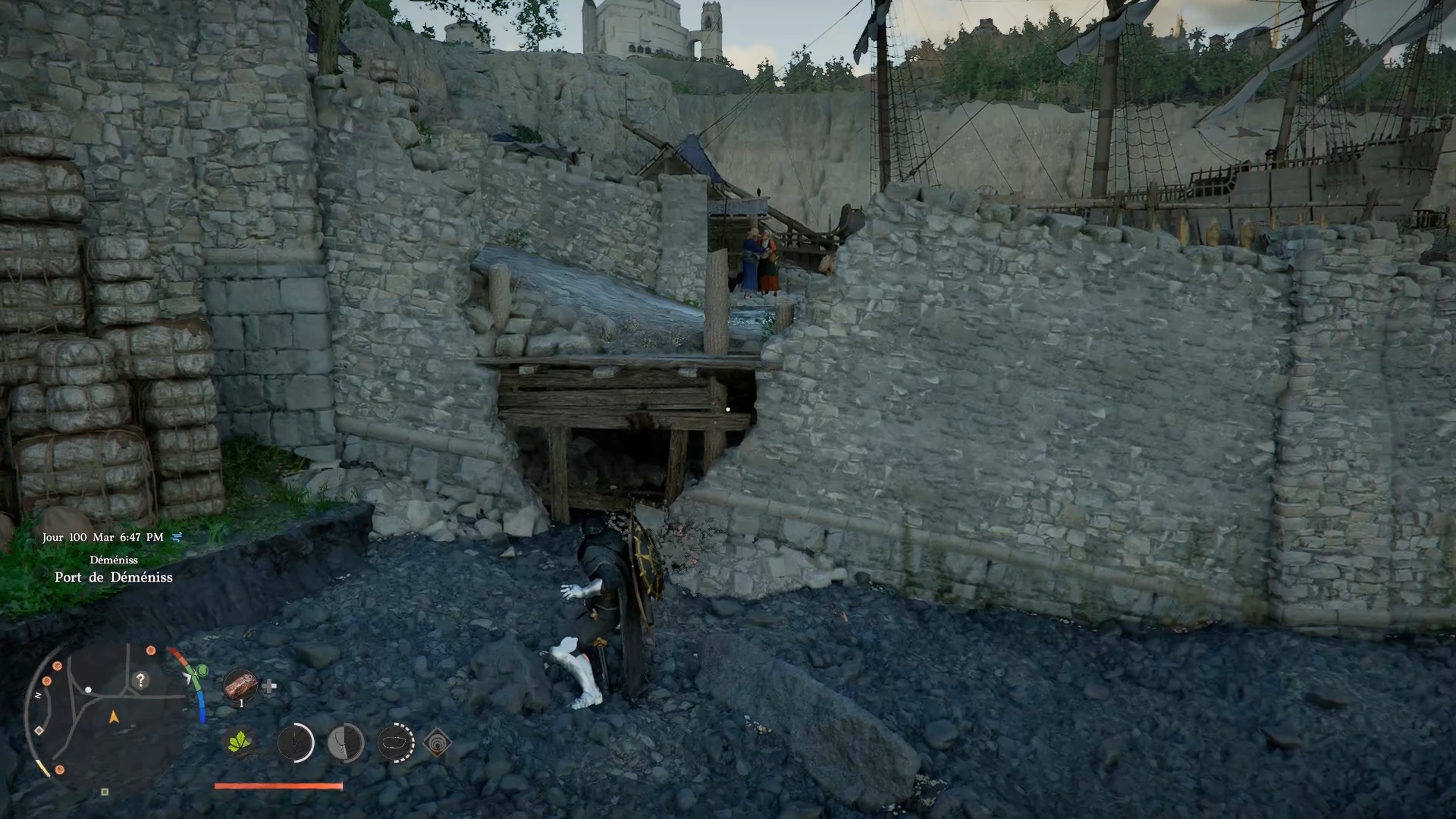 Le heaume de plates du Vagabond de la foi se situe au sud-est de la ville de « Demeniss », dans la zone au sud-ouest du port. À l’emplacement indiqué, près d’une barque échouée, vous trouverez un passage secret le long du chemin dans le mur, barricadé par des planches en bois. Utilisez un « coup de paume » pour briser les planches et accéder au coffre contenant le heaume.