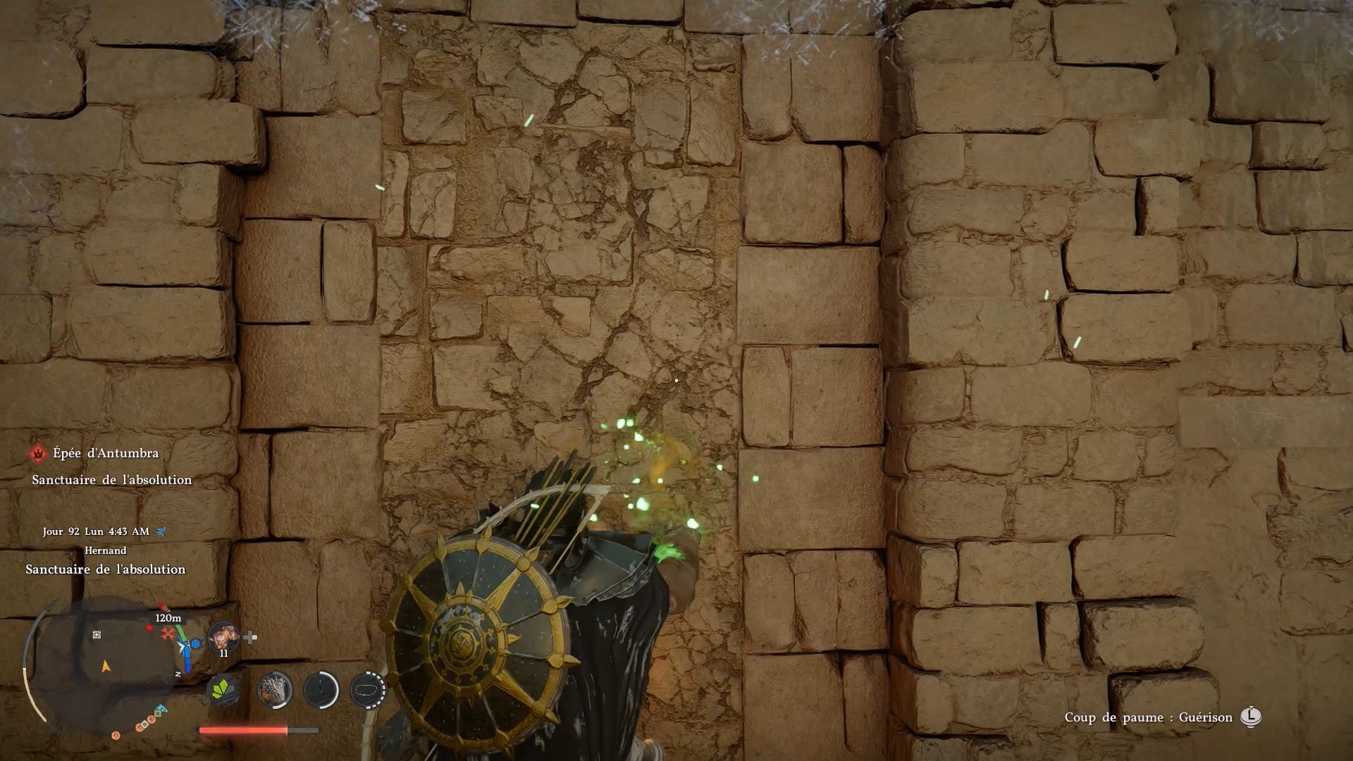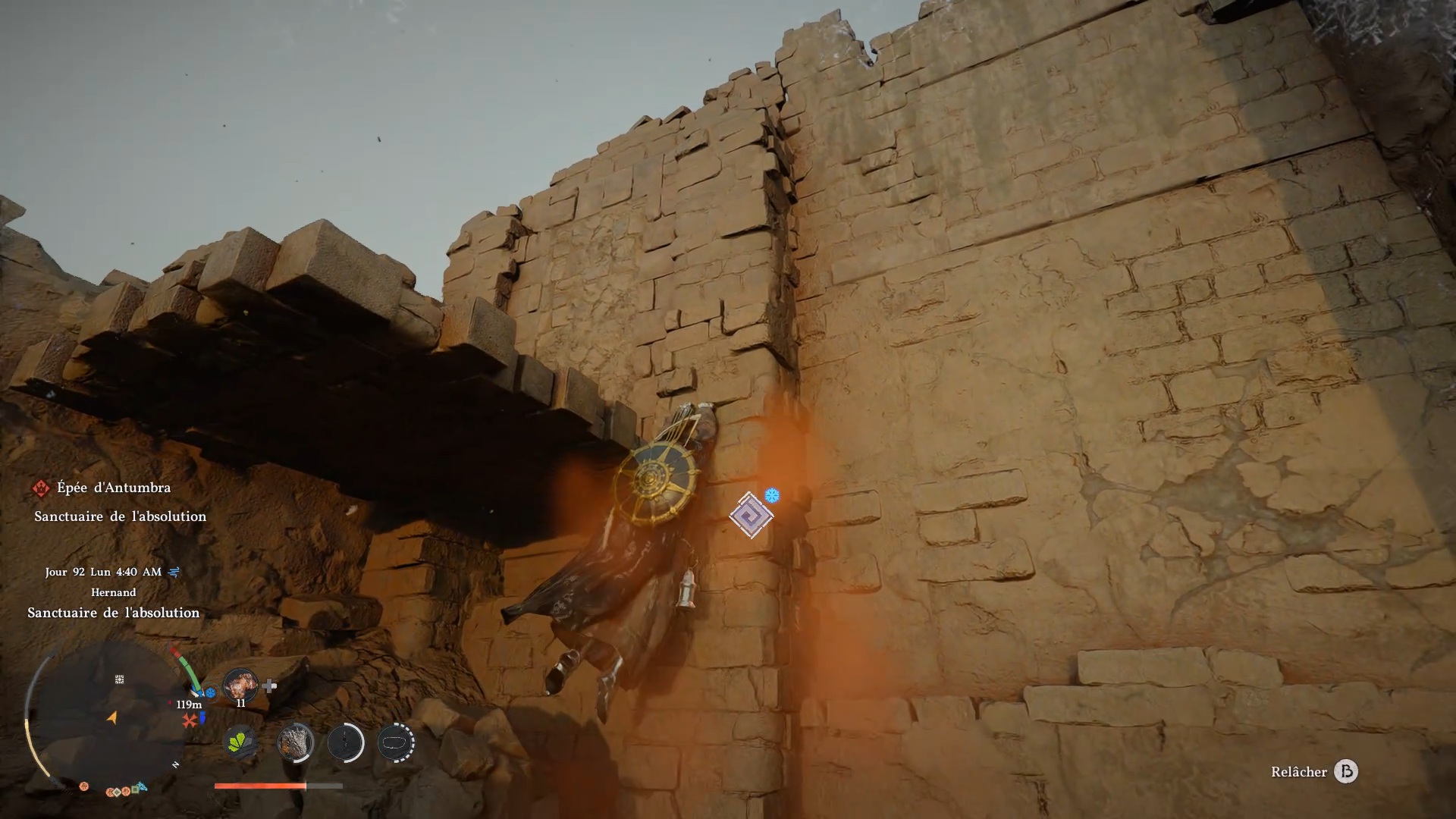 Les chaussures en tissu des Roseaux du Couchant se situent dans un coffre au Sanctuaire de l’Absolution, à l’ouest de « Steel Mountain », dans le sud de la carte. Une fois au sanctuaire, dirigez-vous vers le sud-est de celui-ci pour trouver une façade de pierre (voir image). Sur le côté gauche du mur, vous verrez un renfoncement mural entre deux piliers de briques. Placez-vous sur la partie basse et sautez pour faire apparaître un passage secret. Montez sur la plateforme qui vient de sortir et utilisez « Coup de paume » pour créer un effet de balancier, ce qui vous permettra d’entrer dans le passage menant au coffre.
