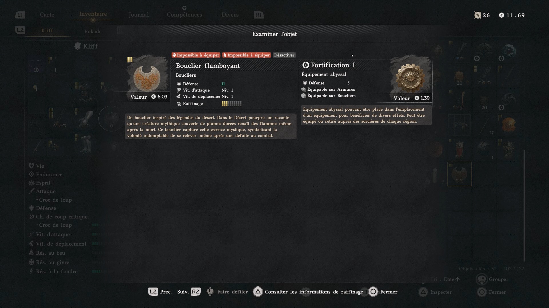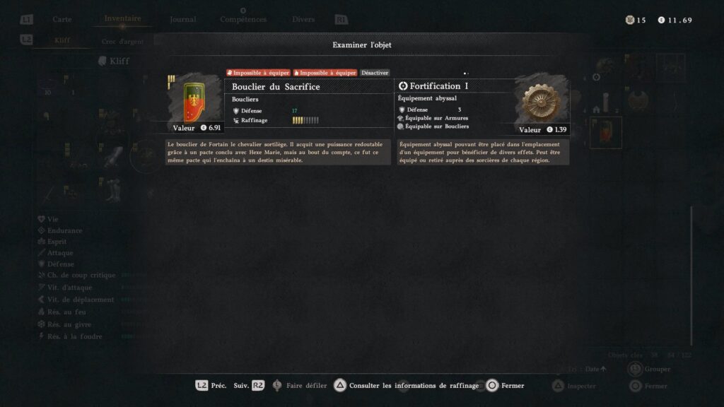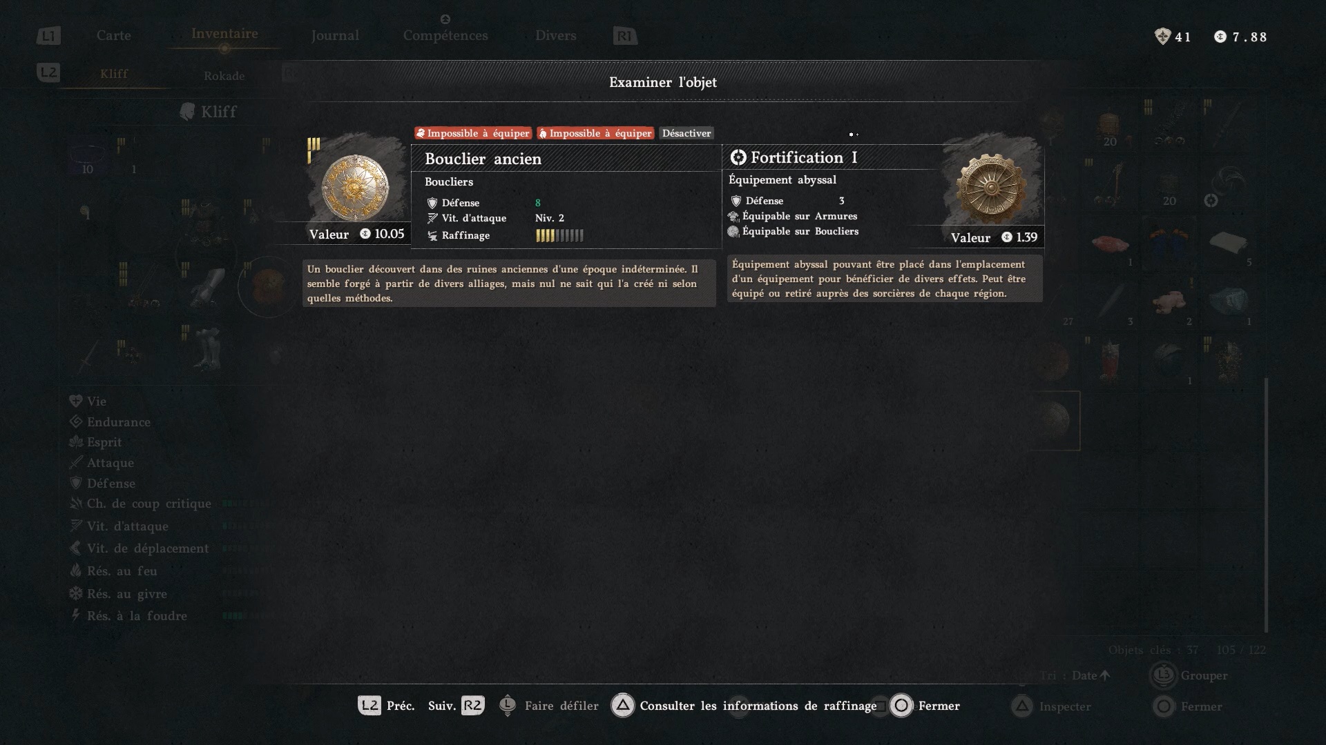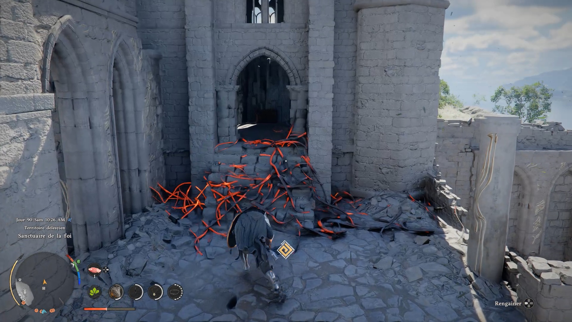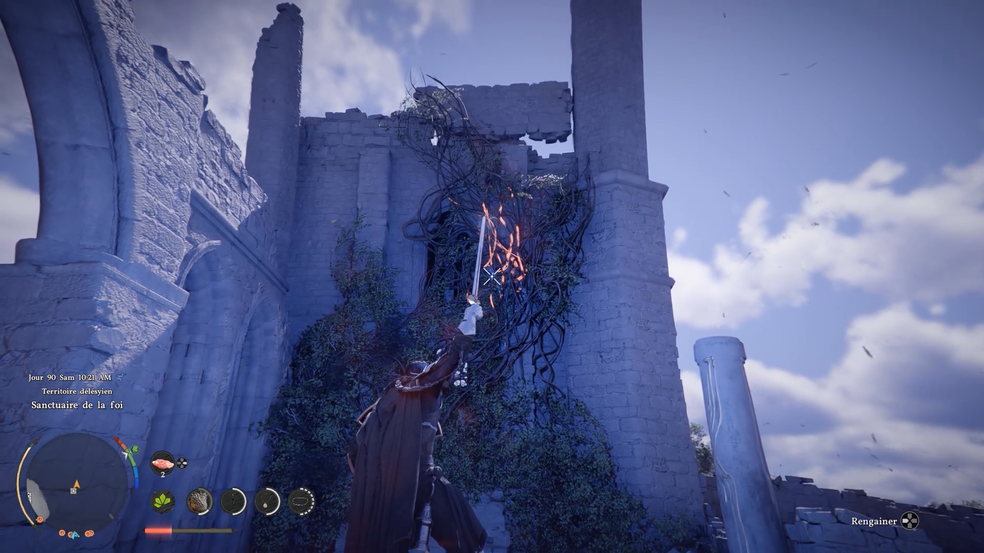 Le bouclier ancien se situe au « Sanctuaire de la Foi », au sud-est de « Delesyia ». Pour le récupérer, commencez par éliminer les ennemis de la zone. Ensuite, au point indiqué, faites face à une façade recouverte de ronces. Utilisez la compétence « collecte de lumière » pour brûler les ronces et ouvrir un passage menant au coffre contenant le bouclier ancien.