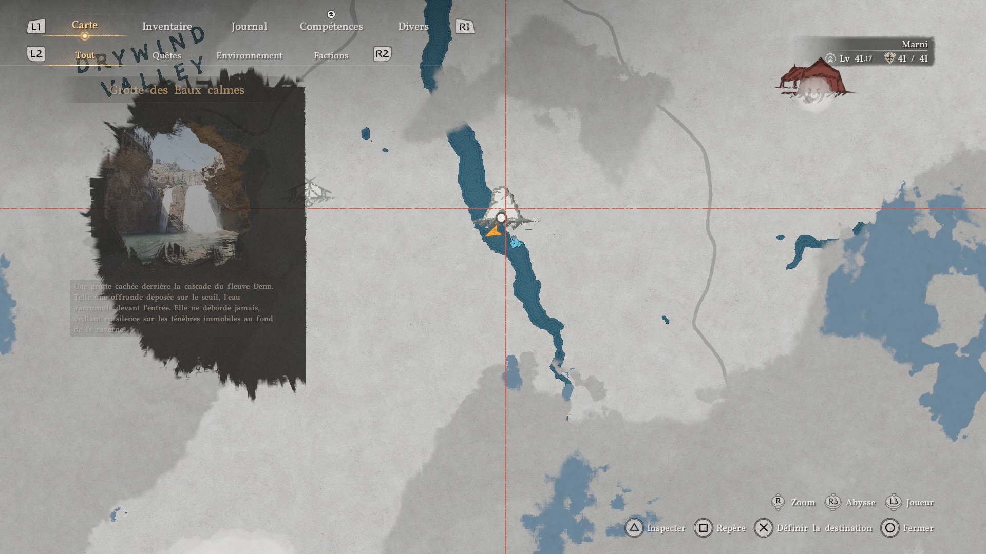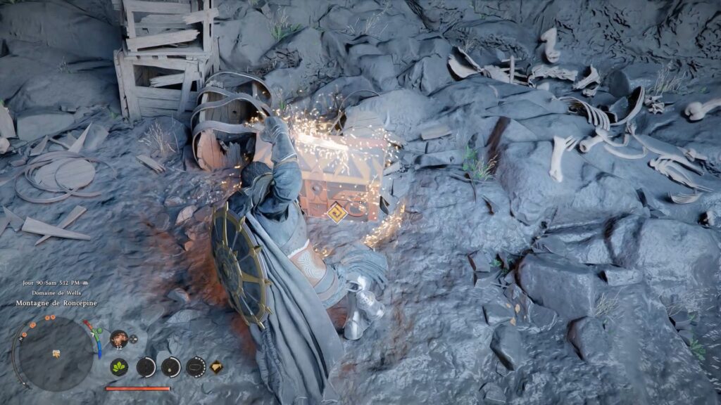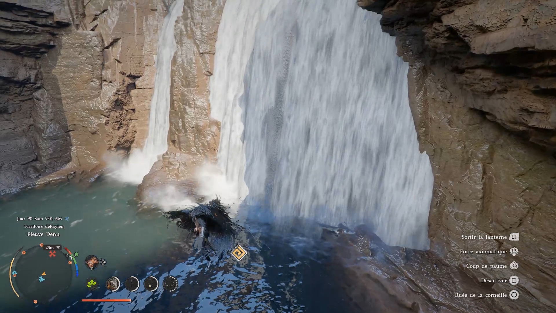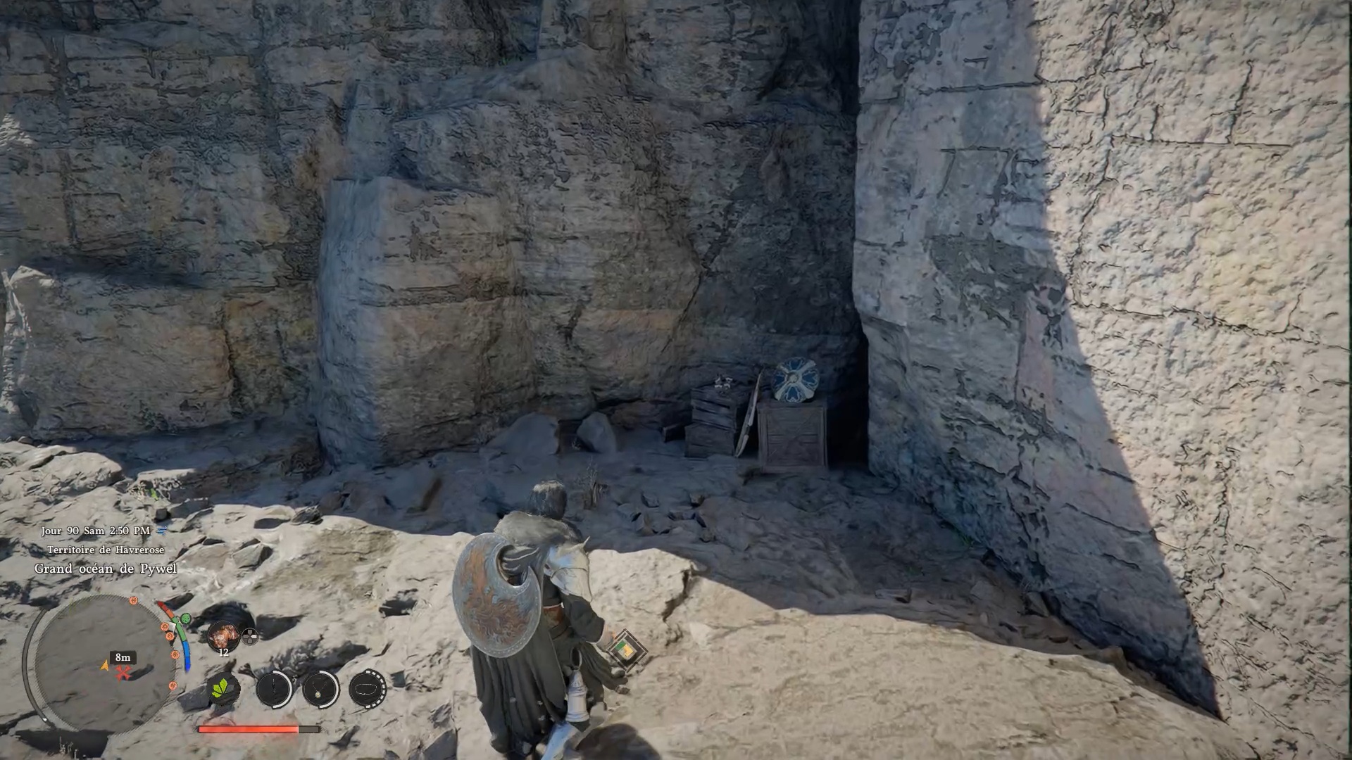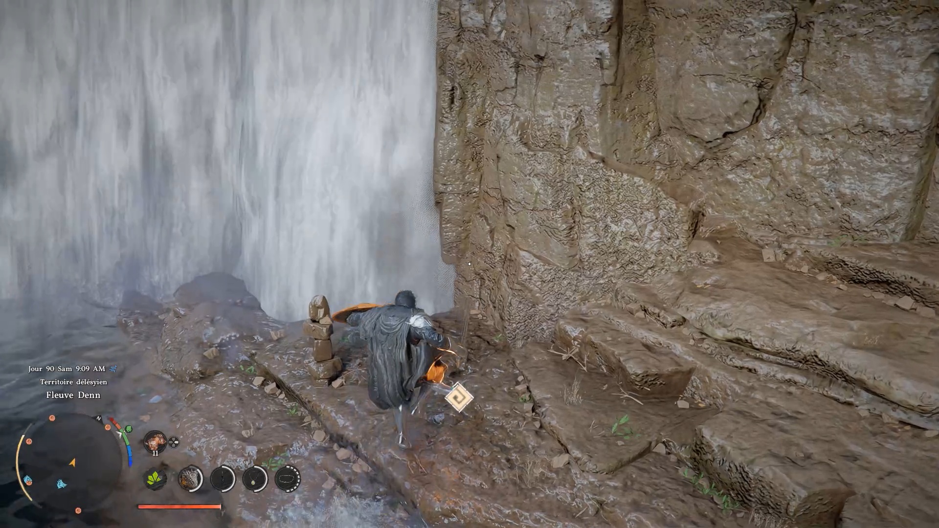 À cet emplacement, vous trouverez deux cascades : dirigez-vous vers celle de droite, près d’une statuette de pierre. Une fois devant, approchez-vous de l’eau et utilisez la compétence « Perforation » pour traverser le mur d’eau. Vous accéderez alors à une grotte cachée, où se trouve le coffre contenant le bouclier.