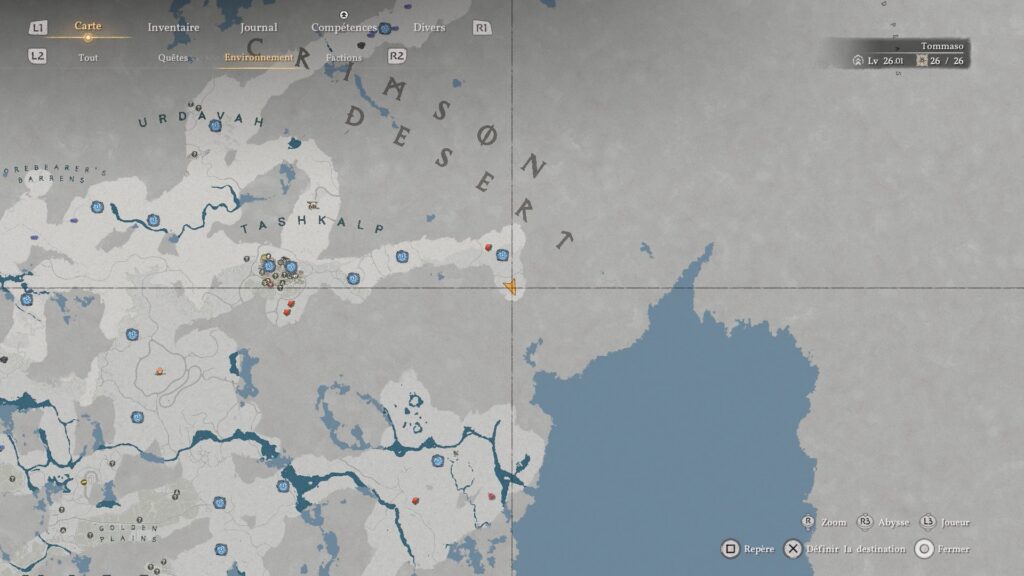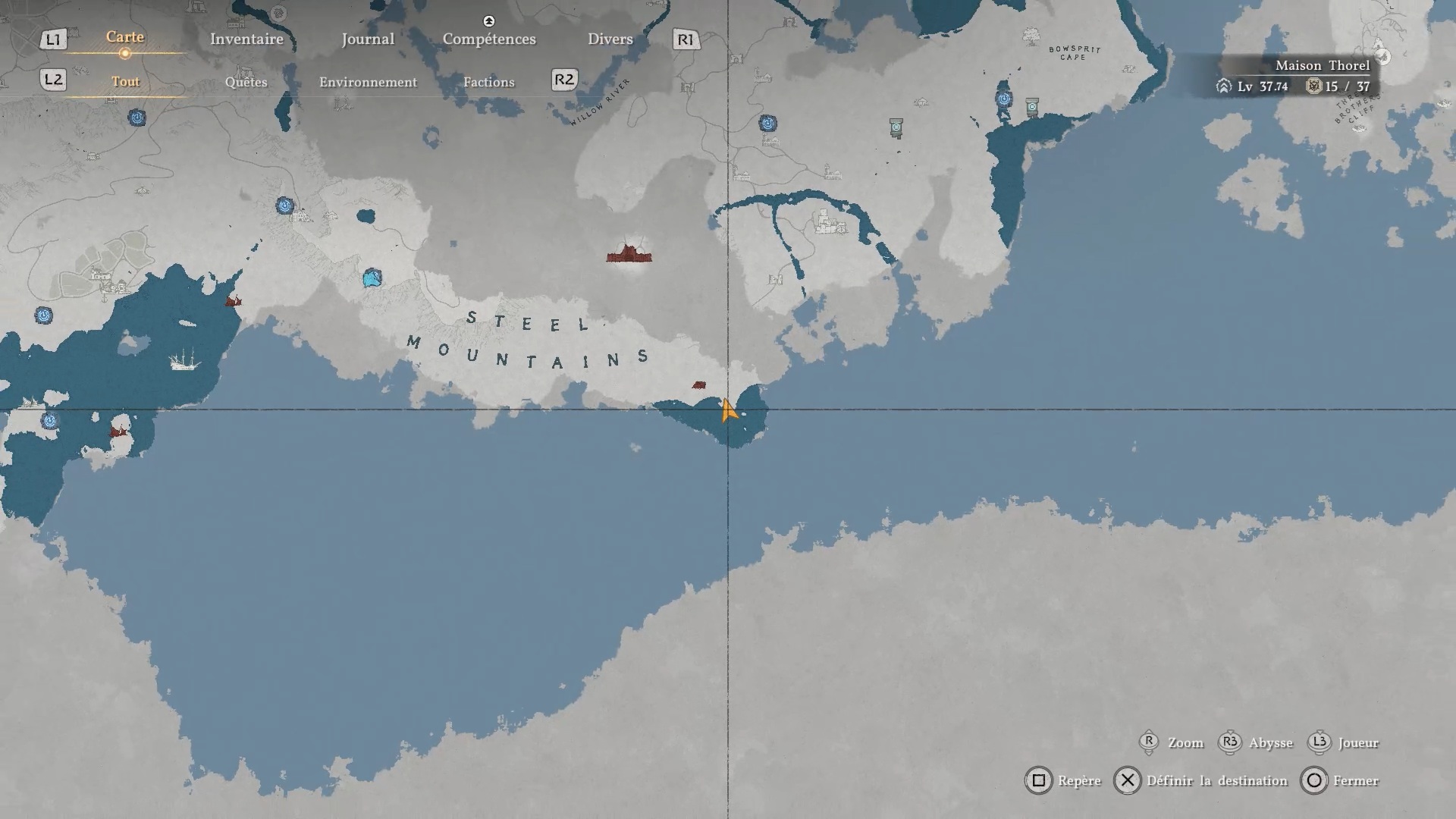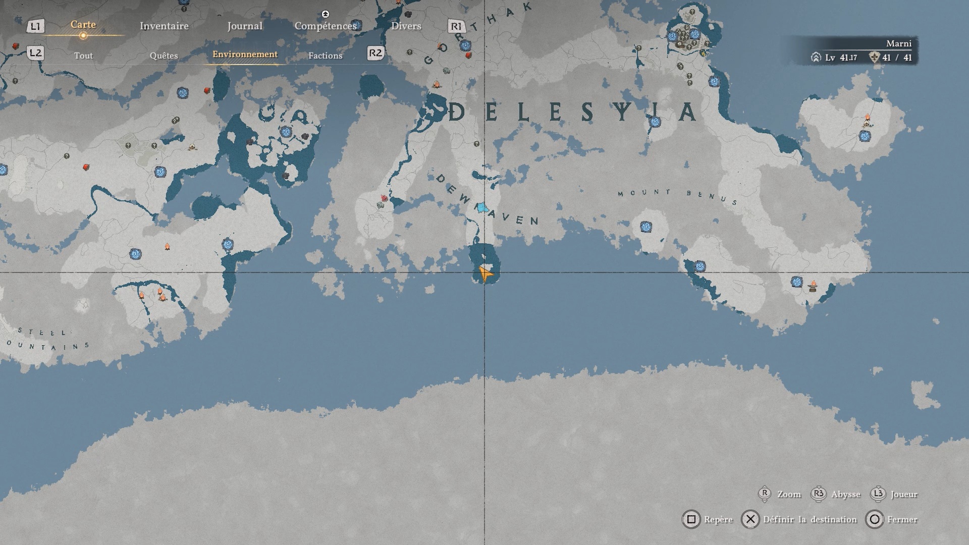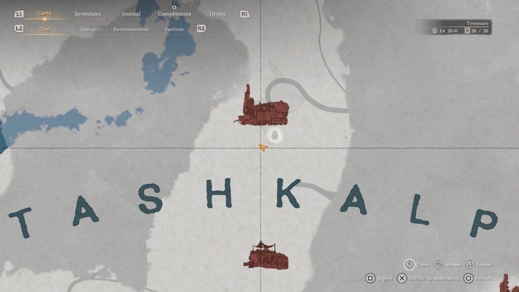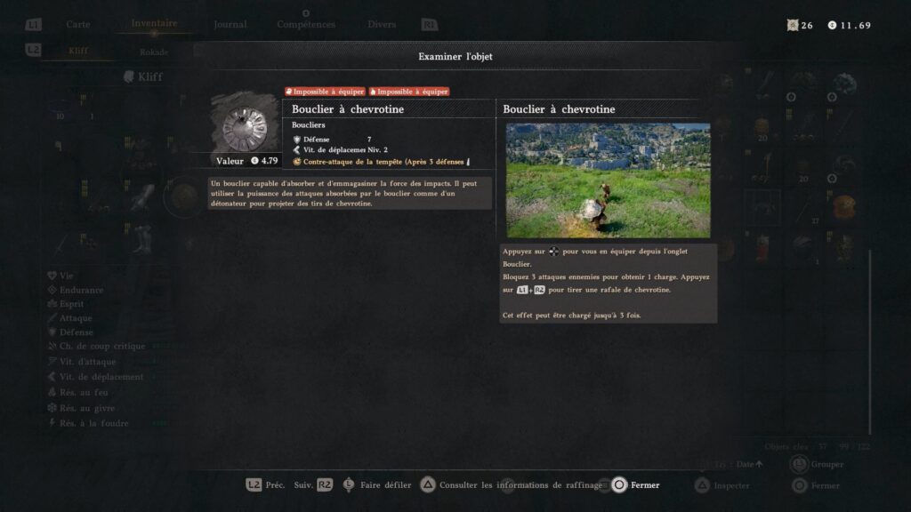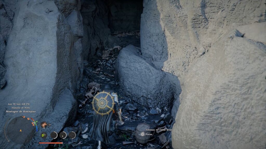 À cet emplacement, vous trouverez deux cascades : dirigez-vous vers celle de droite, près d’une statuette de pierre. Une fois devant, approchez-vous de l’eau et utilisez la compétence « Perforation » pour traverser le mur d’eau. Vous accéderez alors à une grotte cachée, où se trouve le coffre contenant le bouclier.